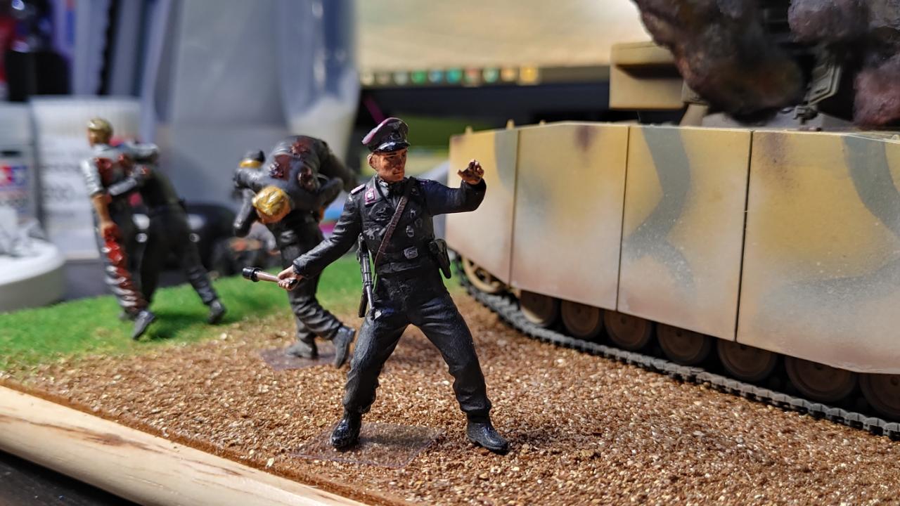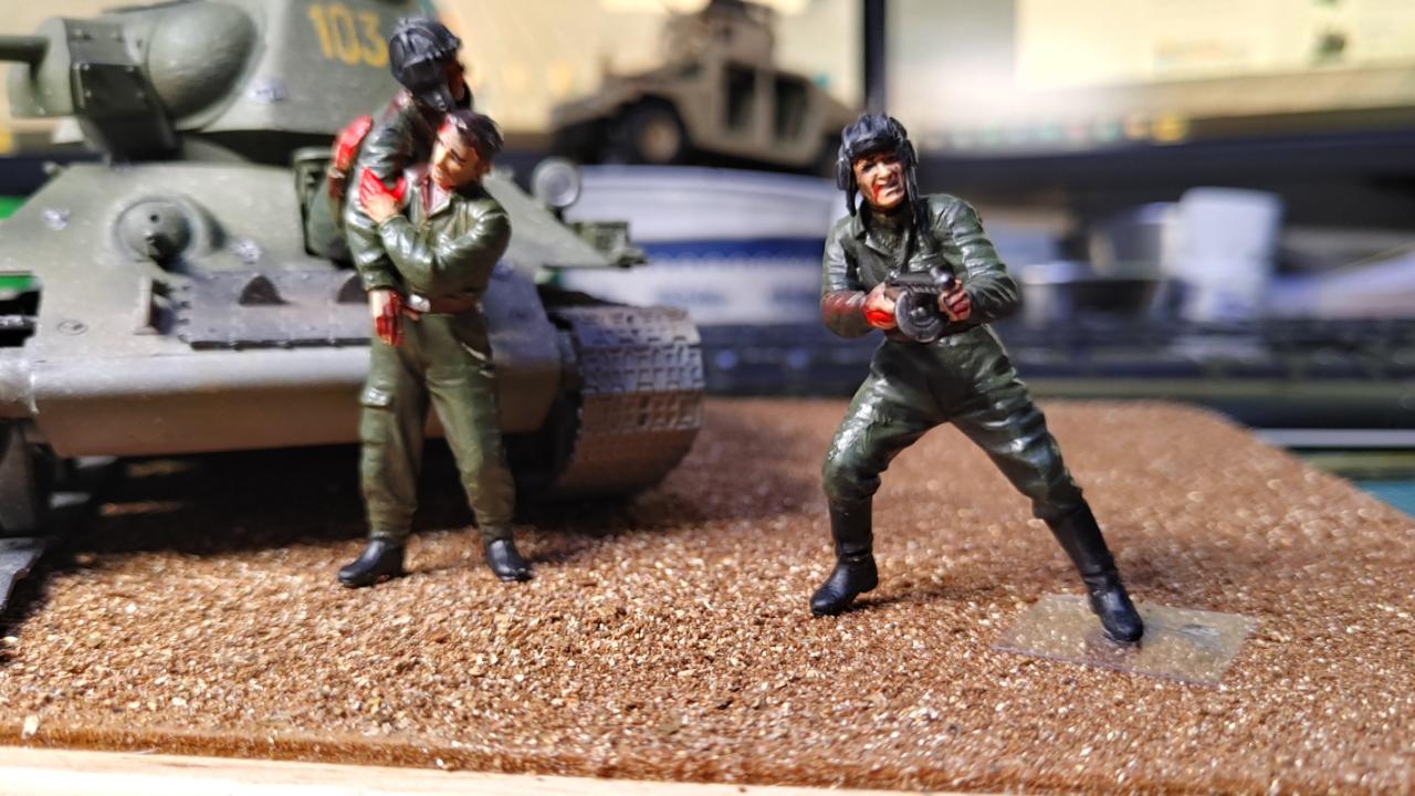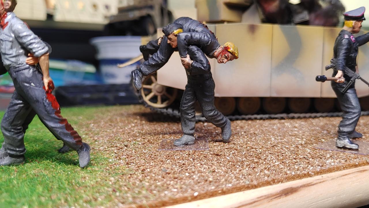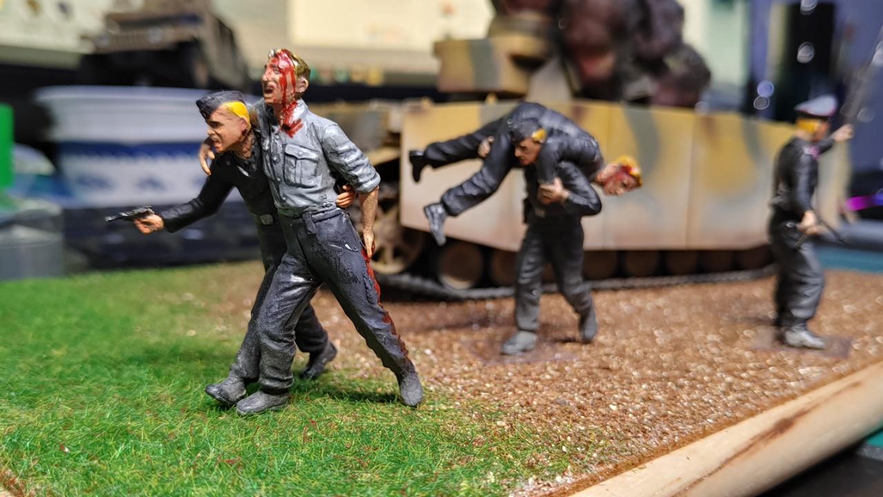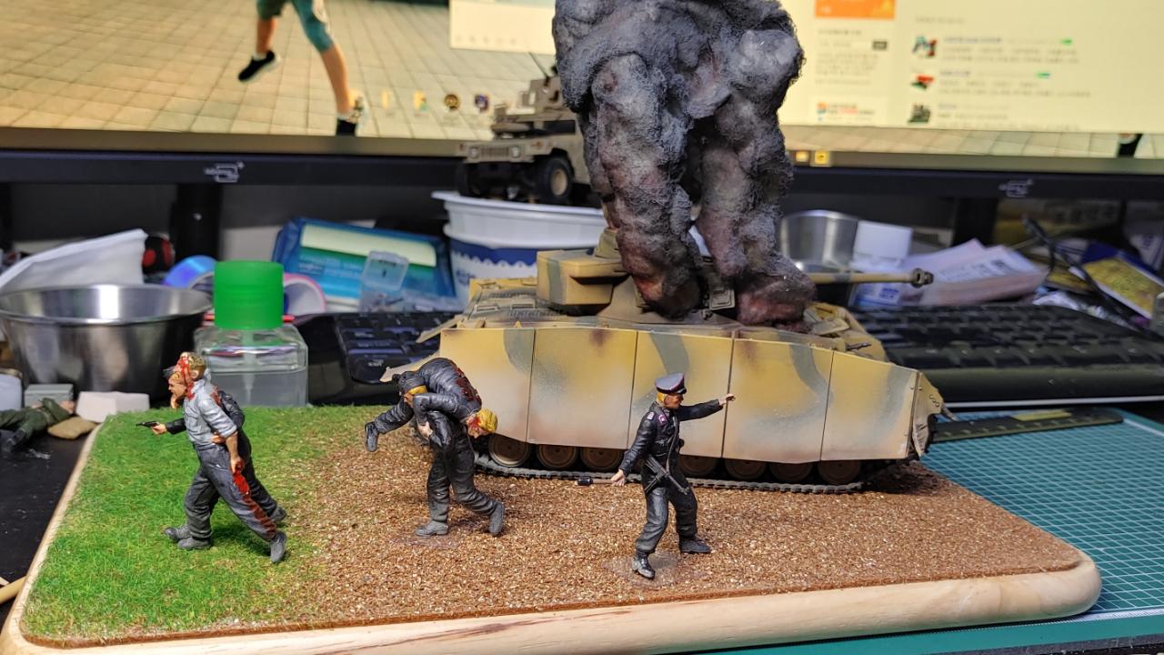 피탄되어 격파된 4호전차가 배경입니다. 전차병들은 이 전차의 전차병일수도, 옆의 다른전차병일수도 있습니다.일단 탈출하여 퇴각중입니다.