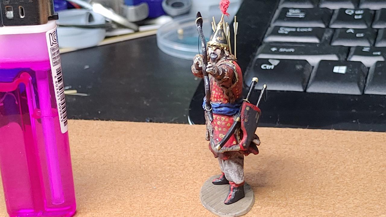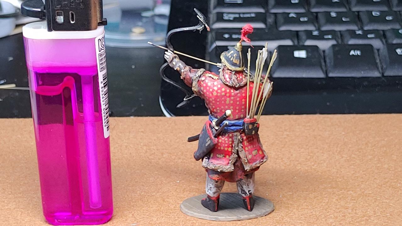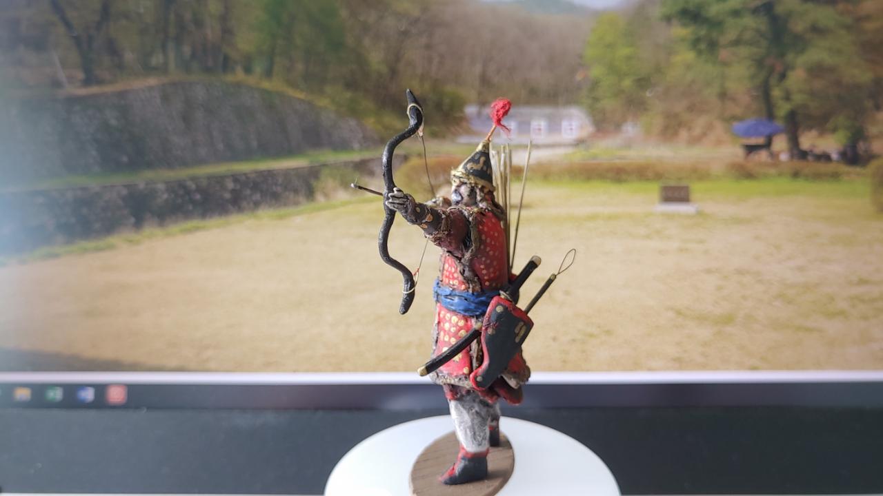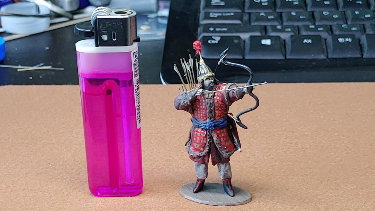 활은 흑각궁으로 빵봉지 등에 쓰이는 코팅철사를 이용해서 모양을 잡고 에폭시로 줌통, 고자등을 추가해 주었습니다...화살은 러너를 일정굵기로 늘여서 만들어주고 깃은 유산지를 이용했습니다...