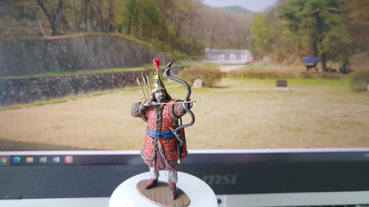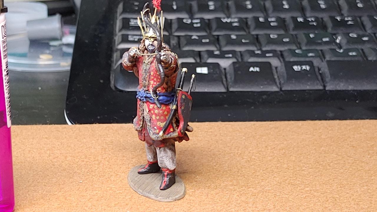 조선후기의 대표적 투구인 간주형 투구를 씌워주었고 두정갑은 종류가 여러종류가 있는데 그중에 비교적 간략화 된 버전으로 설정하였습니다...그래서 다리 보호구가 생략되어 안에 입은 철릭이 보입니다...