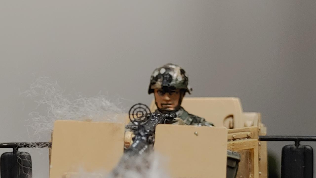 총구의 포연은 탈지면을 적당히 찢어 얹어주었습니다..바닥의 5.56mm 탄피는 0.2mm 황동선을 약 2미리길이로 잘라서 뿌려주었고 50구경 탄피는 0.5mm 황동선을 4미리정도 길이로 잘라 험비 천장과 보닛쪽에 몇개 떨어뜨려주었습니다...