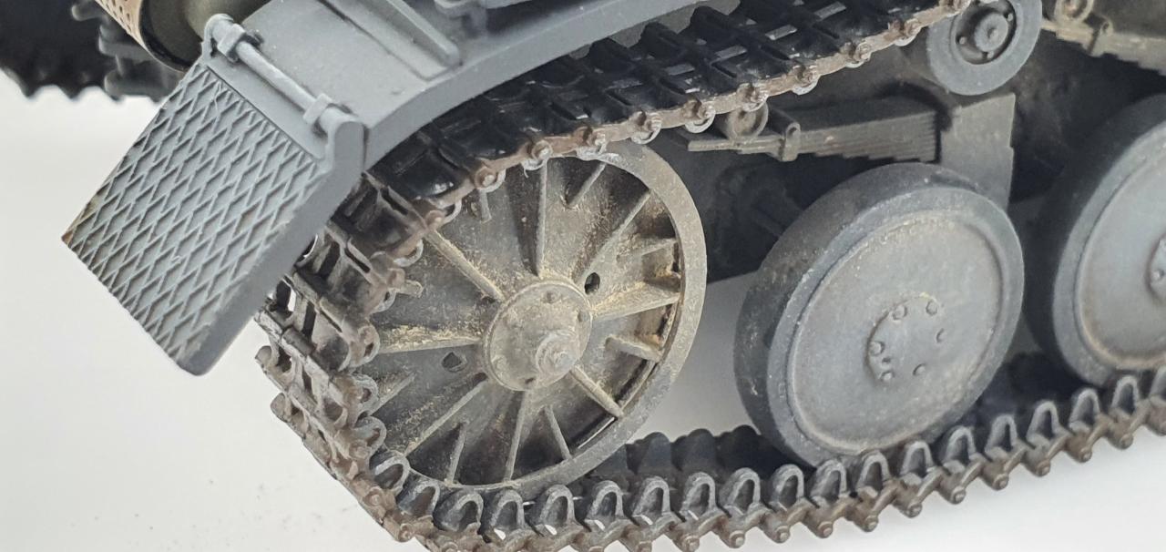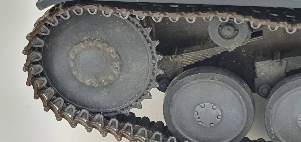 스프로켓의 이빨에는 궤도 마찰 흔적을 표현해봤습니다. 휠들에는 미세하게 피그먼트와 에나멜로 드라이브러싱을 해주었습니다.