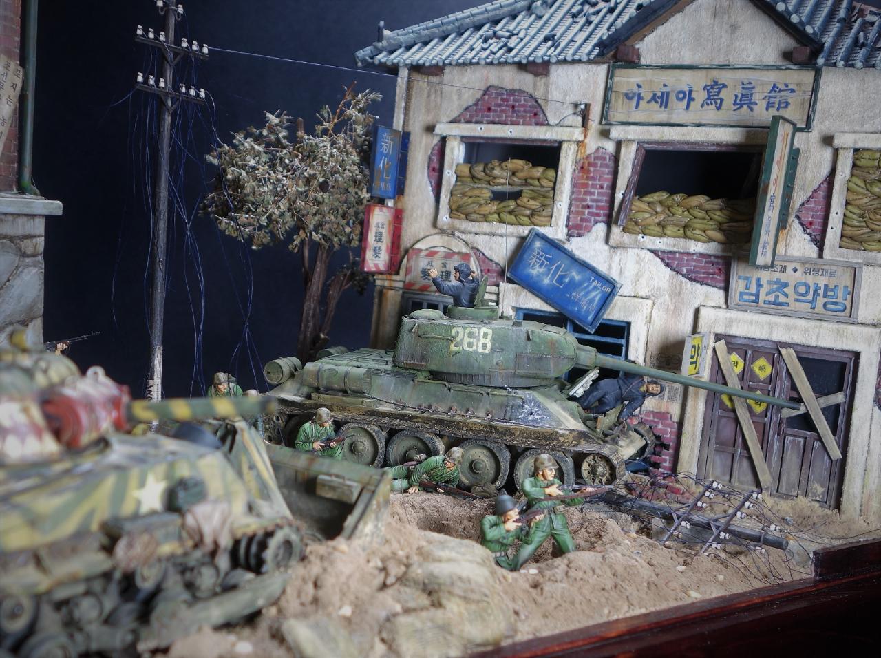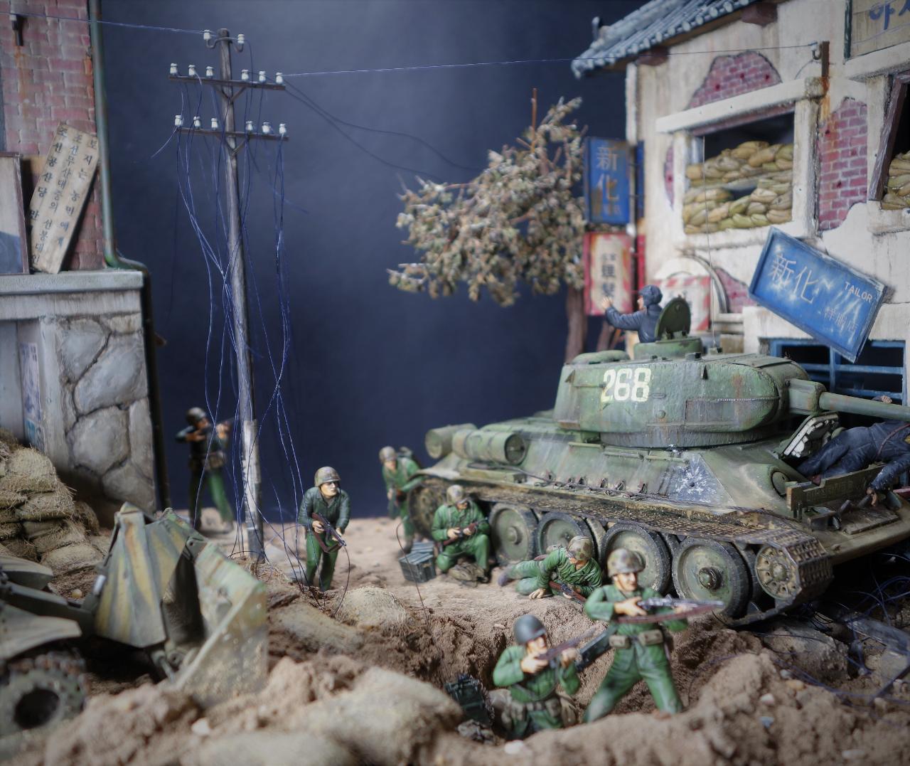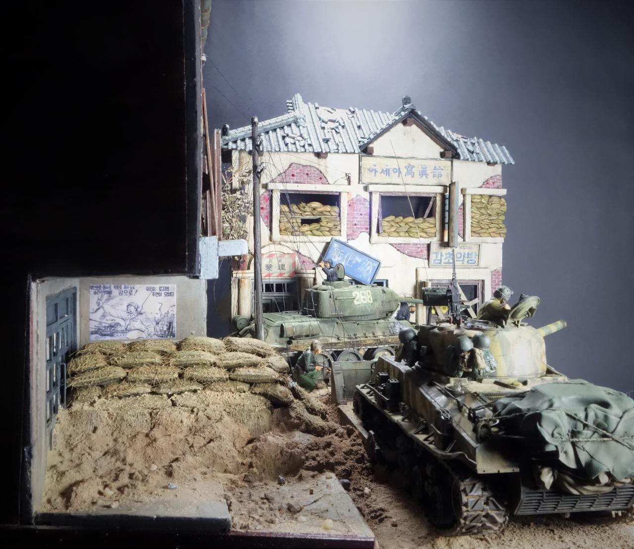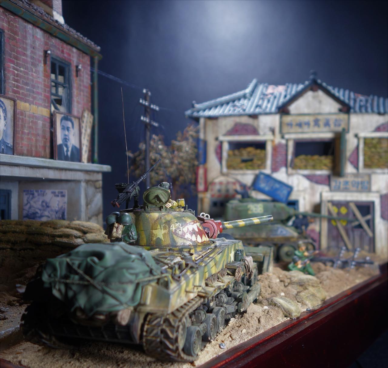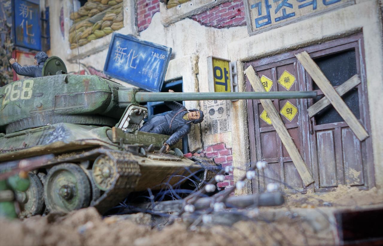 등장하는 M4 셔먼 도져와 T-34/85 모두 아카데미 제품이고, M4 셔먼 도져를 밋밋한 녹색으로 칠하기 보다는 강렬한 이미지를 주기 위하여 호랑이 도색을 해보았습니다. 실제 이 시점에는 유엔군 장비들이 급하게들 투입되느라 이런 도색은 안되었을 같습니다.(고증은 패스..)