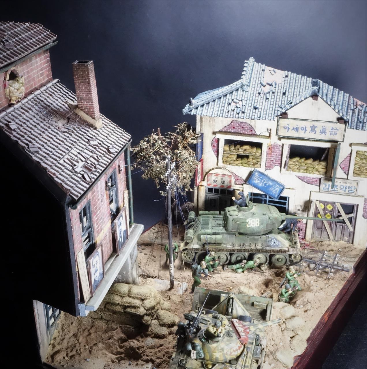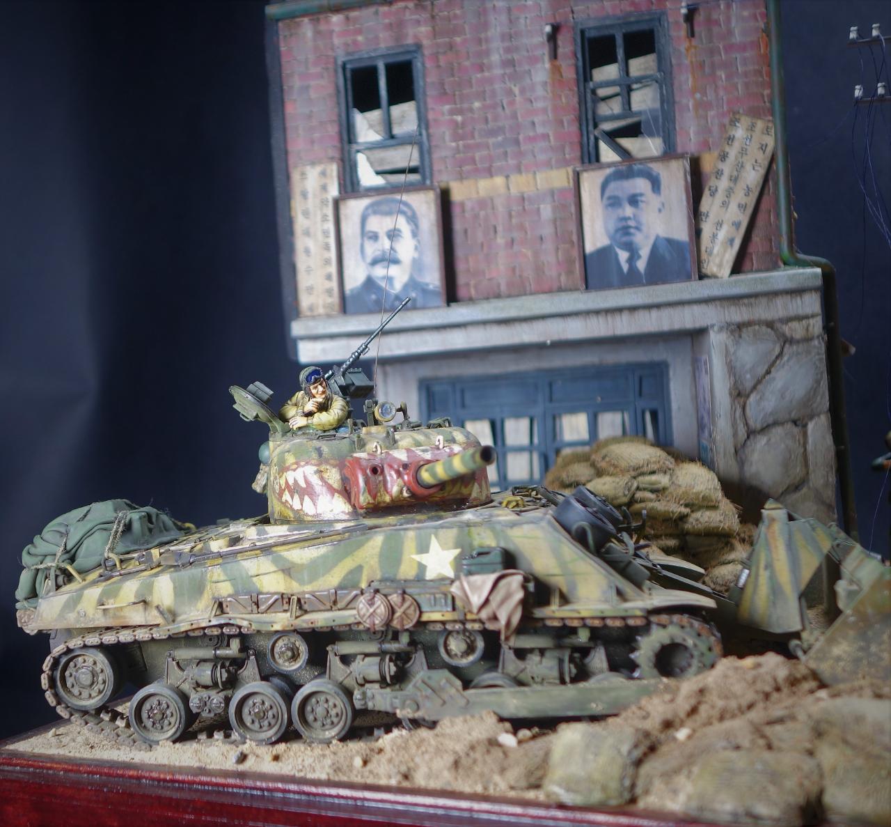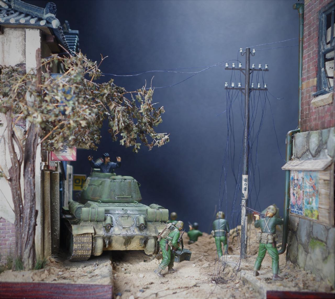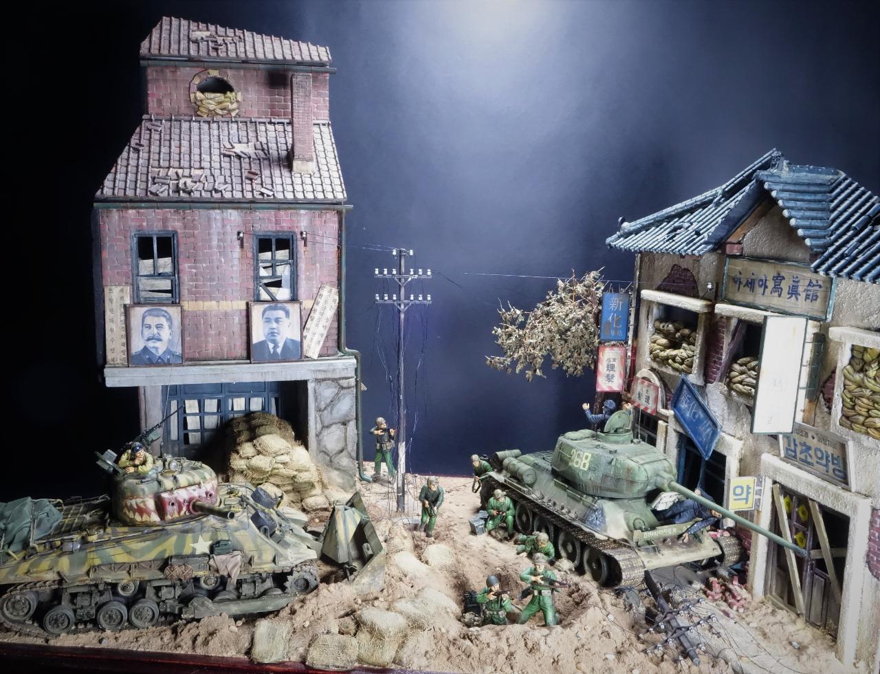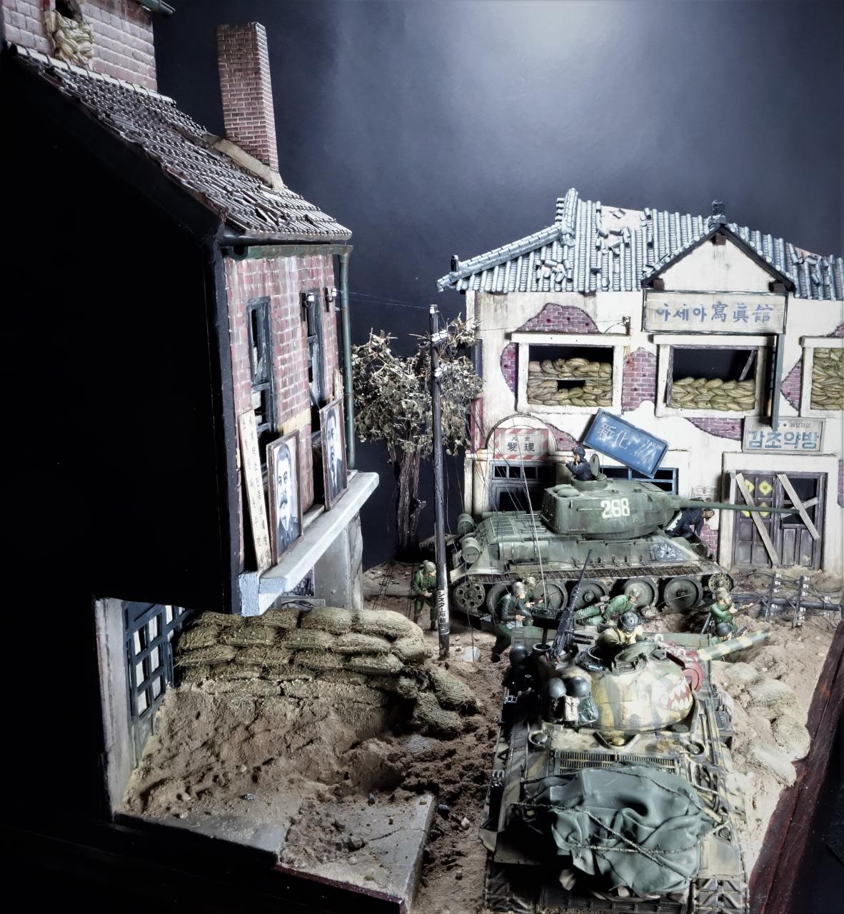 등장하는 M4 셔먼 도져와 T-34/85 모두 아카데미 제품이고, M4 셔먼 도져를 밋밋한 녹색으로 칠하기 보다는 강렬한 이미지를 주기 위하여 호랑이 도색을 해보았습니다. 실제 이 시점에는 유엔군 장비들이 급하게들 투입되느라 이런 도색은 안되었을 같습니다.(고증은 패스..)