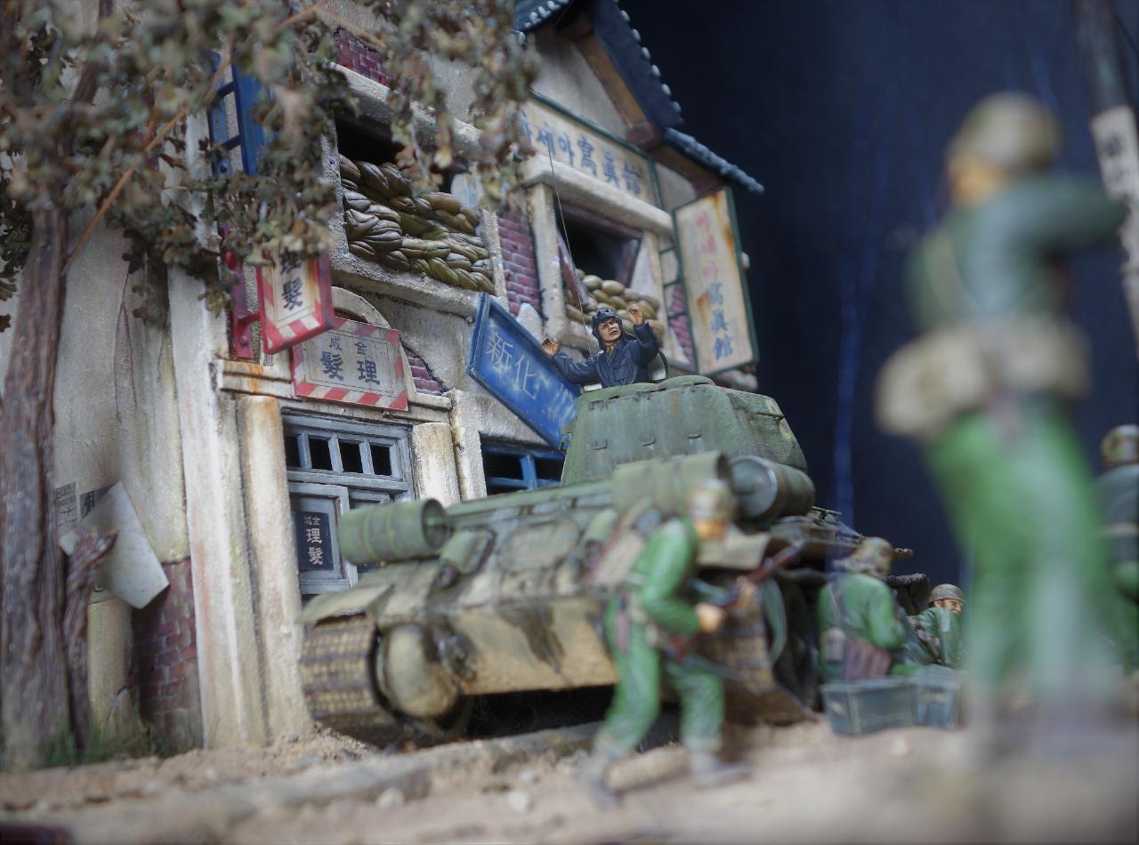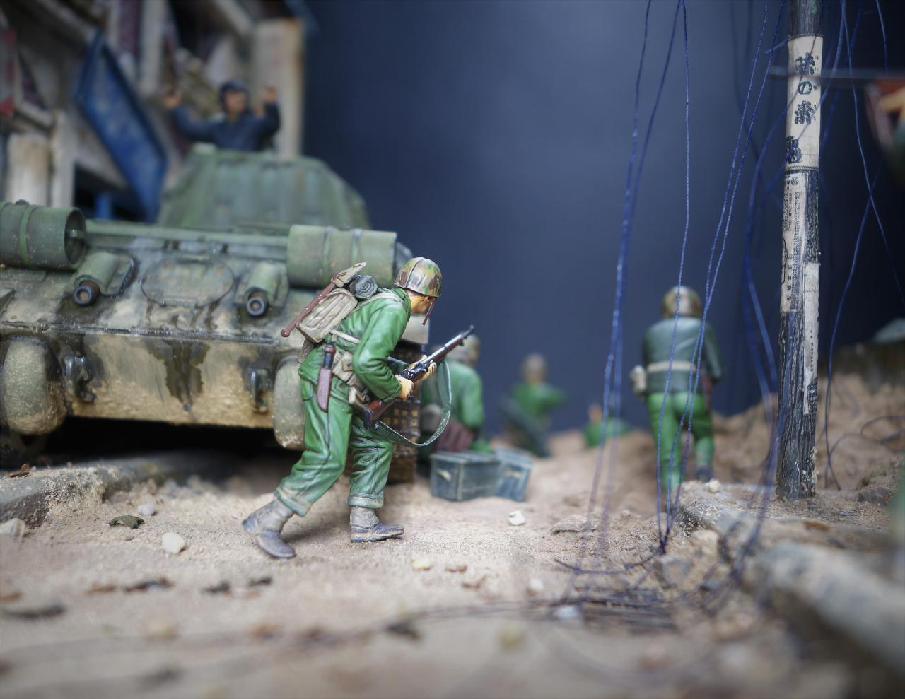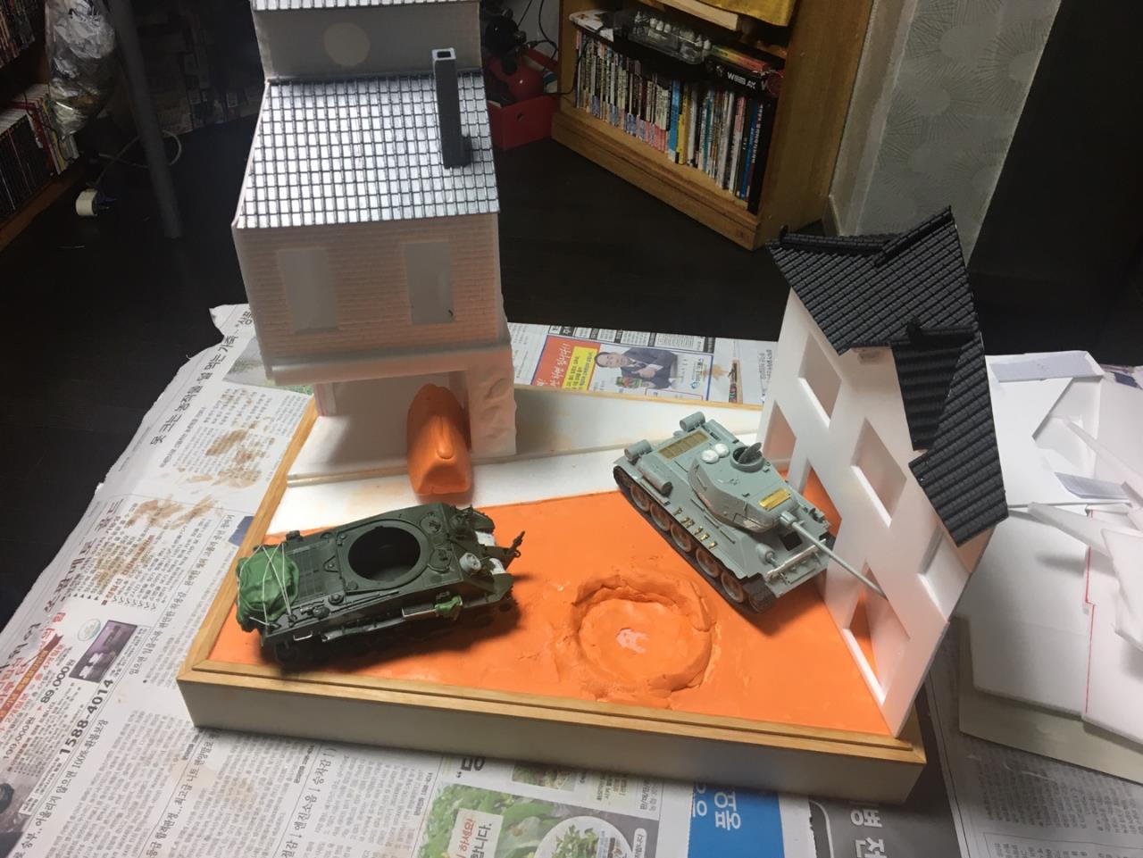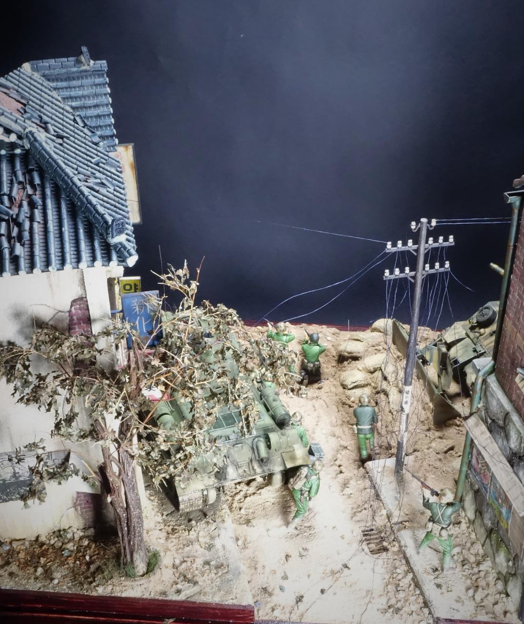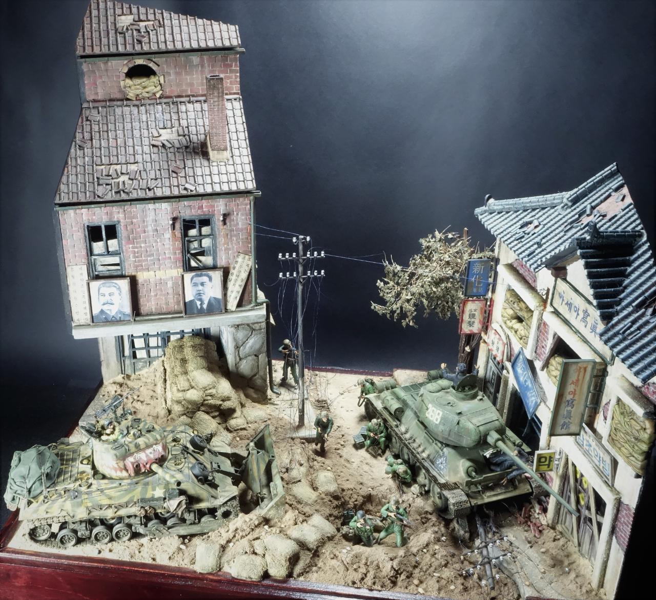 등장하는 M4 셔먼 도져와 T-34/85 모두 아카데미 제품이고, M4 셔먼 도져를 밋밋한 녹색으로 칠하기 보다는 강렬한 이미지를 주기 위하여 호랑이 도색을 해보았습니다. 실제 이 시점에는 유엔군 장비들이 급하게들 투입되느라 이런 도색은 안되었을 같습니다.(고증은 패스..)