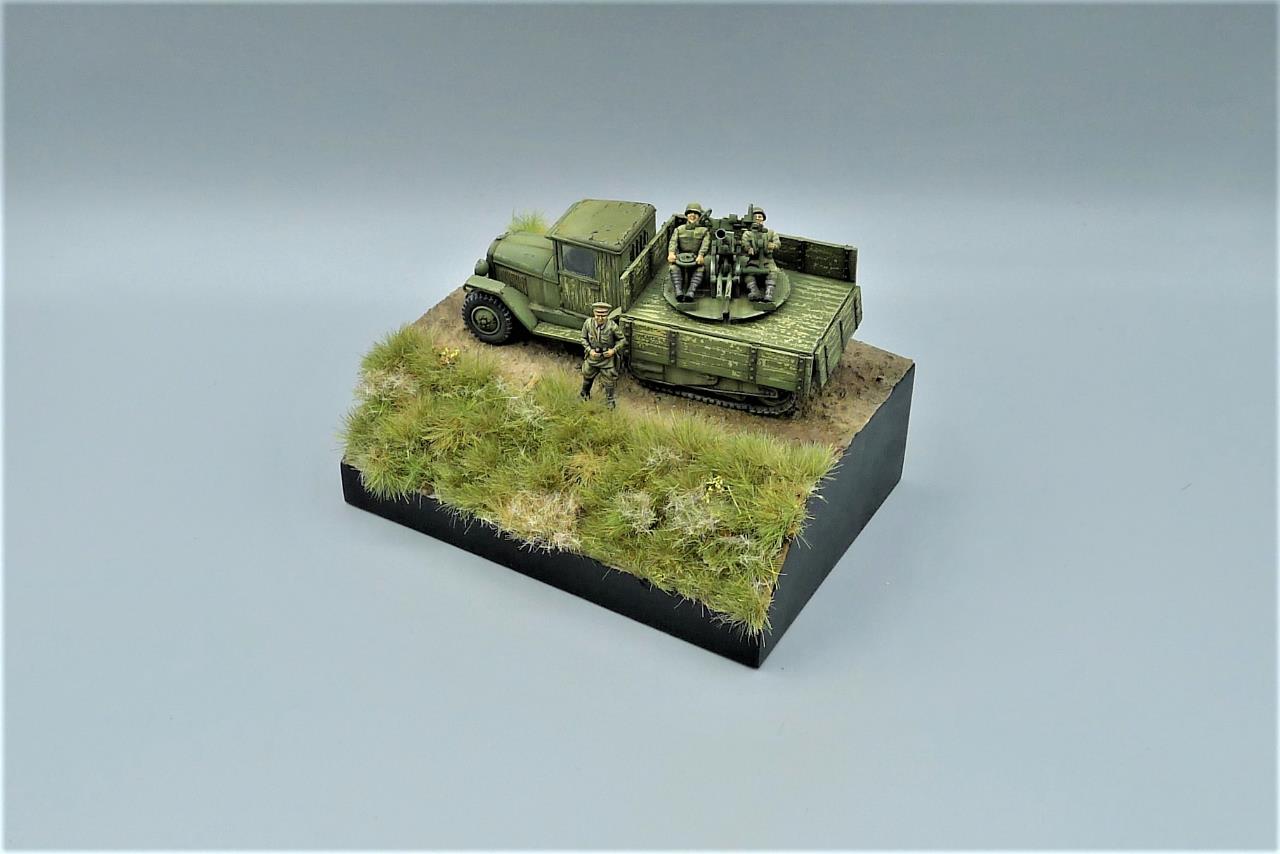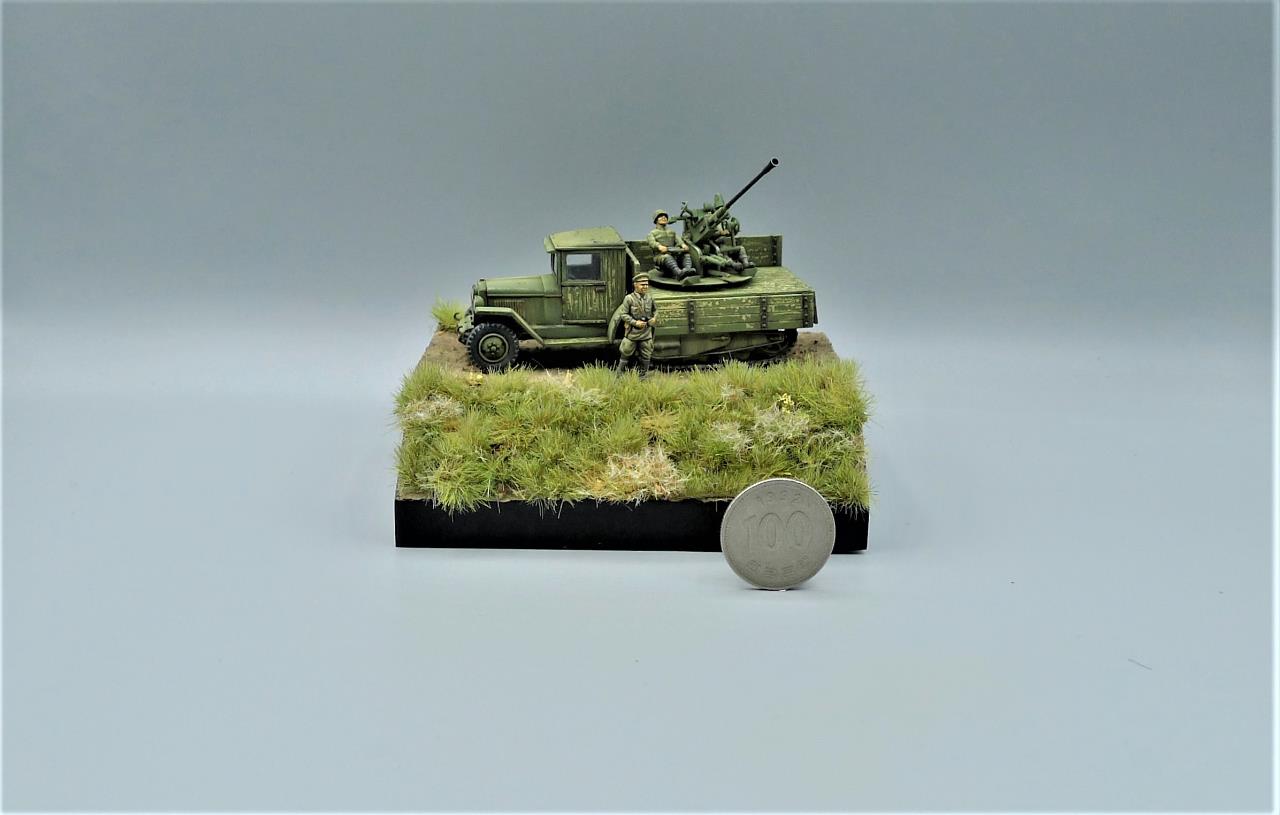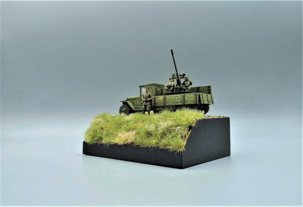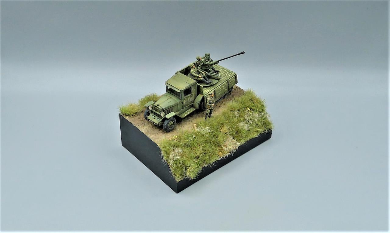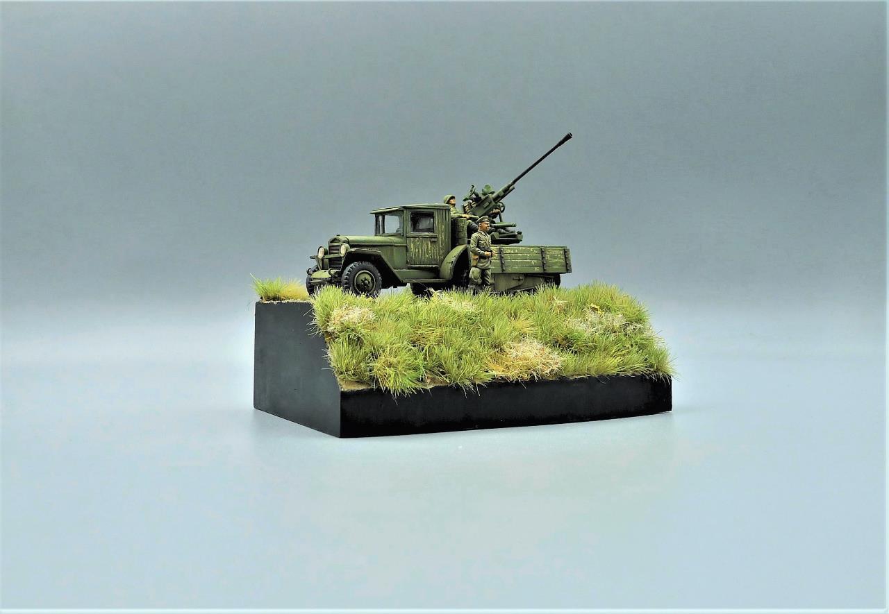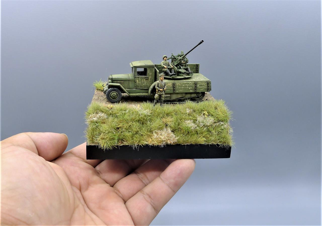 ZIS-42 트럭에 37mm대공포를 얹은 대공차량을 이용하여 간단한 비네트를 만들어 봤습니다. ZIS차량은 PST제품인데 제품이 워낙 극악의 품질이라 많은 고생끝에 조립하게 되었습니다. 색칠은 치핑액을 이용하여 적재함등에 페인트가 까져 나무가 드러낸 표현을 중점적으로 해주었고 대공포는 PST킷을 버리고 즈베즈다의 것을 사용해 주었고 인형의 사출이 너무 뭉개져있어 머리를 교체해주고 색칠로 커버해보려 노력했습니다. 전방의 망원경을 들고있는 인형 역시 즈베즈다킷에 있던거 하나 픽업했습니다. 킷을 조립하기전부터 언덕의 이미지를 머릿속에 품고 있어서 단순한 형태이나마 지면을 표현하고 디오라마 풀재료등을 심어주었습니다. 봐주셔서 감사합니다.