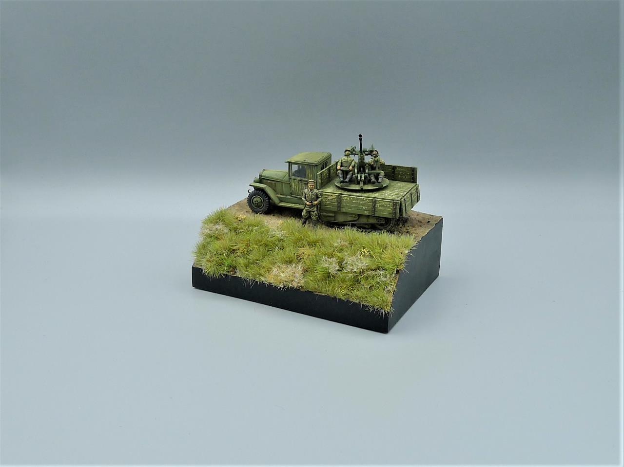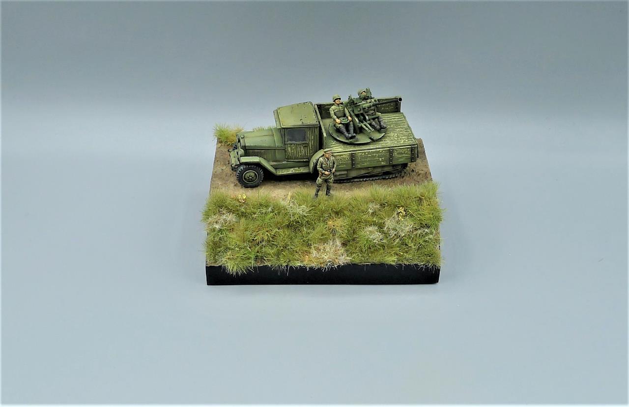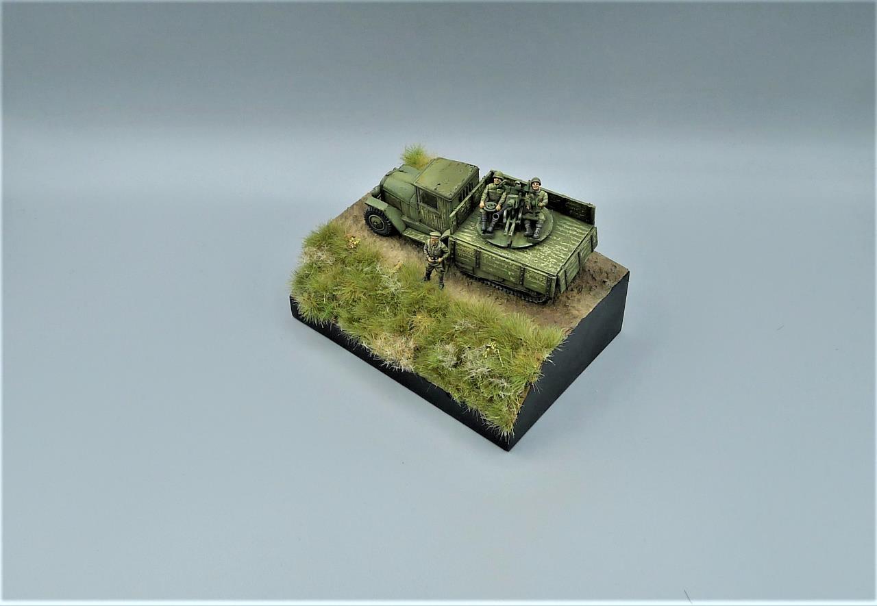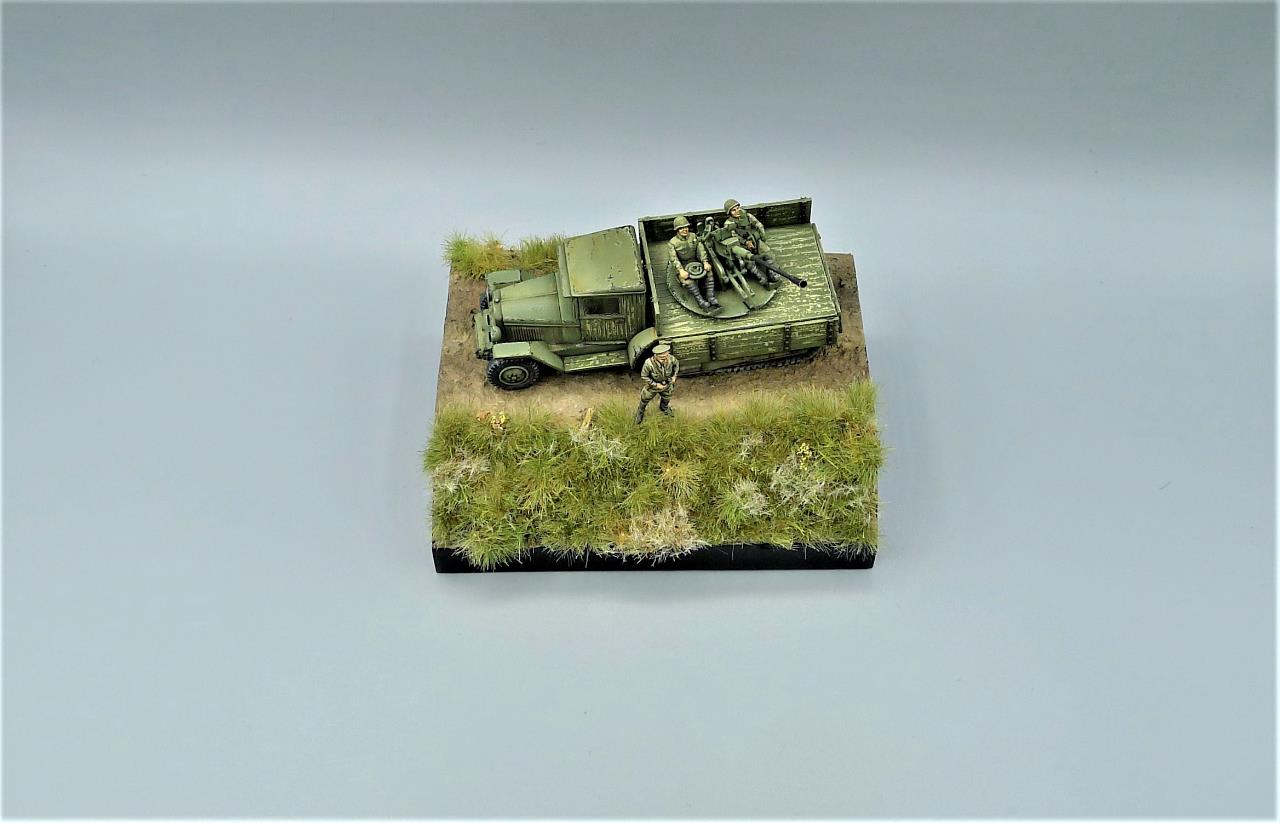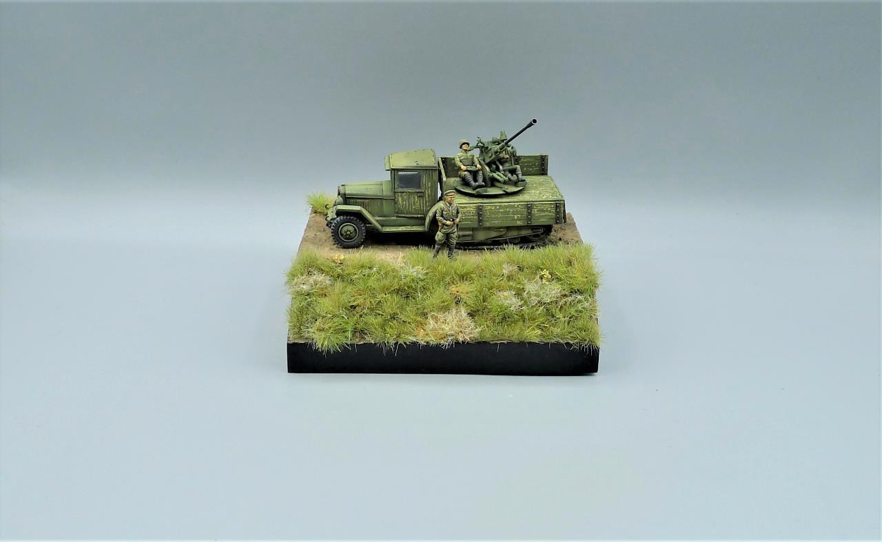 ZIS-42 트럭에 37mm대공포를 얹은 대공차량을 이용하여 간단한 비네트를 만들어 봤습니다. ZIS차량은 PST제품인데 제품이 워낙 극악의 품질이라 많은 고생끝에 조립하게 되었습니다. 색칠은 치핑액을 이용하여 적재함등에 페인트가 까져 나무가 드러낸 표현을 중점적으로 해주었고 대공포는 PST킷을 버리고 즈베즈다의 것을 사용해 주었고 인형의 사출이 너무 뭉개져있어 머리를 교체해주고 색칠로 커버해보려 노력했습니다. 전방의 망원경을 들고있는 인형 역시 즈베즈다킷에 있던거 하나 픽업했습니다. 킷을 조립하기전부터 언덕의 이미지를 머릿속에 품고 있어서 단순한 형태이나마 지면을 표현하고 디오라마 풀재료등을 심어주었습니다. 봐주셔서 감사합니다.