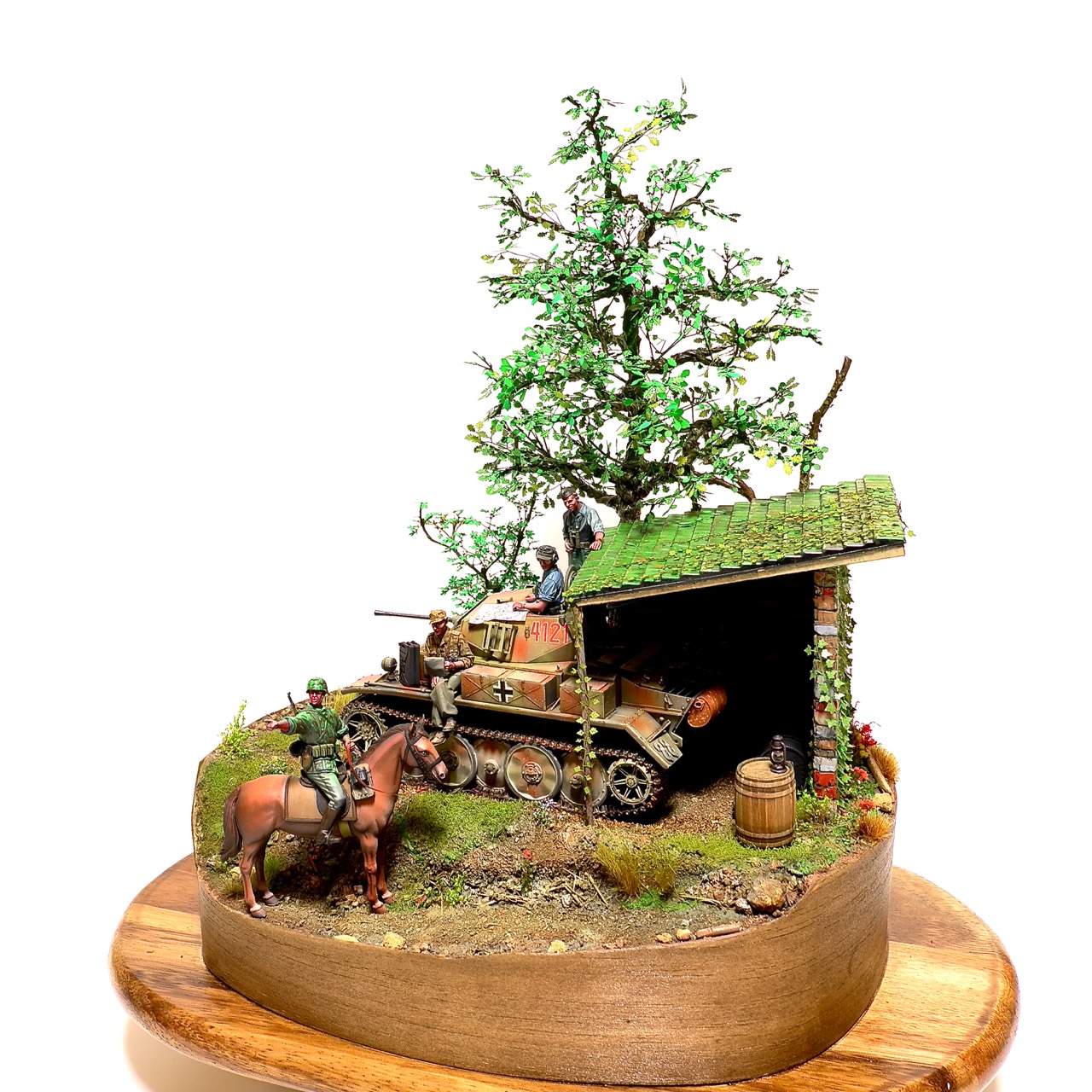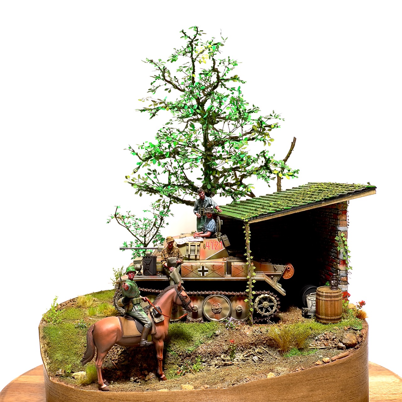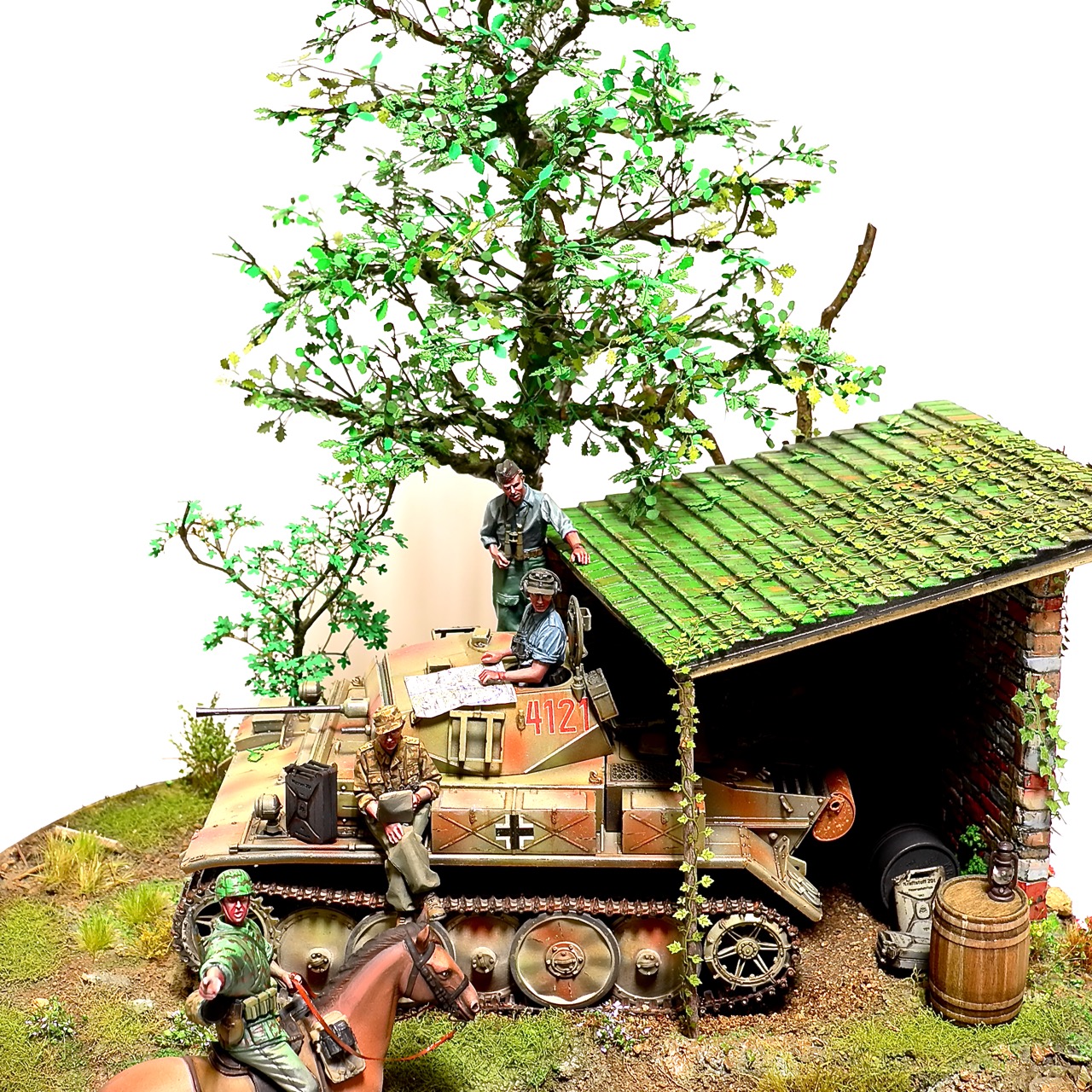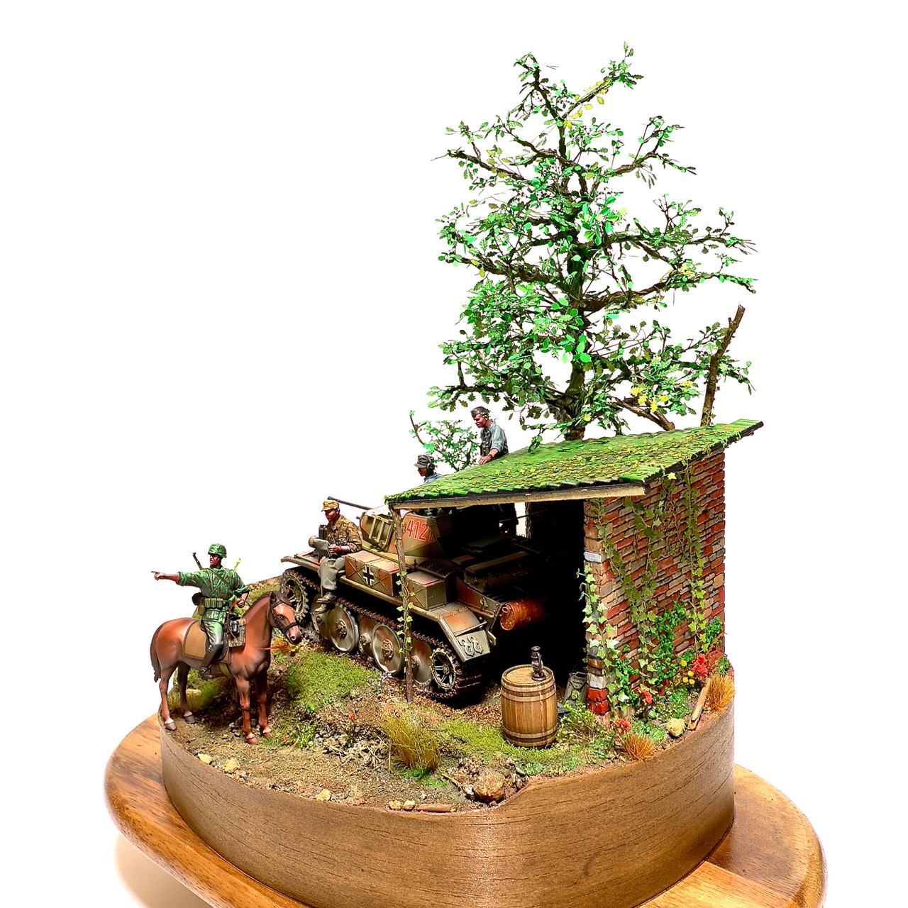 Tasca의 Luchs에 알파인 인형들과 드래곤제 말과 보병을 이용하여 작은 비넷을 만들었습니다. 1944년 노르망디가 배경이며 연합군의 항공전력을 피해 낮시간동안 버려진 헛간에 숨어있다 슬슬 활동을 시작하는 상황을 표현해봤습니다. 나무를 만드느라 힘들었는데 하나하나 잎사귀를 붙이던 저의 작업기를 보시고 MMZ에서도 활동하시는 '지재형'님이 레이져 커팅된 멋진 잎사귀를 보내주셔서 완성을 볼 수 있었습니다. 이 자리를 빌려 다시 한번 감사의 말씀을 드립니다!