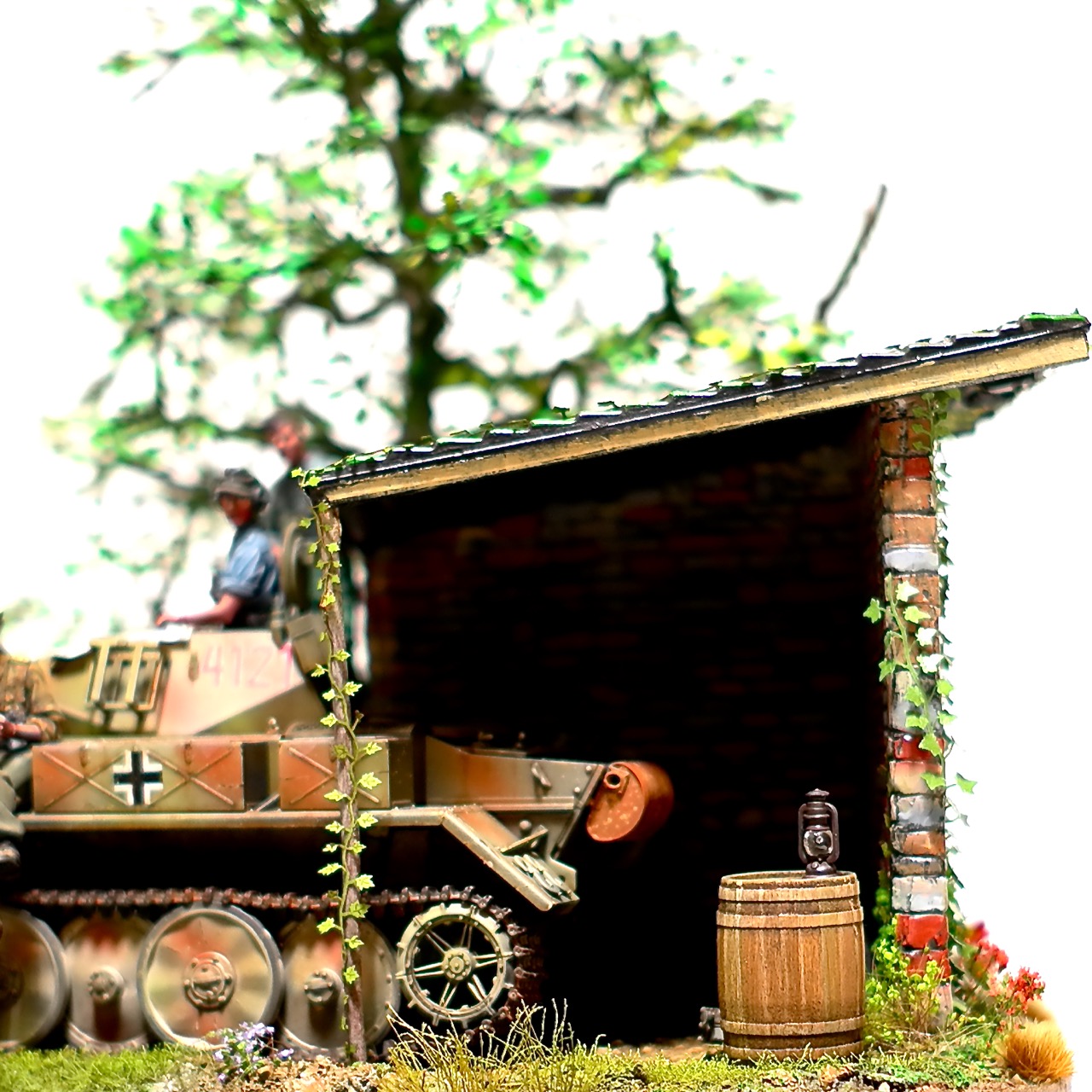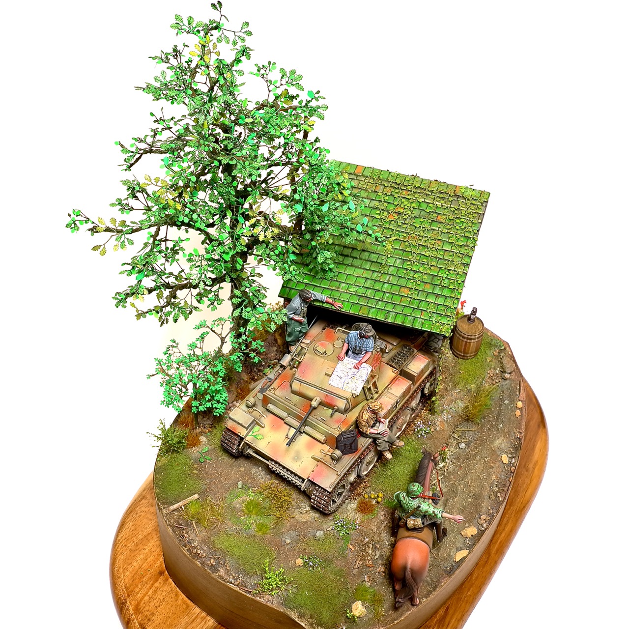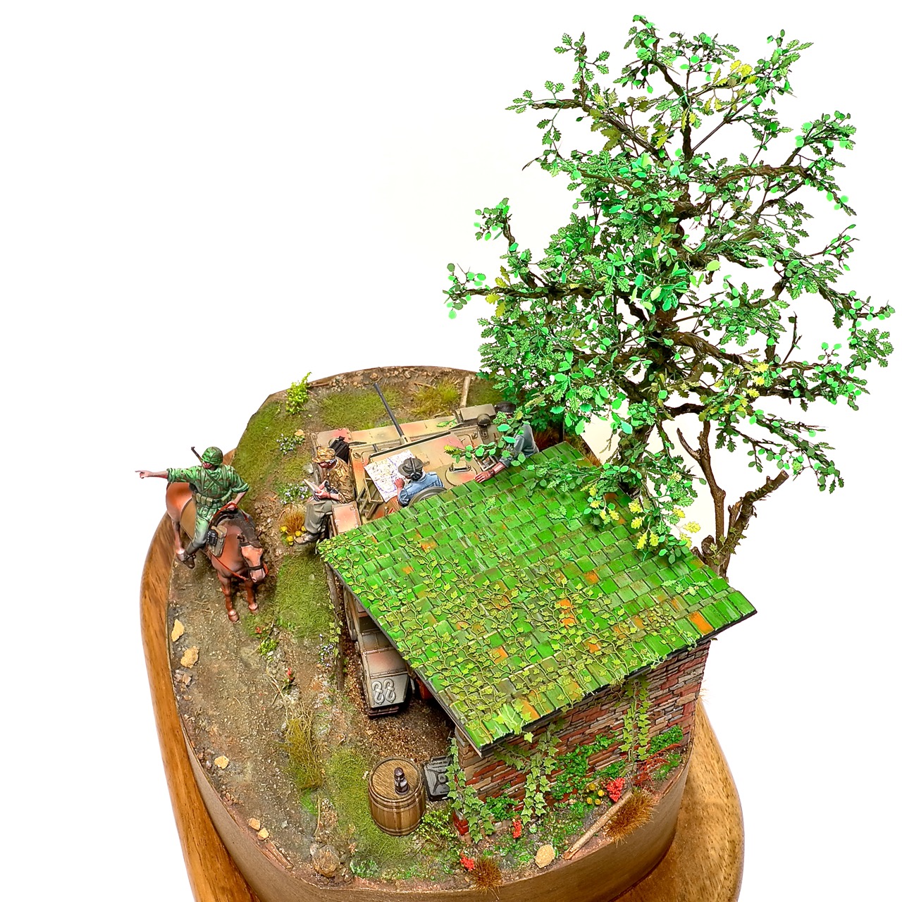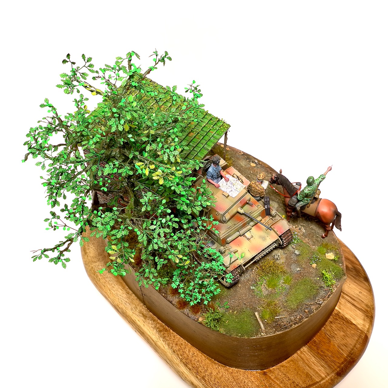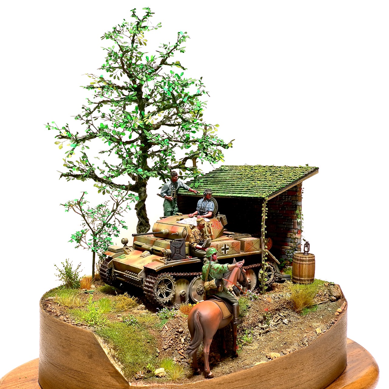 Tasca의 Luchs에 알파인 인형들과 드래곤제 말과 보병을 이용하여 작은 비넷을 만들었습니다. 1944년 노르망디가 배경이며 연합군의 항공전력을 피해 낮시간동안 버려진 헛간에 숨어있다 슬슬 활동을 시작하는 상황을 표현해봤습니다. 나무를 만드느라 힘들었는데 하나하나 잎사귀를 붙이던 저의 작업기를 보시고 MMZ에서도 활동하시는 '지재형'님이 레이져 커팅된 멋진 잎사귀를 보내주셔서 완성을 볼 수 있었습니다. 이 자리를 빌려 다시 한번 감사의 말씀을 드립니다!