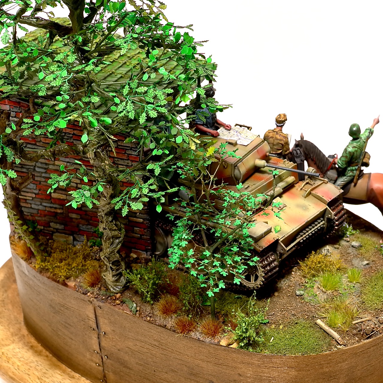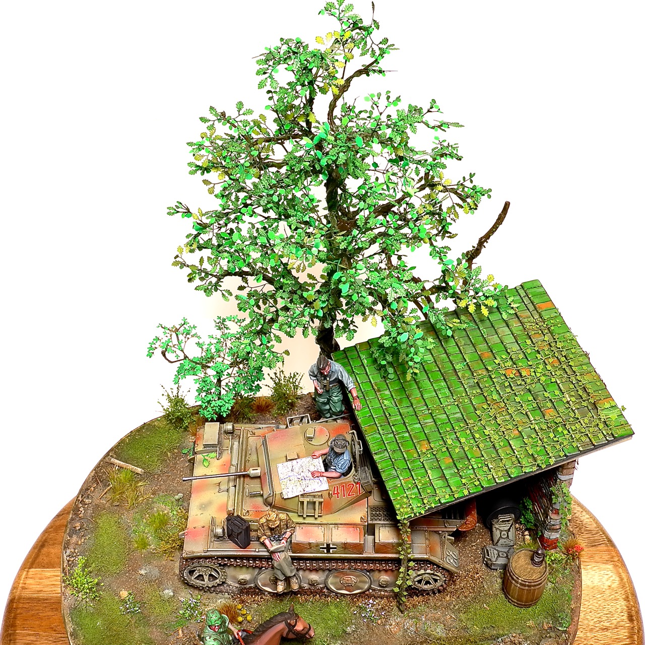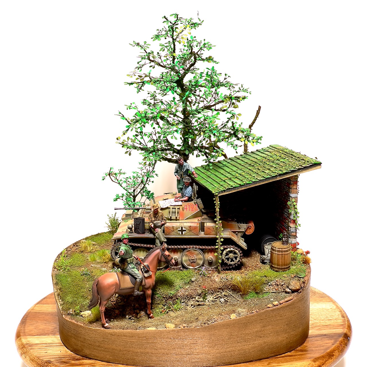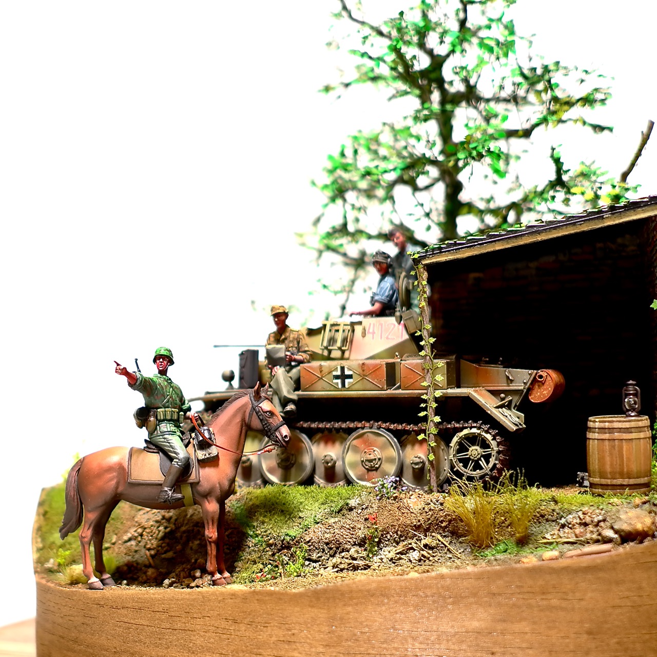 Tasca의 Luchs에 알파인 인형들과 드래곤제 말과 보병을 이용하여 작은 비넷을 만들었습니다. 1944년 노르망디가 배경이며 연합군의 항공전력을 피해 낮시간동안 버려진 헛간에 숨어있다 슬슬 활동을 시작하는 상황을 표현해봤습니다. 나무를 만드느라 힘들었는데 하나하나 잎사귀를 붙이던 저의 작업기를 보시고 MMZ에서도 활동하시는 '지재형'님이 레이져 커팅된 멋진 잎사귀를 보내주셔서 완성을 볼 수 있었습니다. 이 자리를 빌려 다시 한번 감사의 말씀을 드립니다!