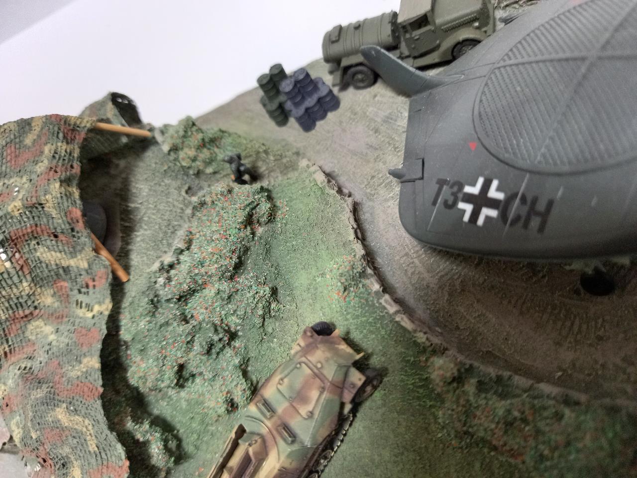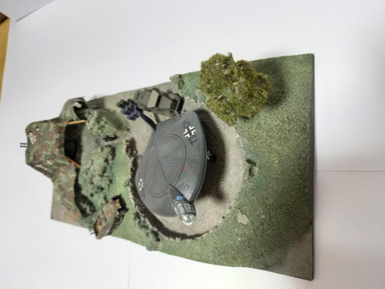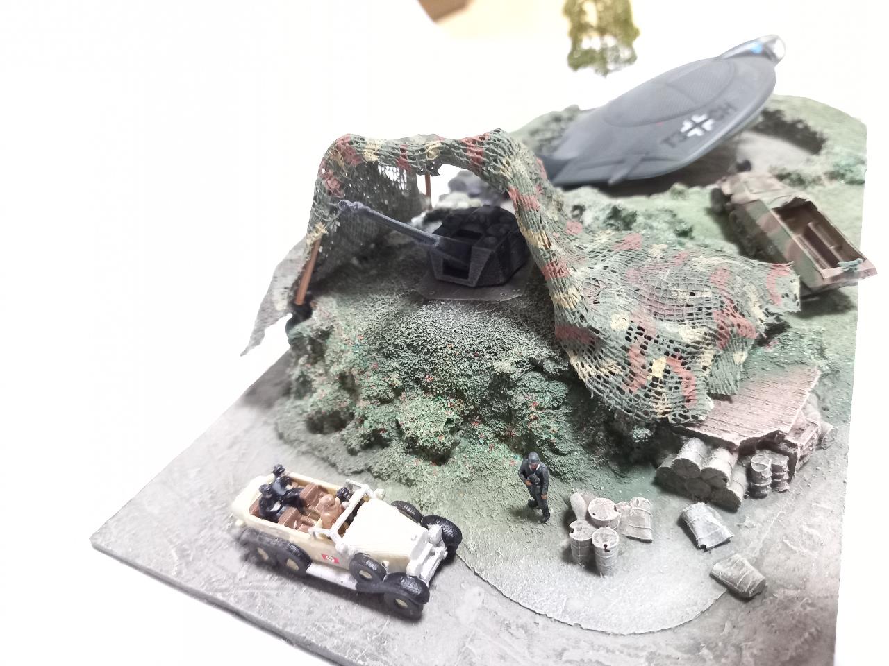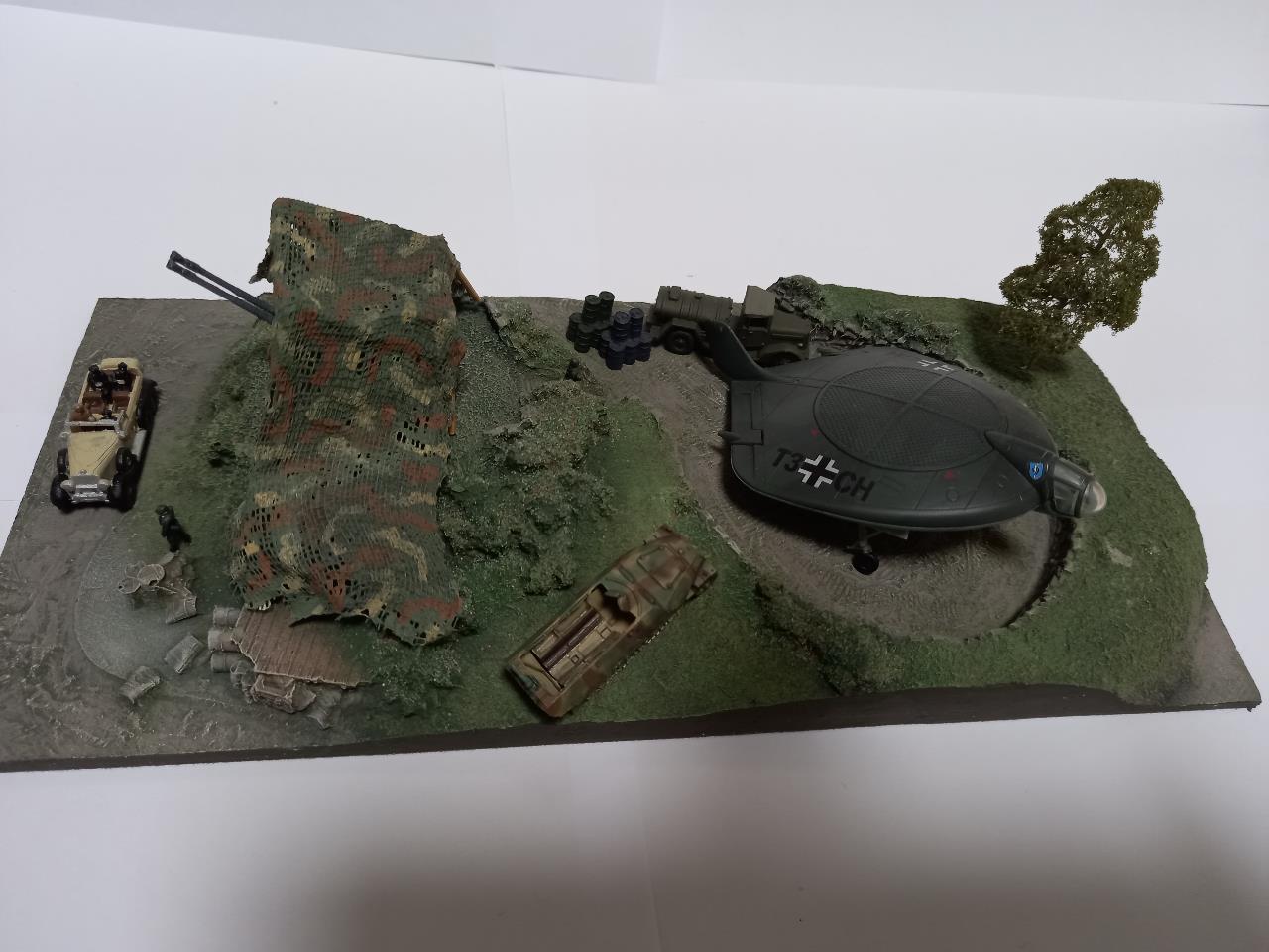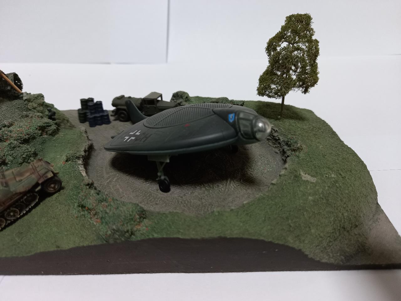 1/144로 만든 독일군 VTOL 비행기 비행장 디오라마입니다. 예전에 레진 및 석고로만 나왔고 도색은 되지 않은 제품을 에어브러쉬로 풀도색하여 올려봤습니다. 철도모형을 만지다 보니 작은 디오라마 스킬이 느는군요