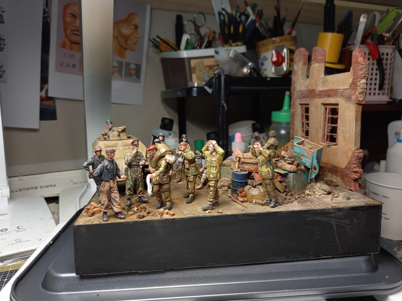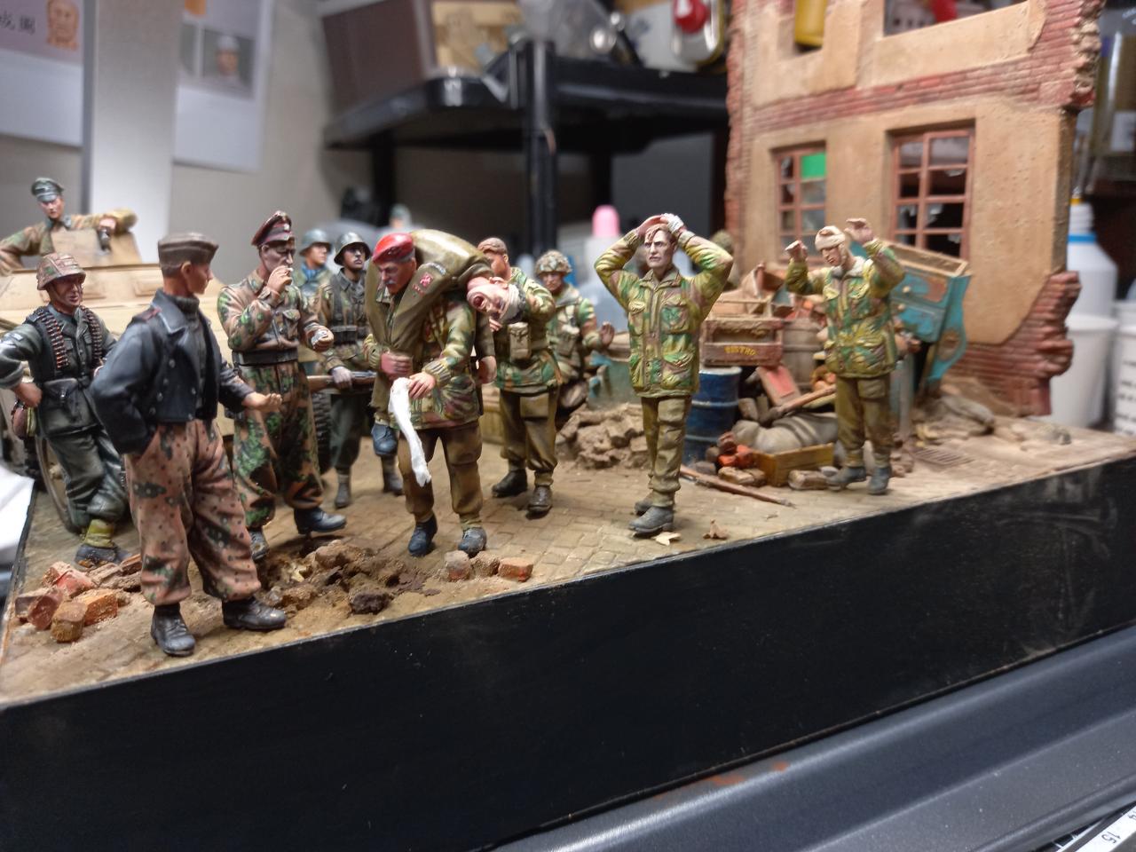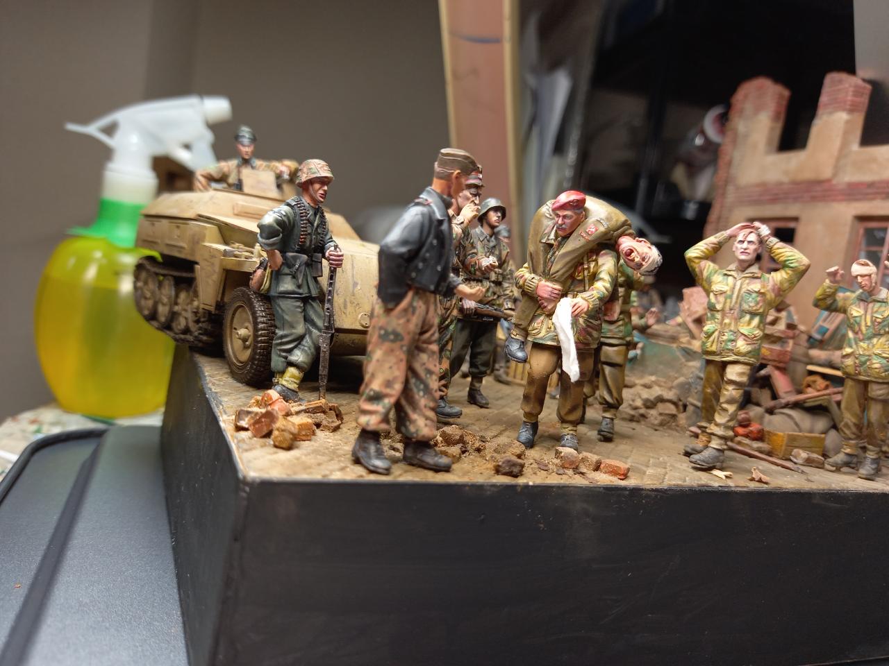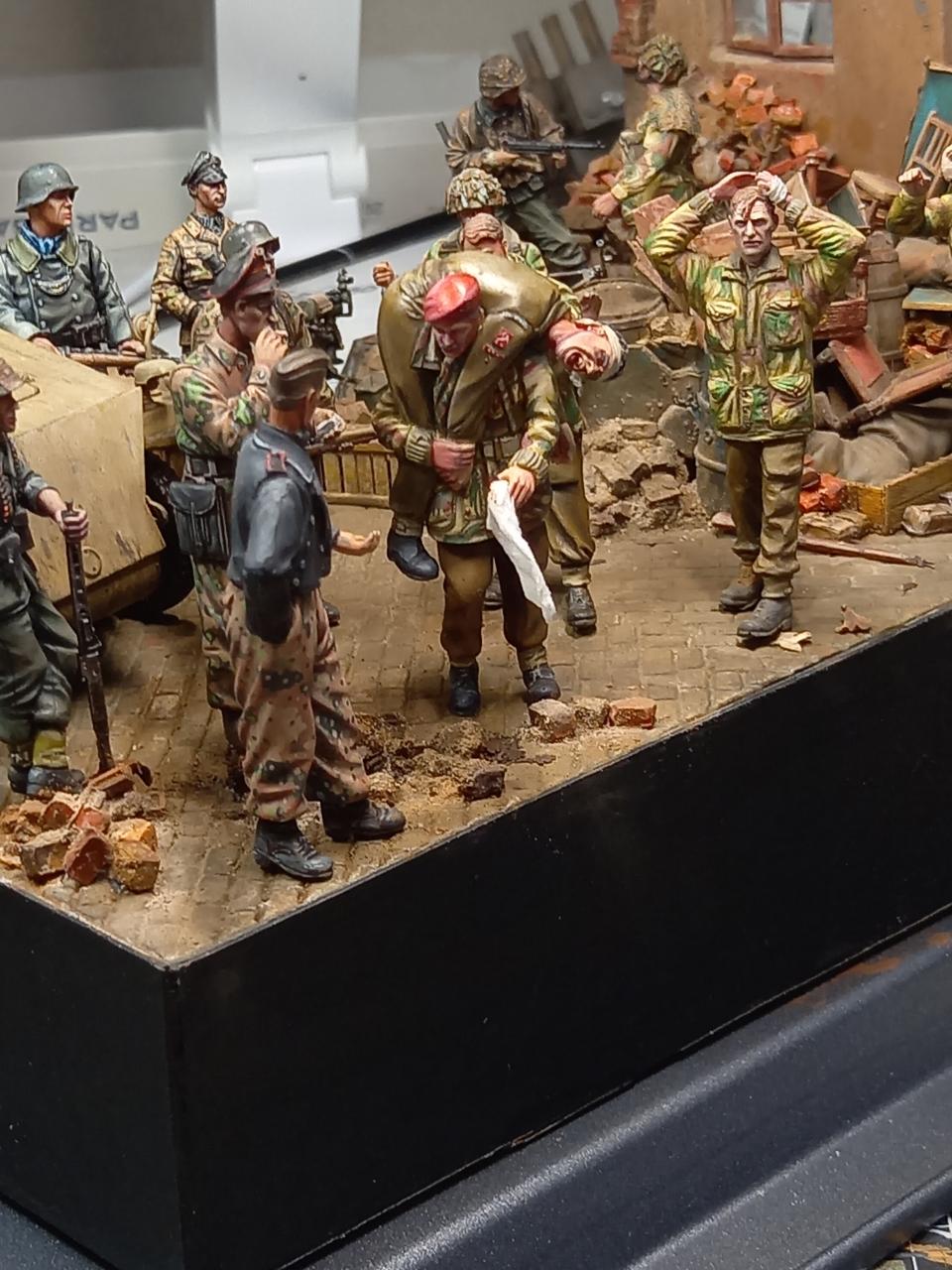 항복하면서걸어간느 병사두명은 미니아트제, 베레모병사와부상병공수병은 오래된 벨린데제. 다리를 다쳐서 앉아있는 병사는 독일군 다리에 벨린덴 공수병 상의를 붙여 개조한것입니다. 구석에 보면 통신이 되지 않아 버려진무전기와 공수병 모터사이클이 있습니다.