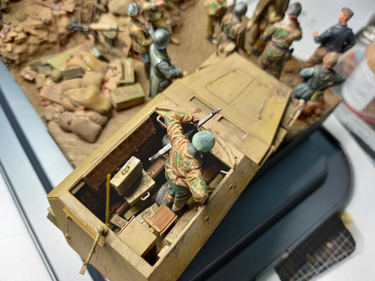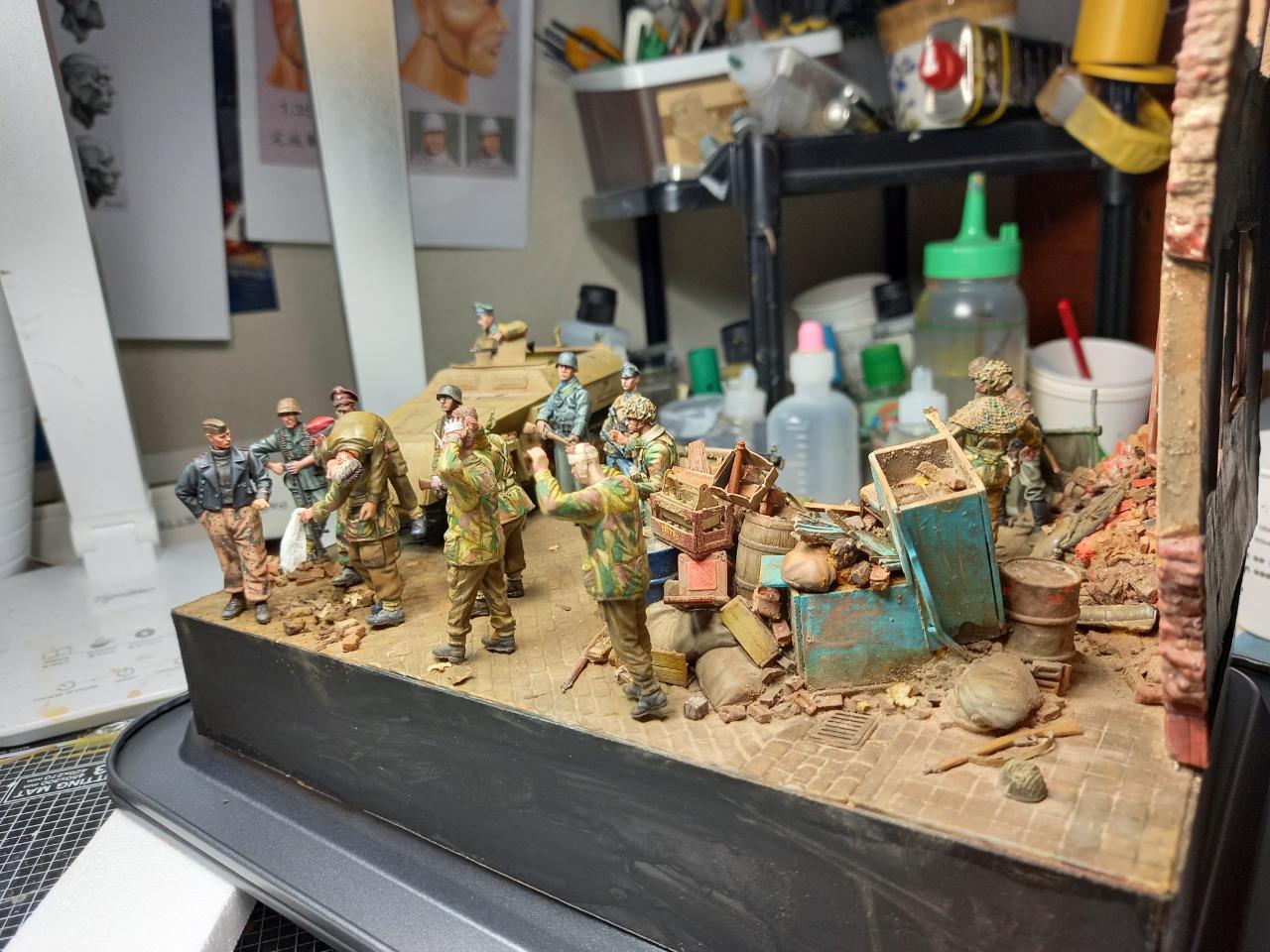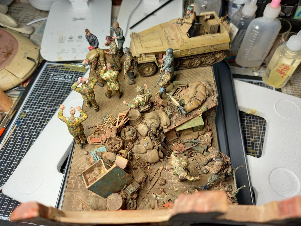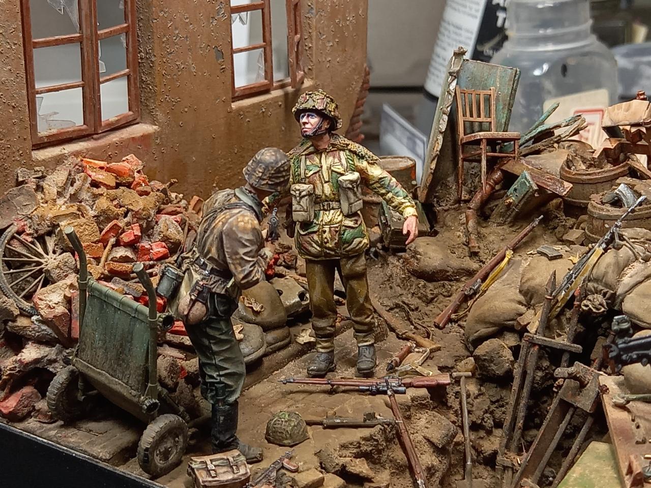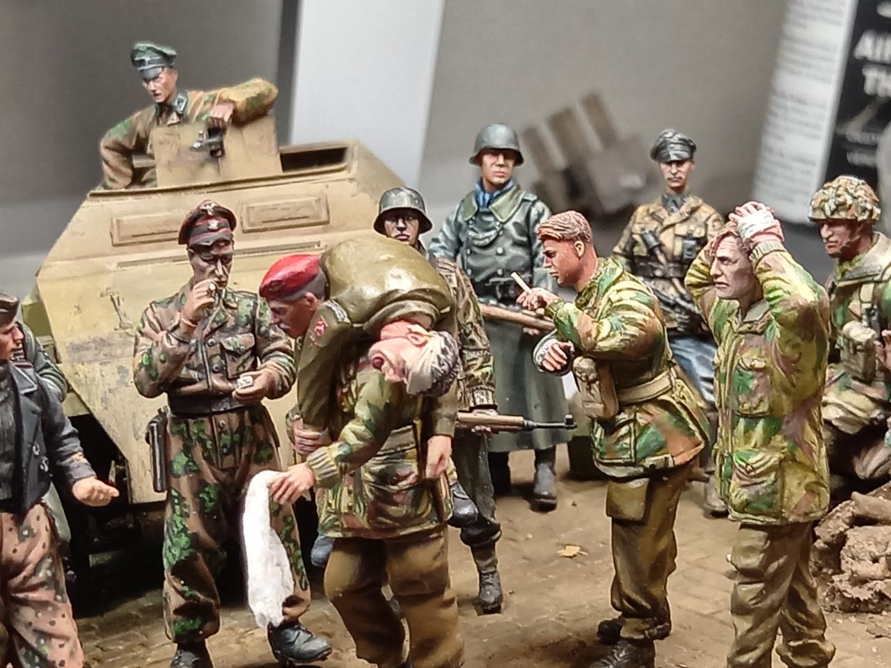 항복하면서걸어간느 병사두명은 미니아트제, 베레모병사와부상병공수병은 오래된 벨린데제. 다리를 다쳐서 앉아있는 병사는 독일군 다리에 벨린덴 공수병 상의를 붙여 개조한것입니다. 구석에 보면 통신이 되지 않아 버려진무전기와 공수병 모터사이클이 있습니다.