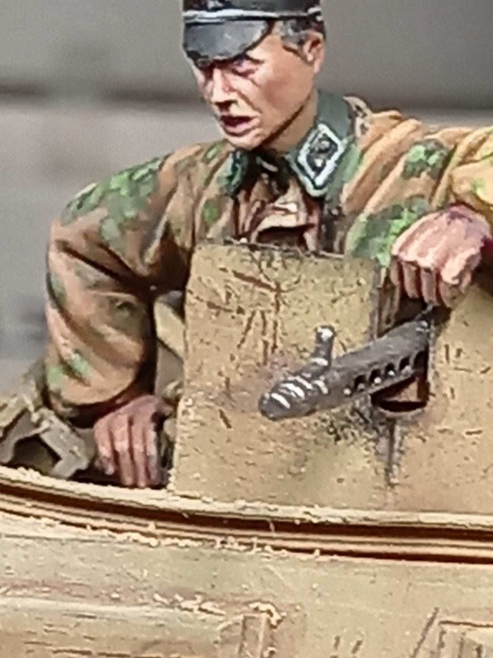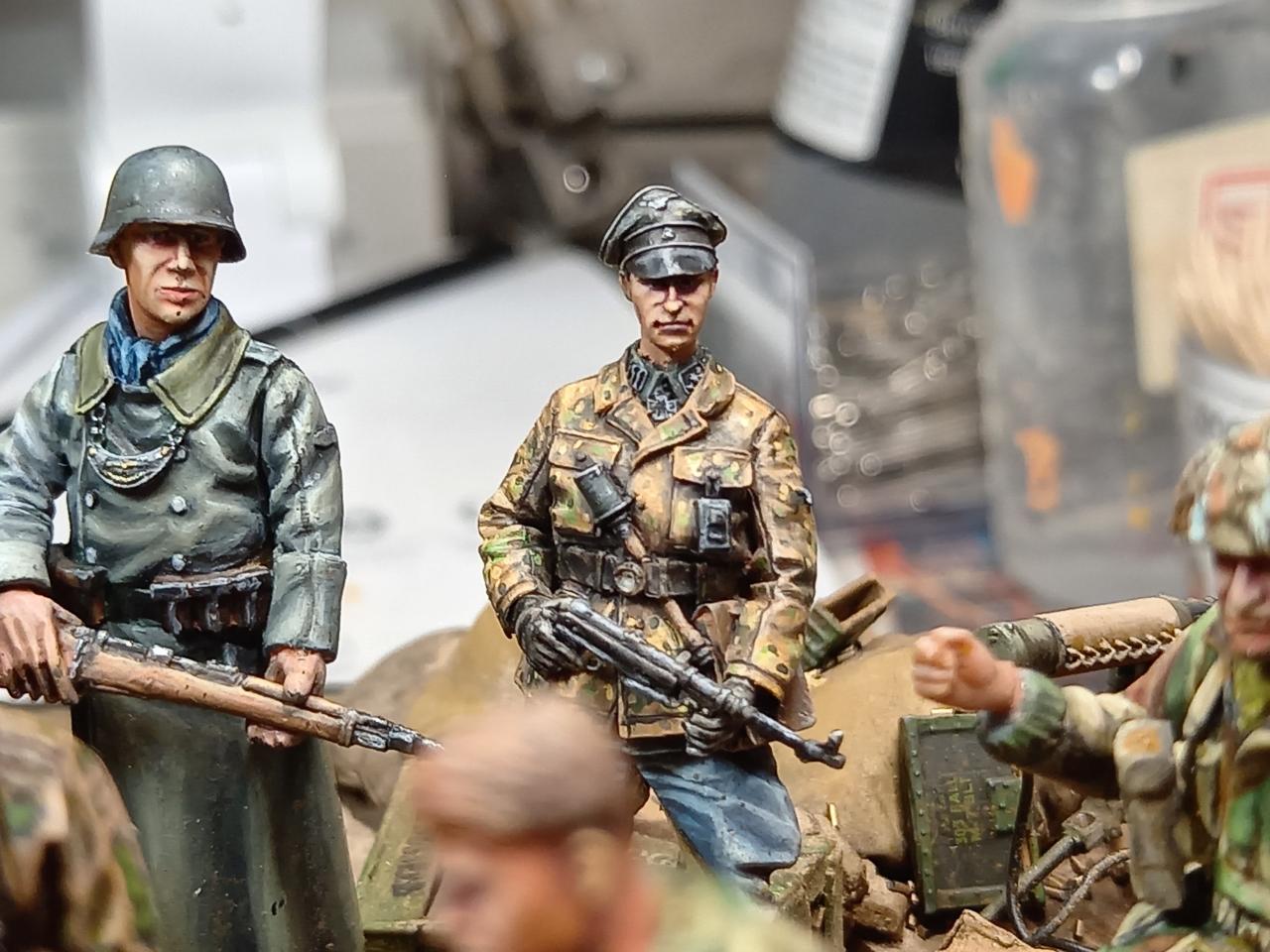 독일 헌병과 친위대원입니다. 영국군 항복하는 자세 병사들 만들고 무슨일이생겨서 한 3년 프라모델을 놓았더니 인형색칠감각을 완전히 잃어서 색칠연습하려고 한1년 인형만 칠했는데 그중에 좀 잘칠해진 두명을 뽑아서 세웠습니다. 첨 계획엔 없던 것이라 과하게 인형이 북적이는 모양이 되었습니다.