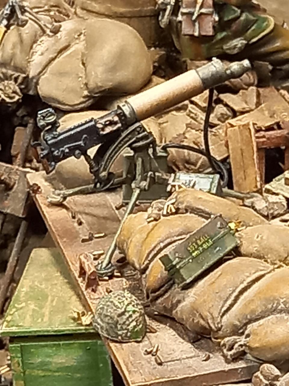 탄이 다 떨어진 기관총은 게코모델의 것입니다. 원래는 50발들이 드럼탄창달린 브렌건은 아른헴에서 공수병들이 지상용으로 썼지만 비커스 기관총은 쓴 기록이 없다는데 그냥 멋있어서 세워봤습니다. 피아트 발사기옆에 피아트탄동도 있엇는데 빈통을 묘사할 방법이 없어 치워버렸습니다.
