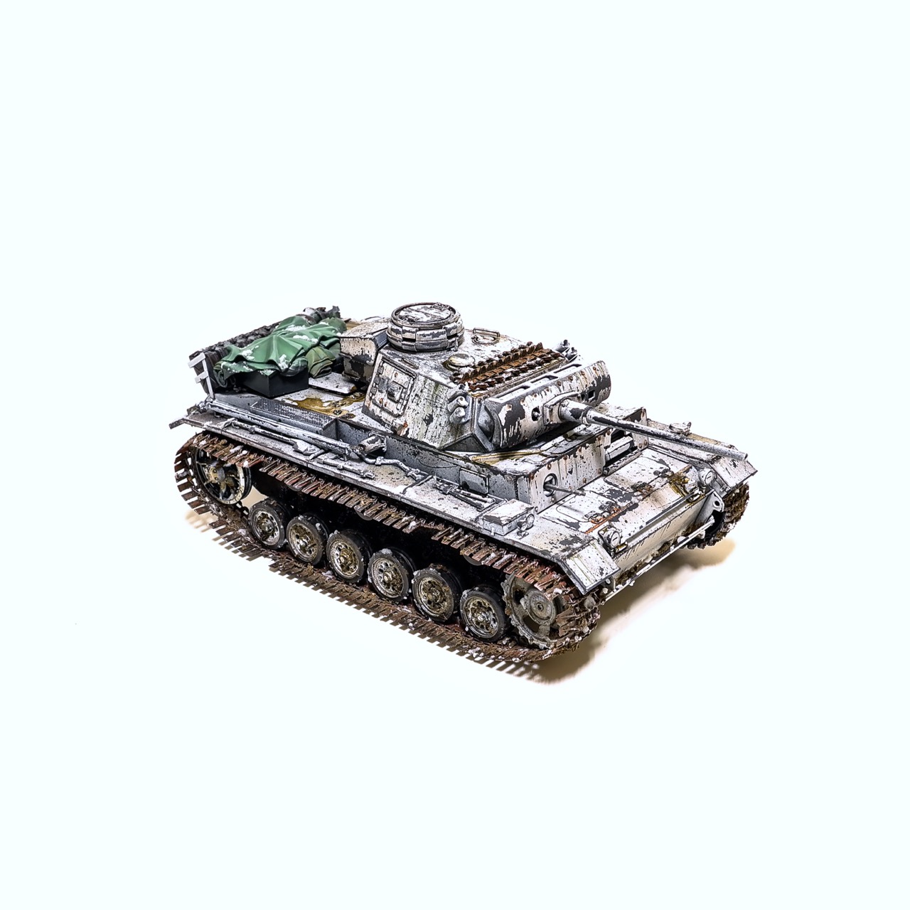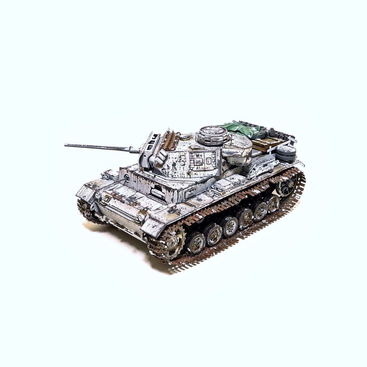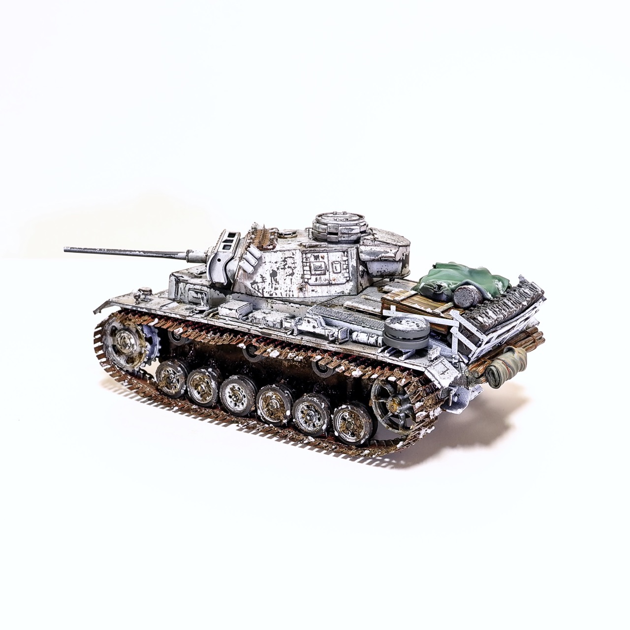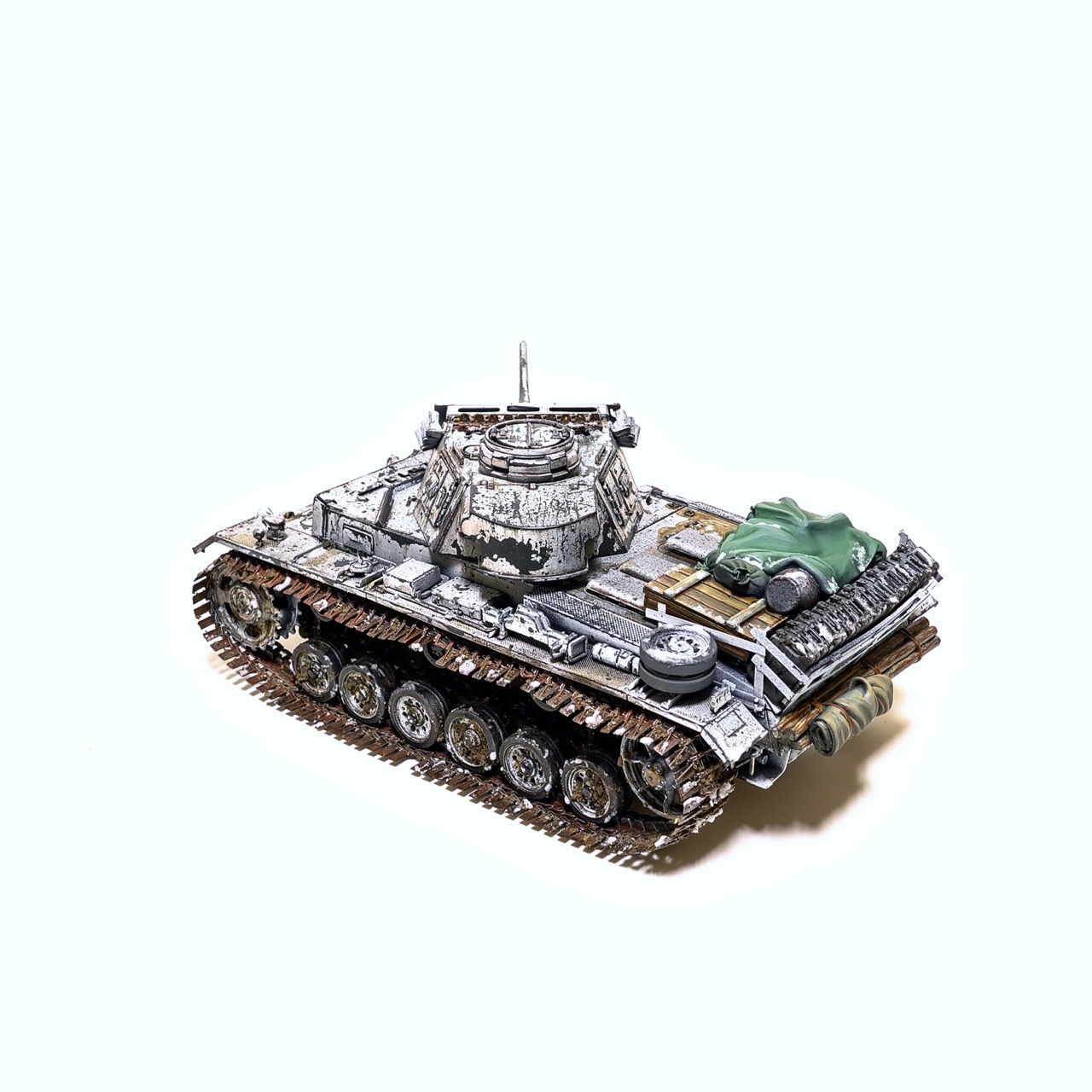 드래곤사의 Pz.Kpfw III. ausf.L형입니다. winterketten 트랙이 이뻐보여서 작업하게 되었습니다. 등에 짊어진 짐과 악세사리는 레전드사의 제품을 사용했고 나머지는 스트레이트로 조립하고 헤어스프레이를 이용한 동계위장으로 색칠하였습니다. 감사합니다!