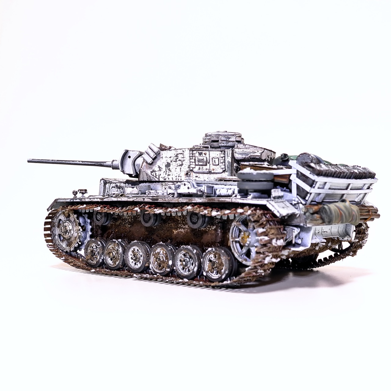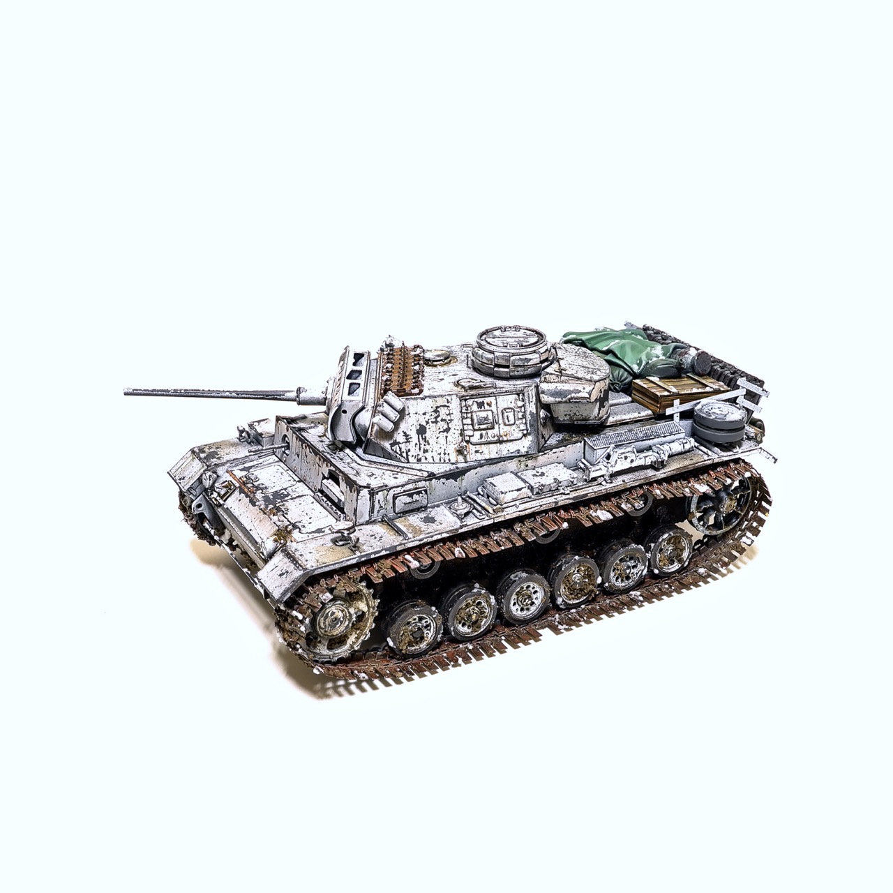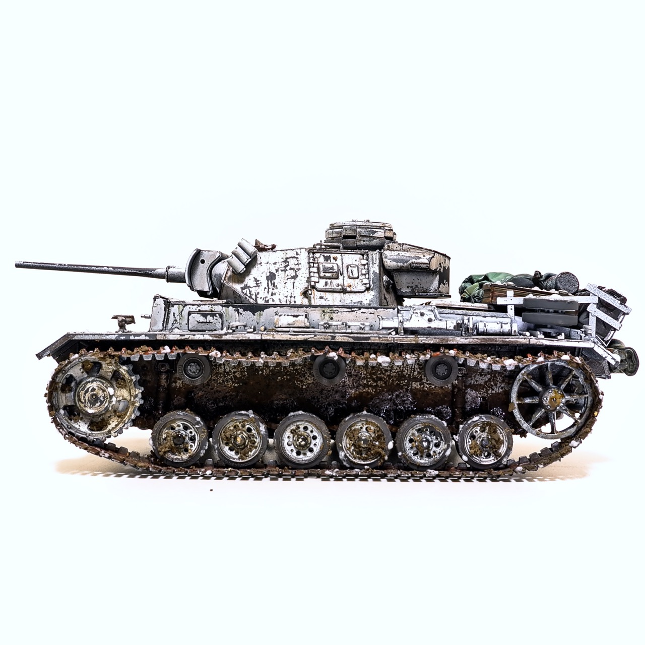 드래곤사의 Pz.Kpfw III. ausf.L형입니다. winterketten 트랙이 이뻐보여서 작업하게 되었습니다. 등에 짊어진 짐과 악세사리는 레전드사의 제품을 사용했고 나머지는 스트레이트로 조립하고 헤어스프레이를 이용한 동계위장으로 색칠하였습니다. 감사합니다!