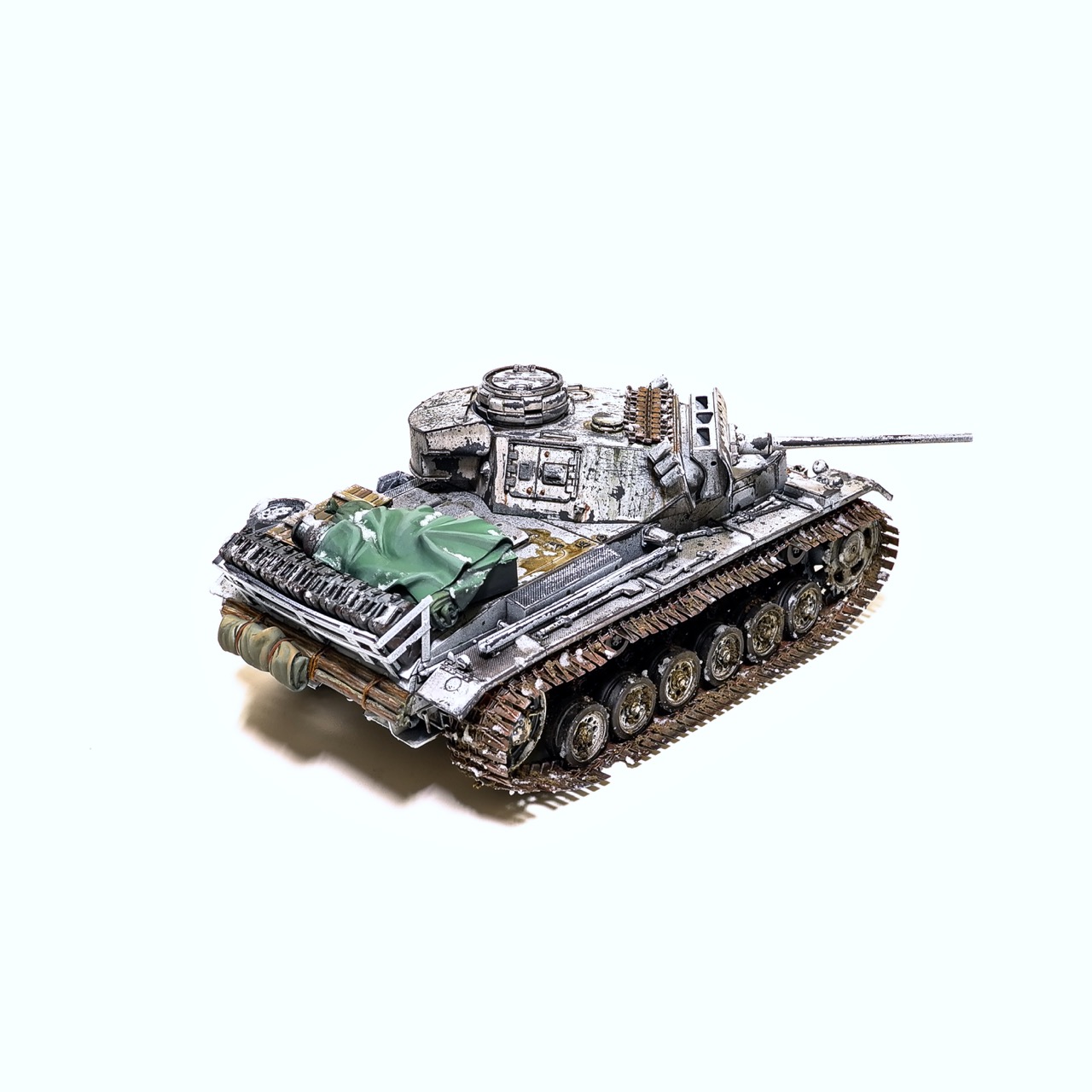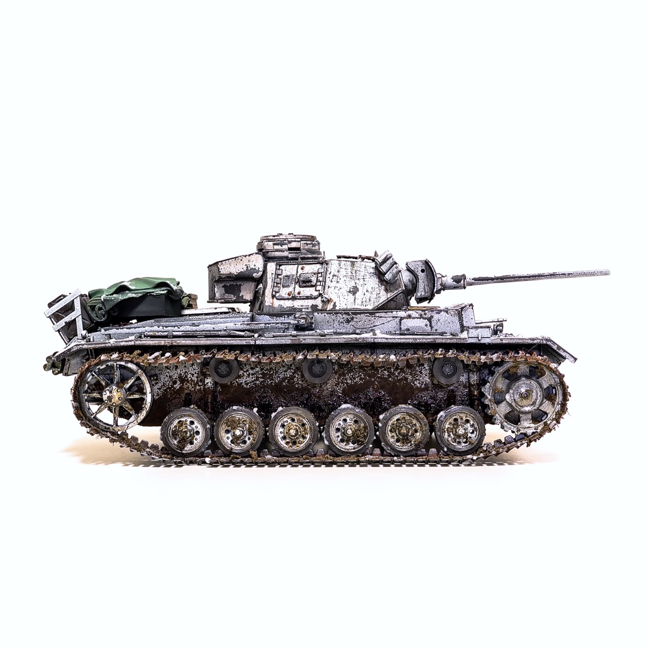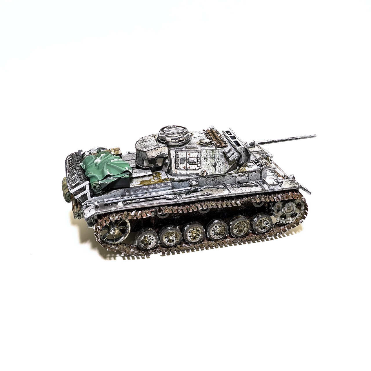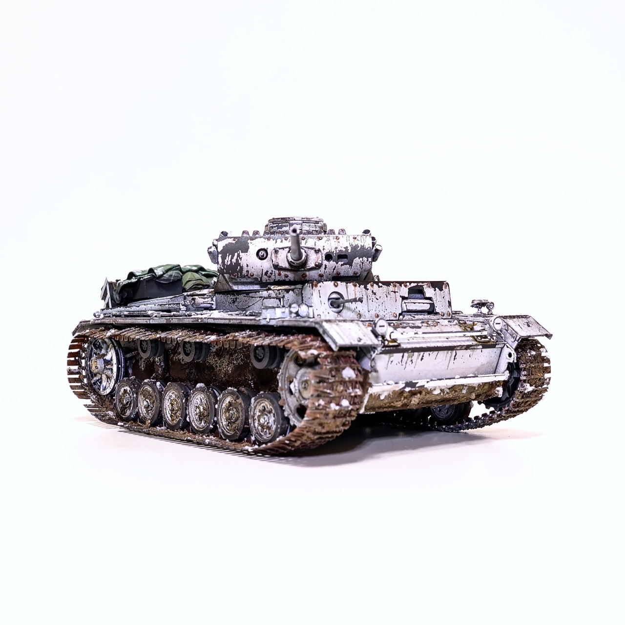 드래곤사의 Pz.Kpfw III. ausf.L형입니다. winterketten 트랙이 이뻐보여서 작업하게 되었습니다. 등에 짊어진 짐과 악세사리는 레전드사의 제품을 사용했고 나머지는 스트레이트로 조립하고 헤어스프레이를 이용한 동계위장으로 색칠하였습니다. 감사합니다!