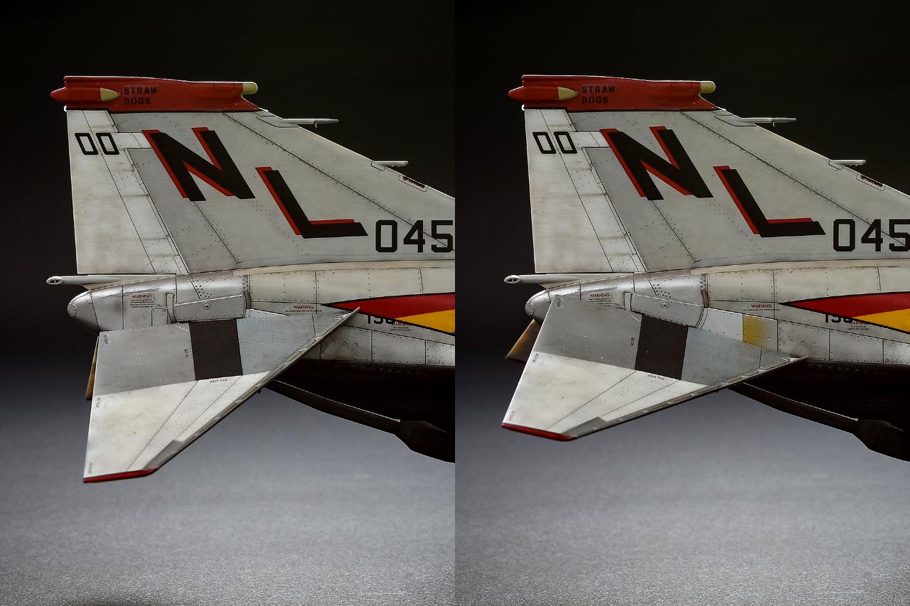 폴리캡을 사용해서 미익의 조립후에도 실기와 같은 방식으로 가동됩니다. 최근 타미야 1/48 F-14가 발함자세로 바꿀 수 있는 키트가 출시 예정이라는데 혹시 이 팬텀도 변형 키트가 나올지 모르겠습니다.