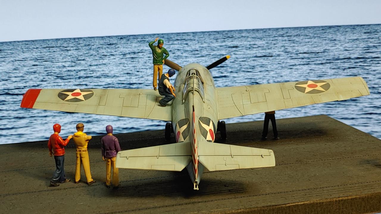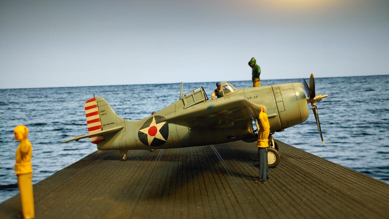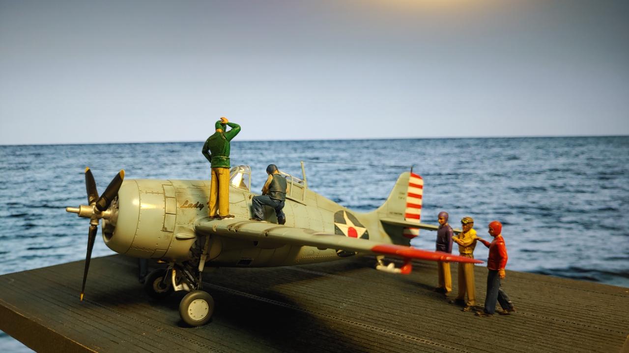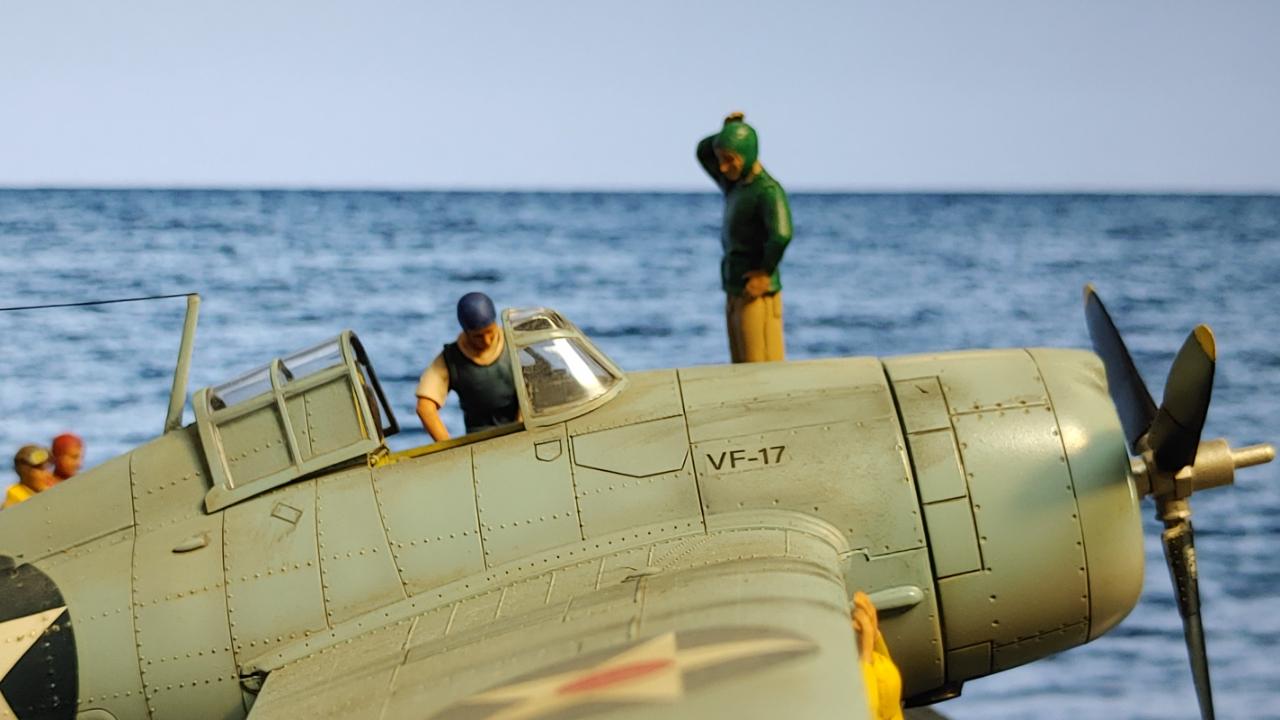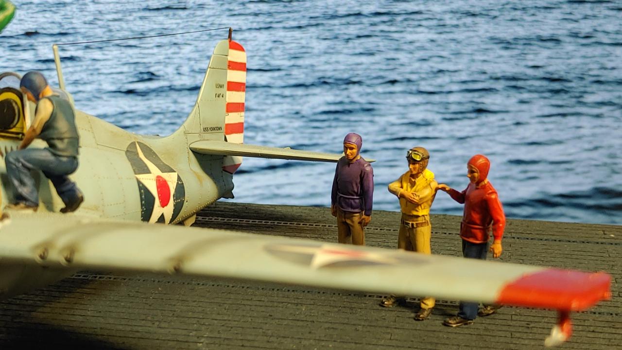 디오라마는 산호해 해전 직전인 42년 5월 3일 초계비행에 나선 주인공 편대가 붐앤줌으로 역시 초계비행을 나온 제로센 13기를 상대로 승리후 돌아와 첫 출격에 6기 격추로 원소티 에이스가 된 주인공을 위해 킬마크를 장식해주는 모습을 그려봤습니다...