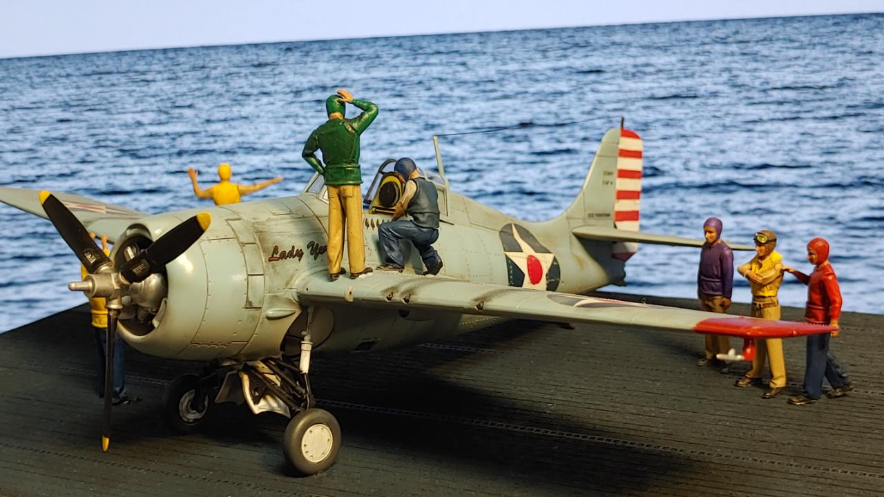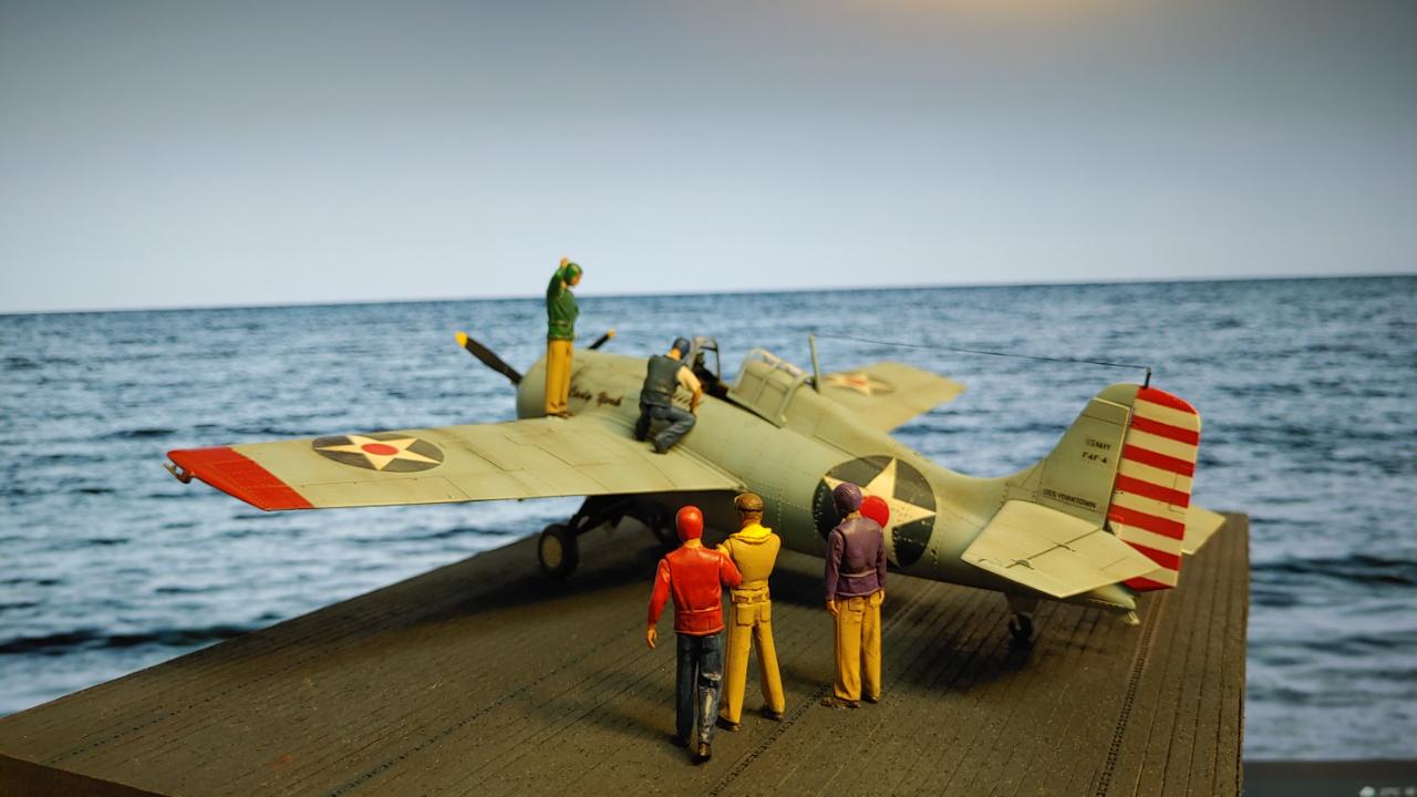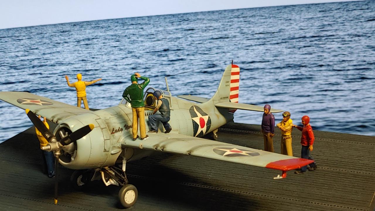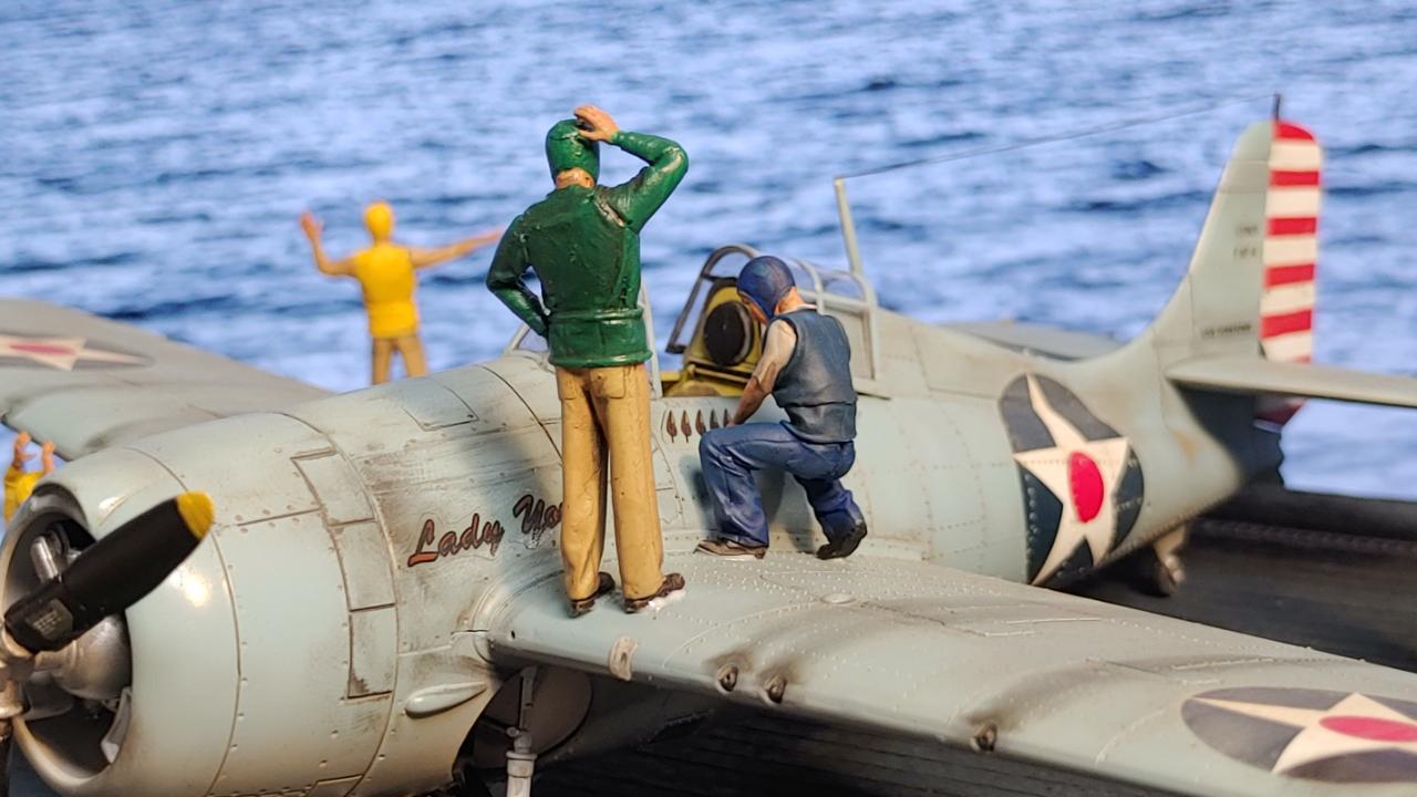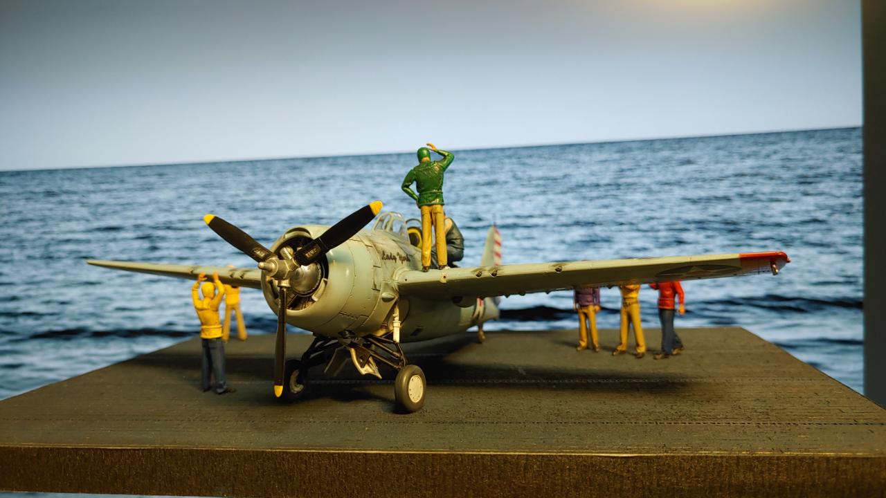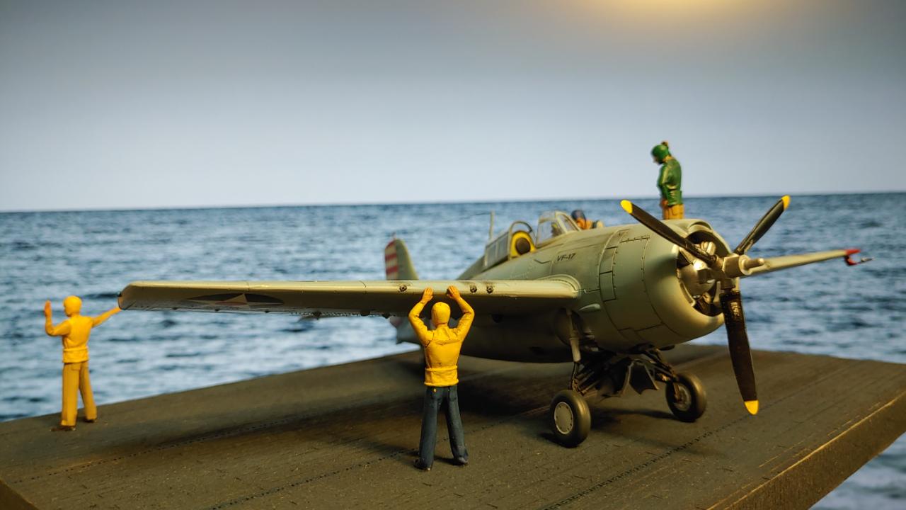 디오라마는 산호해 해전 직전인 42년 5월 3일 초계비행에 나선 주인공 편대가 붐앤줌으로 역시 초계비행을 나온 제로센 13기를 상대로 승리후 돌아와 첫 출격에 6기 격추로 원소티 에이스가 된 주인공을 위해 킬마크를 장식해주는 모습을 그려봤습니다...
