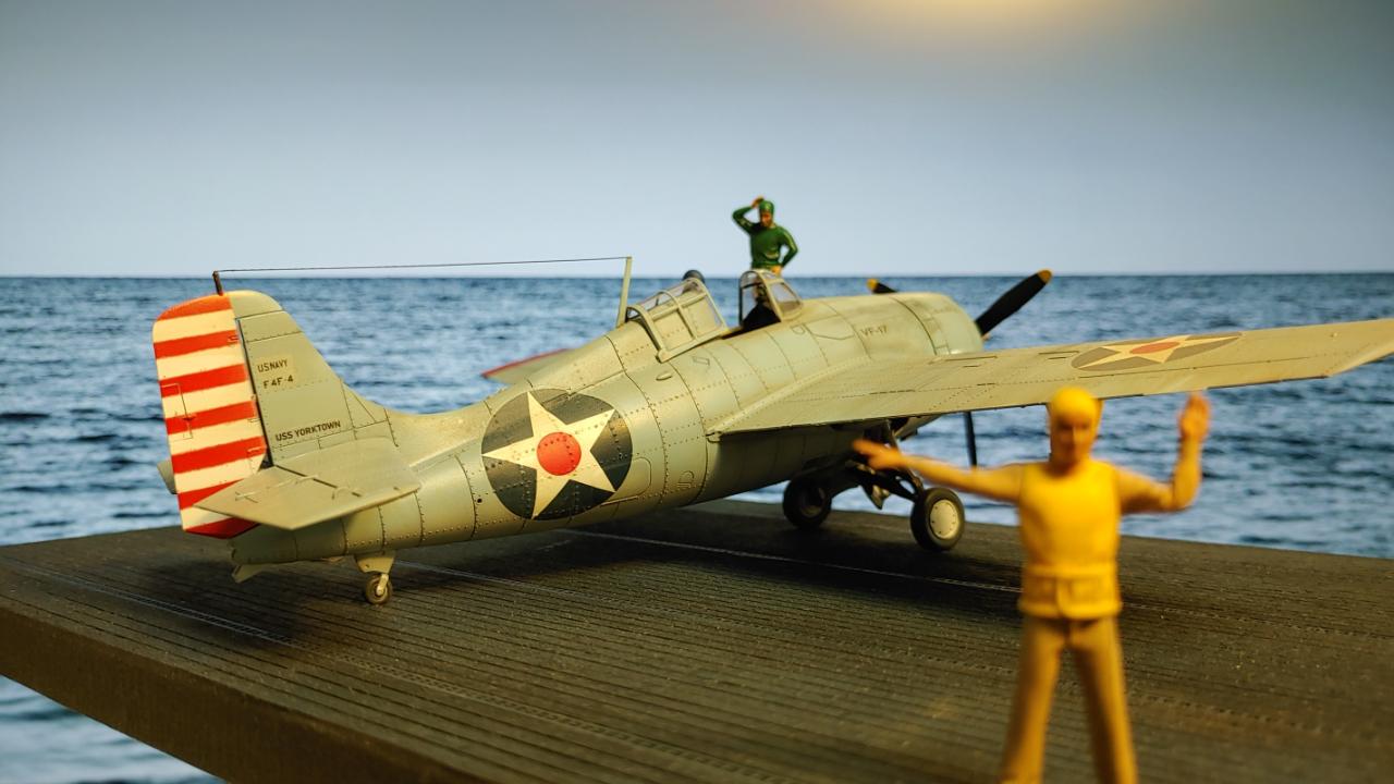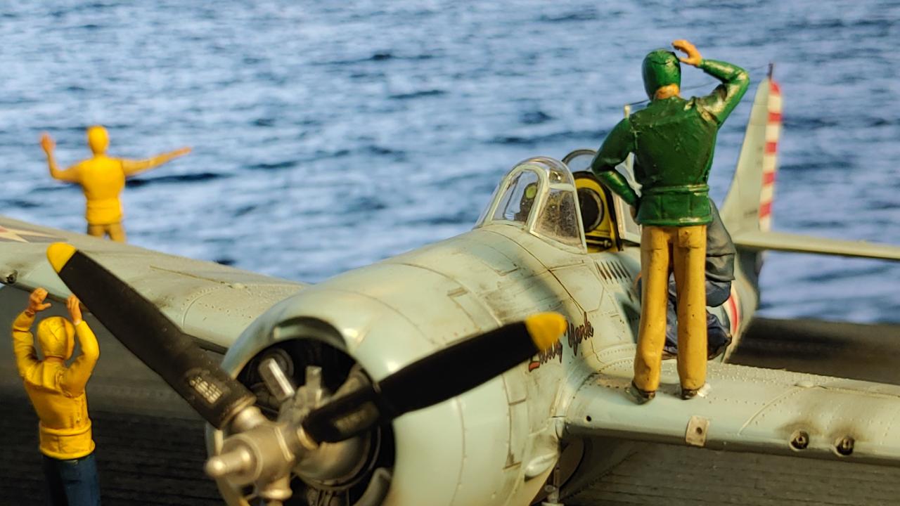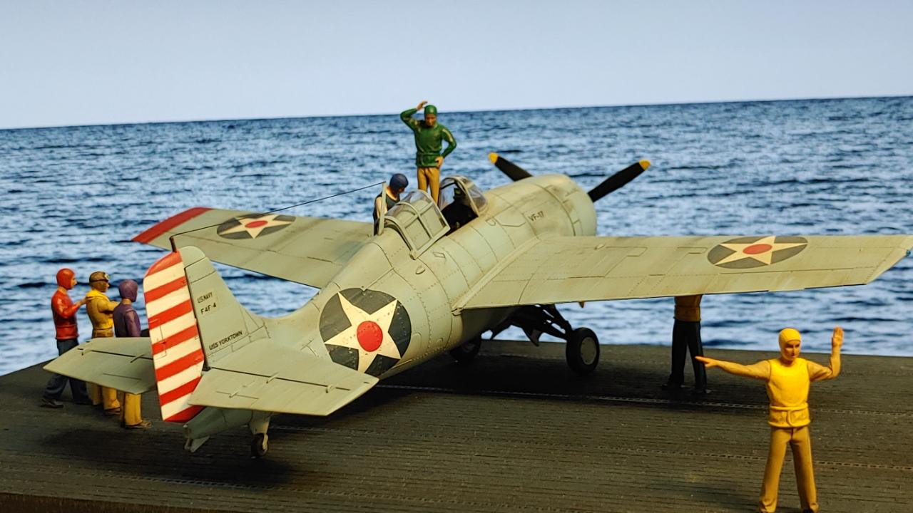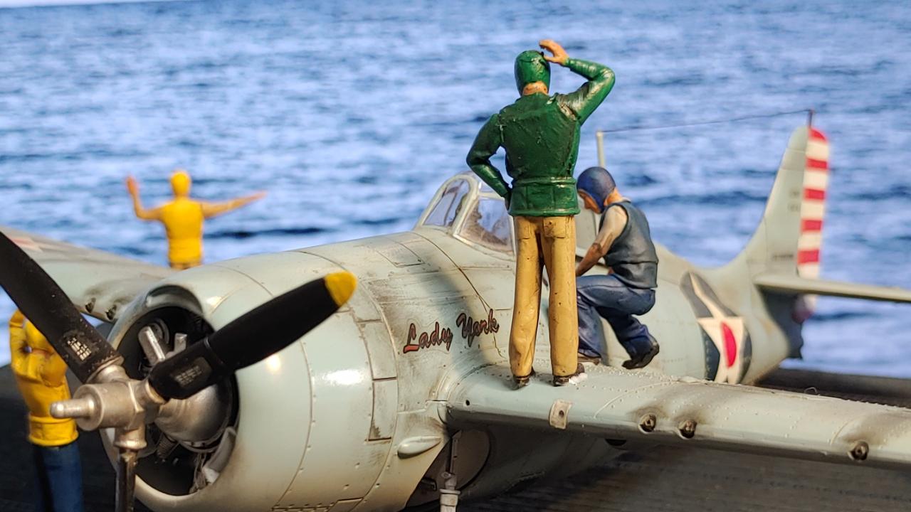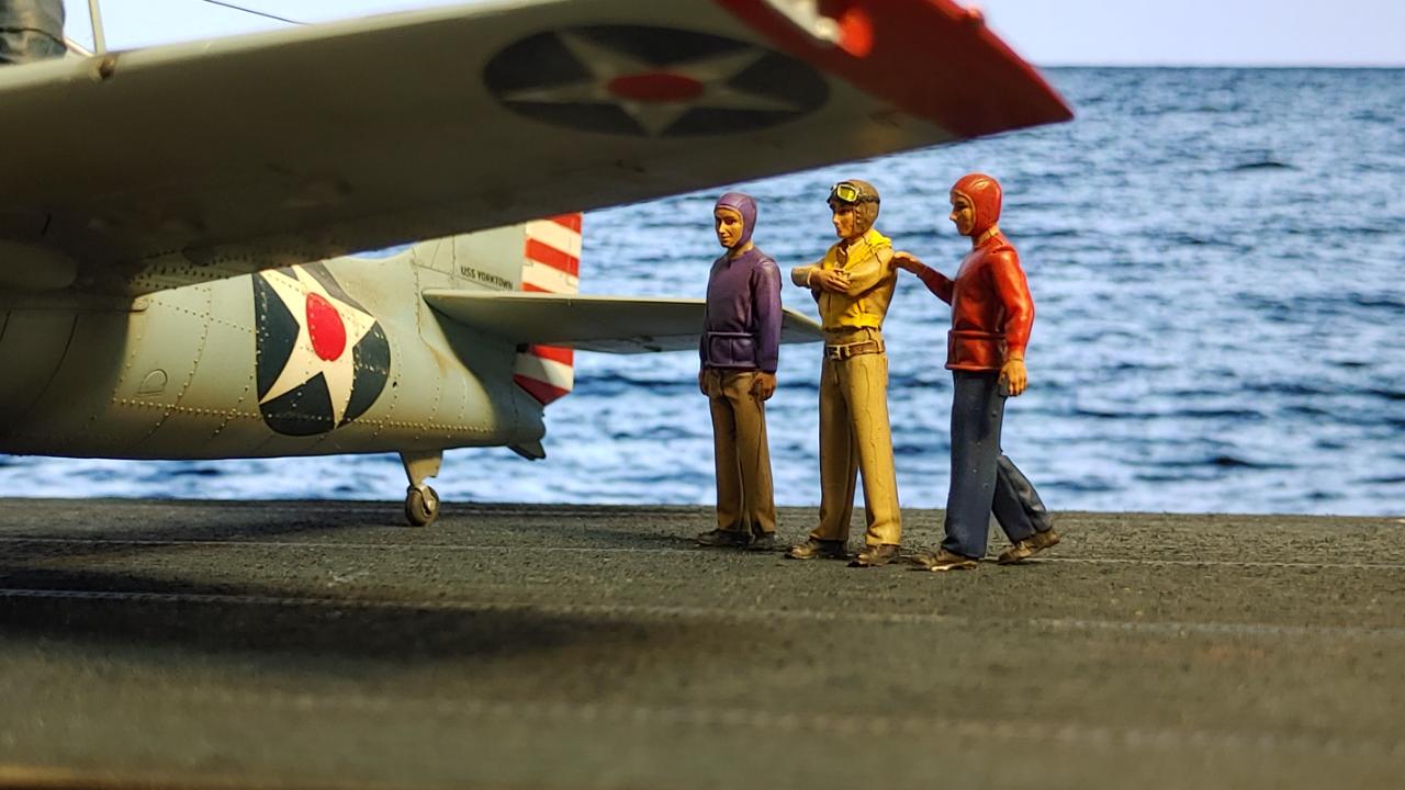 디오라마는 산호해 해전 직전인 42년 5월 3일 초계비행에 나선 주인공 편대가 붐앤줌으로 역시 초계비행을 나온 제로센 13기를 상대로 승리후 돌아와 첫 출격에 6기 격추로 원소티 에이스가 된 주인공을 위해 킬마크를 장식해주는 모습을 그려봤습니다...