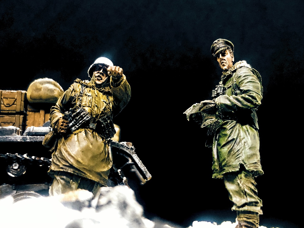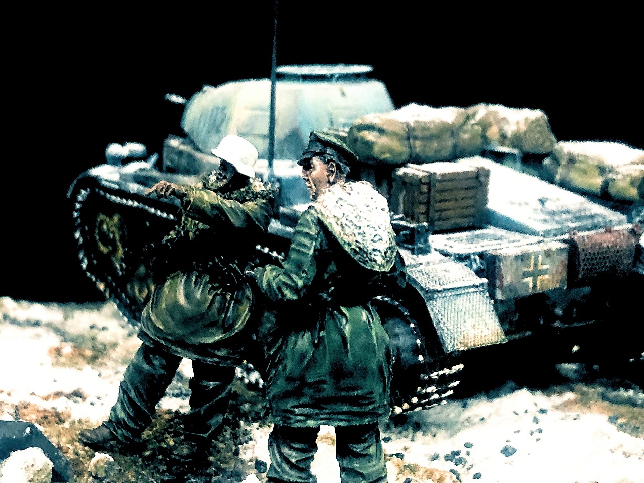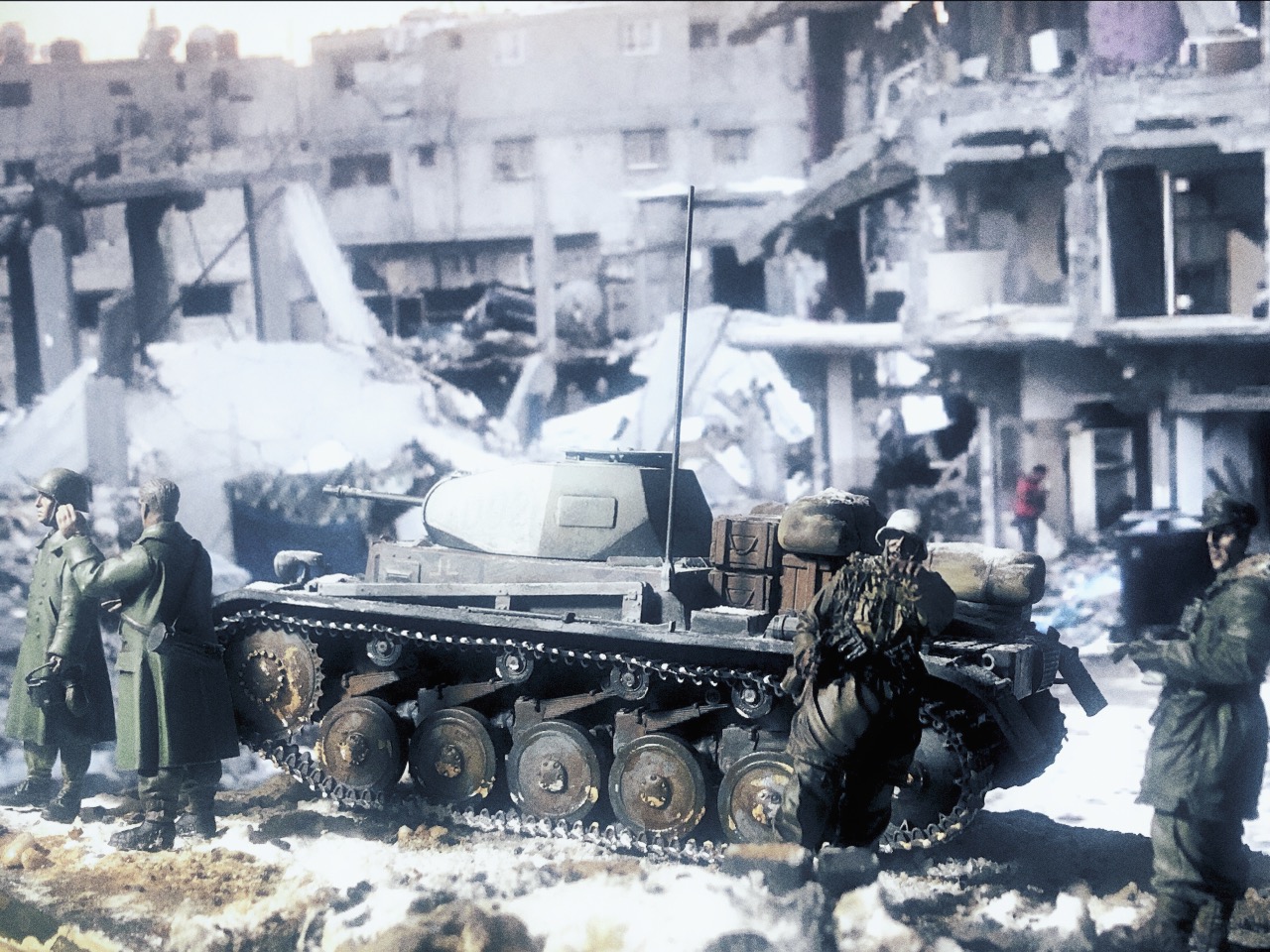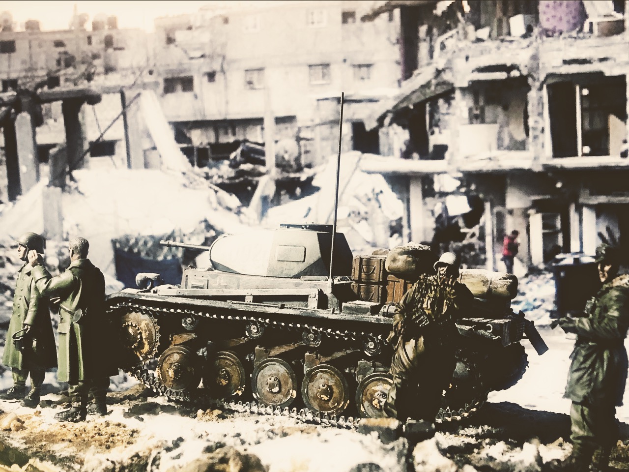피규어는 언제 구입한지 알 길이 없는 방구석에 굴러다니던 레진 인형들을 사용했고 베이스는 쓰고 남은 미니아트 사의 파괴된 거리 조각과 각종 지면 표현제, 정크 부품들 그리고 베이킹 파우더를 이용해서 만들었습니다.