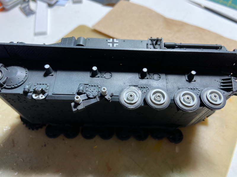 사용할 마킹을 정하고 그 설정에 맞추어 제작을 진행하던중, 궤도와 바퀴 부분에서 한가지 사실을 발견하게 됩니다. 실차자료를 보니 E형에 일반적으로 달렸던 38cm궤도가 아닌 1942년식 40cm입니다. 최후방이었으므로 신형부품 보급이 수월하게 이루어진것으로 짐작됩니다.
