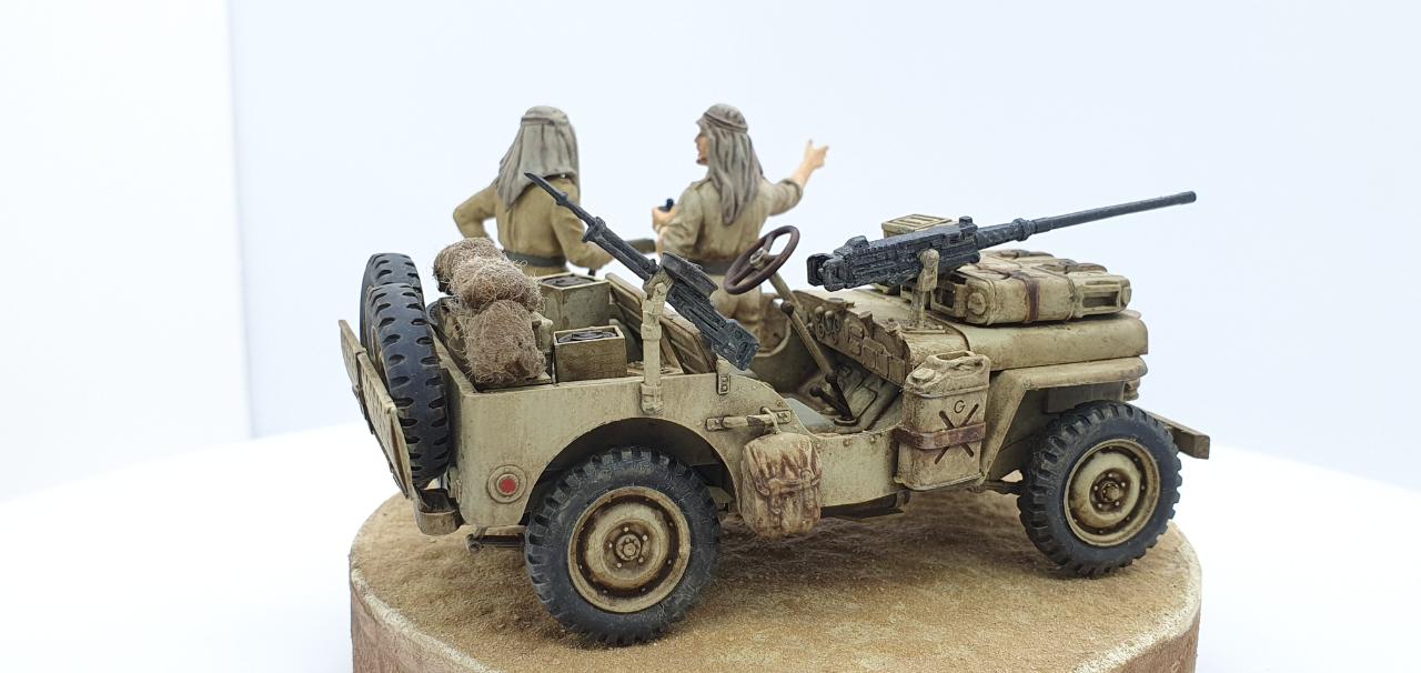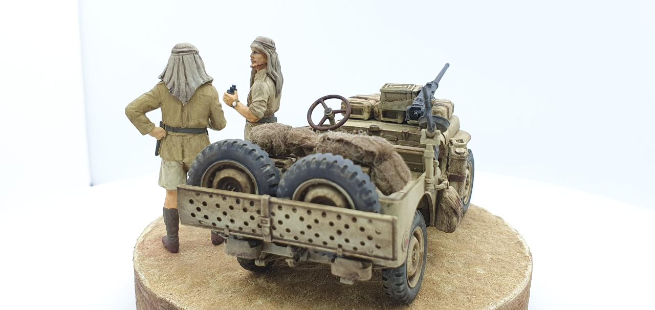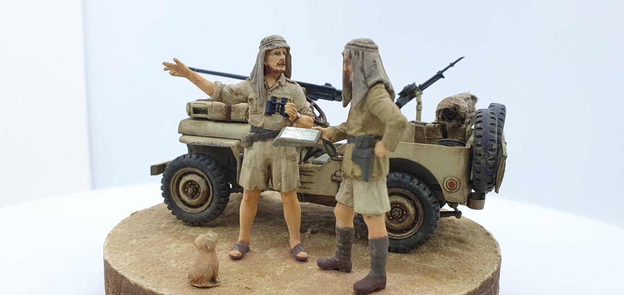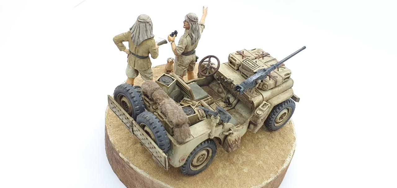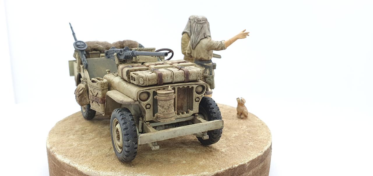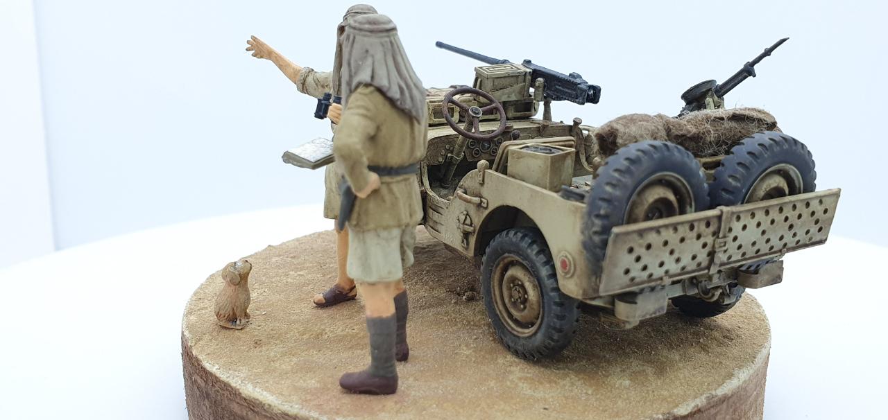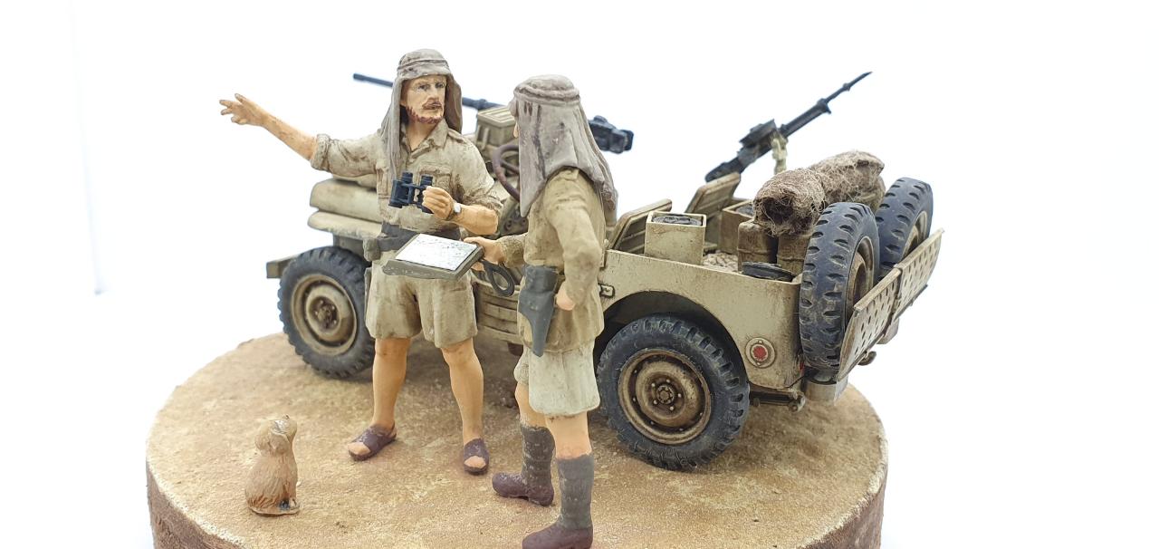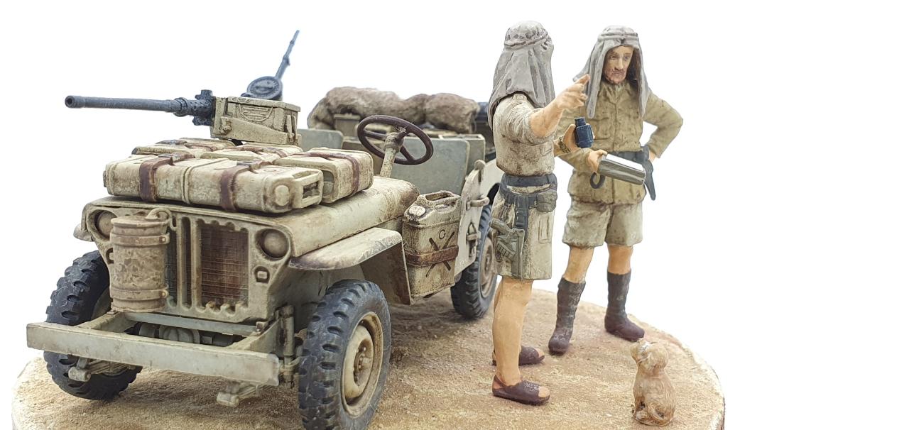 북아프리카에서 SAS 지프 한대가 길을 잃어버리고, 고민중인 상황을 재현하였습니다. 두 병사가 고민하며 의논 중인데, 데리고 온 멍멍이는 그 모습을 보면서 속으로 중얼거리고 있습니다. ‘Lost in Space!’ = ‘여기가 아닌감?’