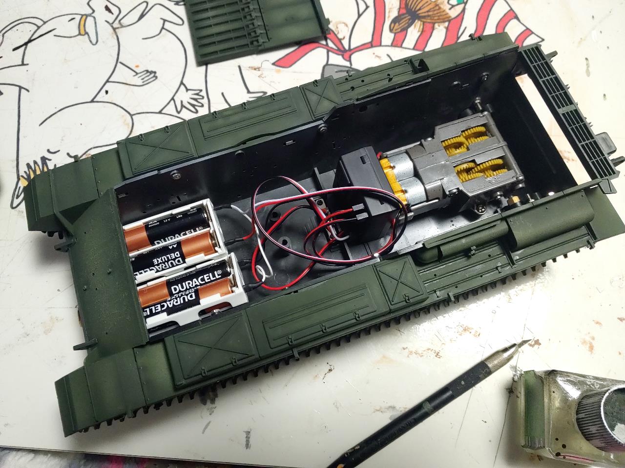 도색은 런너째 도색후 조립하고 도색에 손을 보았습니다.타미야 흰색서페이서를 칠한뒤 타미야 락카스프레이 다크그린을 종이컵에 덜어 에어브러쉬에 넣고 서페이서의 밑색효과를 노려 자연스럽게 그라데이션해가며 칠해주었고 락카 카키를 전체적으로 드라이브러쉬합니다 이때 비비면 은은하게 나올정도로 도료를 충분히 건조후 털이 뭉치지 않게 다른곳에 비벼가며 털을 흩어지게한후 뭉게줍니다.털이 뭉치면안되고 너덜 너덜 흩어져야됩니다 카키색이 먼지가 낀듯한 상태에서 계속반복하여 원하는 색감이 나올때 까지 전차에 전체적으로 뭉게줍니다.그다음 옐로우와 다크그린을 섞어 튀어나온부분에 드라이브러쉬 하듯이 칠하고 더욱더 옐로우를 섞어 가장밝은곳을 칠하고 마지막으로 옐로우원색으로 하이라이트가 되는부분을 살짝 칠해줍니다.특별한 기술도 없고 피그먼트도 없는 저로서는 이방법으로 진행하는게 가장 만만했습니다. 조종사가 없어 인형은 방에 굴러다니는 독일군 인형을 대충 실어 보았습니다그럼 즐감 하시고 주행 동영상은 나중에 수다방에 올리겠습니다.