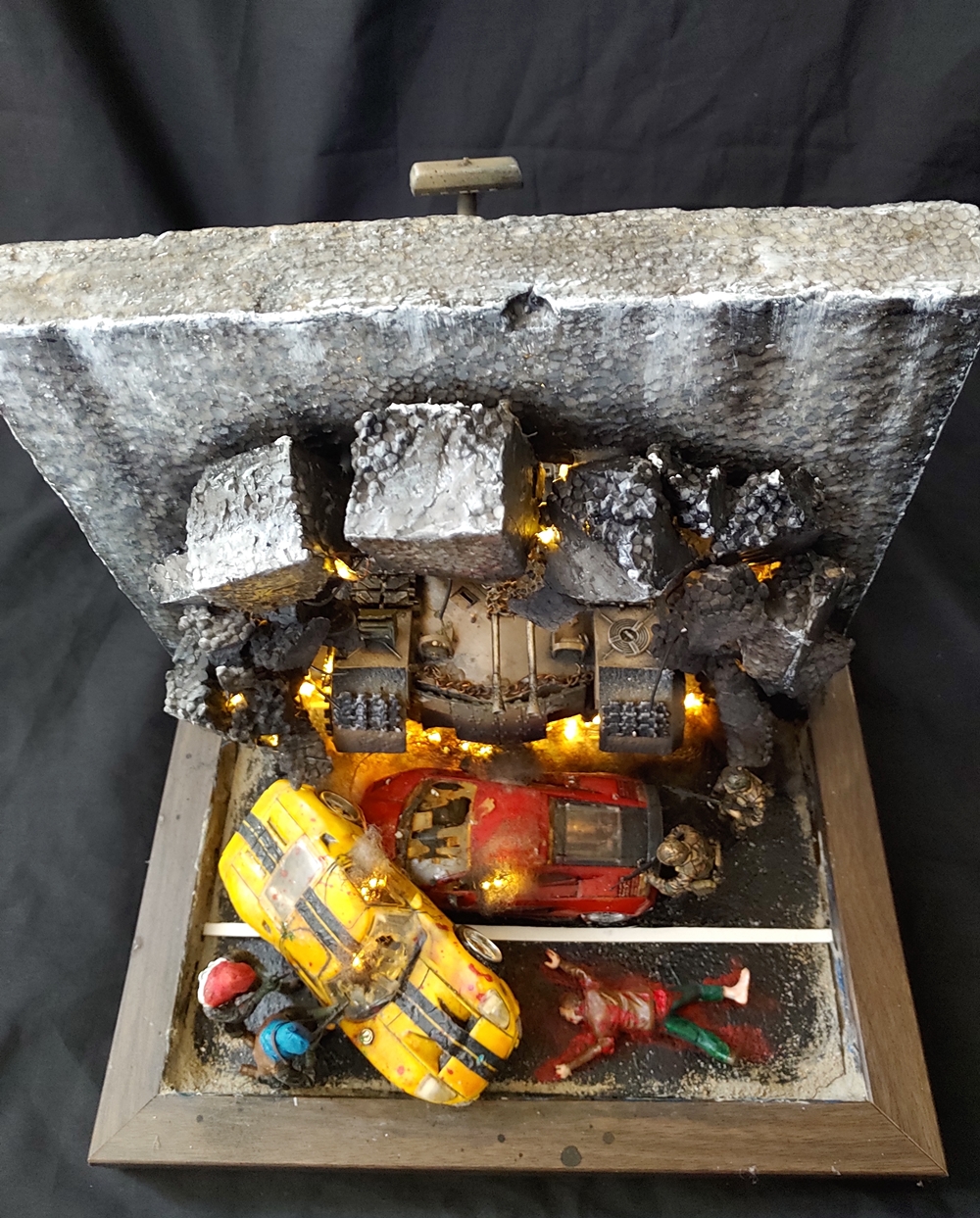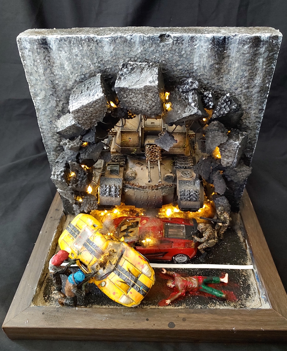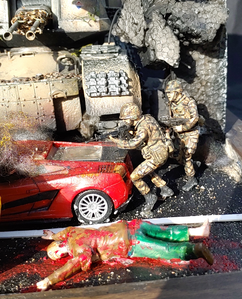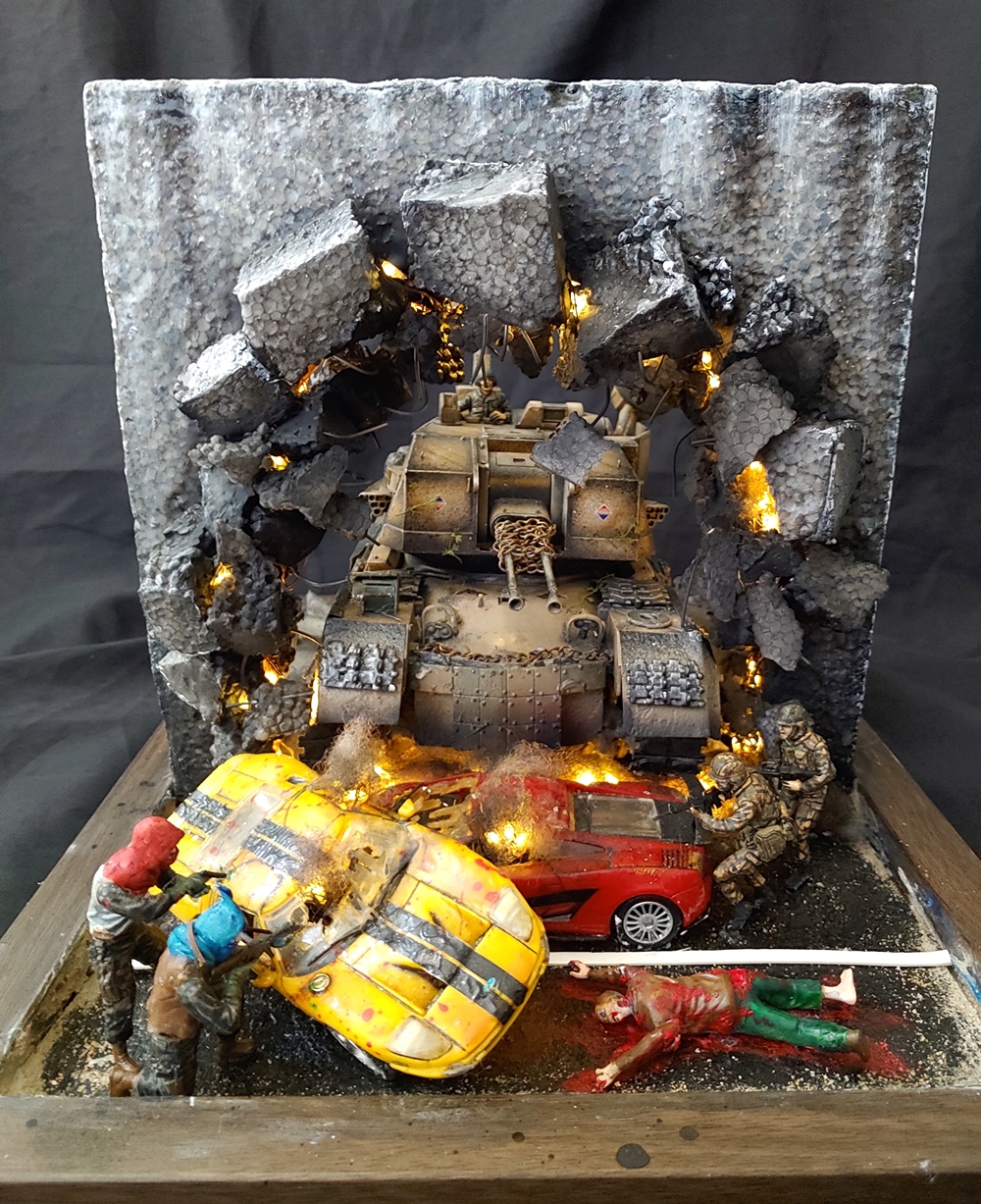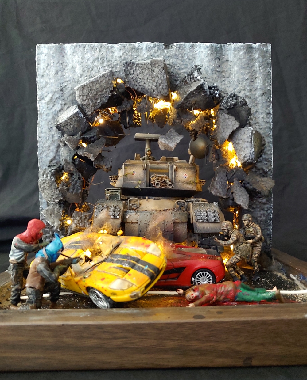 복면쓴 인형은 이리저리 개조및 자작했고 건물의 섬광은 다이소 3000원짜리 led 조명을 활용했습니다.벽은 고민을 많이했는데 대리석 느낌을 내려했는데 딱 맘에 들진않군요 스포츠카?는 아카데미 1/48로 스케일이 맞진않지만 그런대로 마춰 보았습니다.철근은 철사를 박아주었습니다.