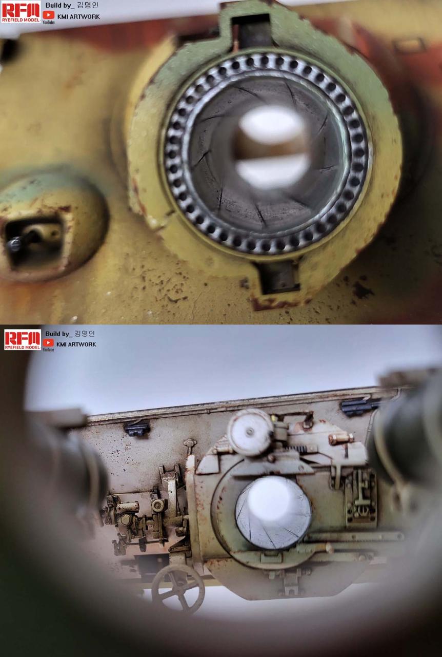 이킷트는 포신 내부에 강선이 에칭을 돌돌 말아 넣어표현되는게 특징입니다. 그리고 포탑 상판이 클리어 파츠로 구성되있는데 사실감이 떨어져서 저는 도색으로 덮는대신 열고 닫을 수 있게 작업했으며