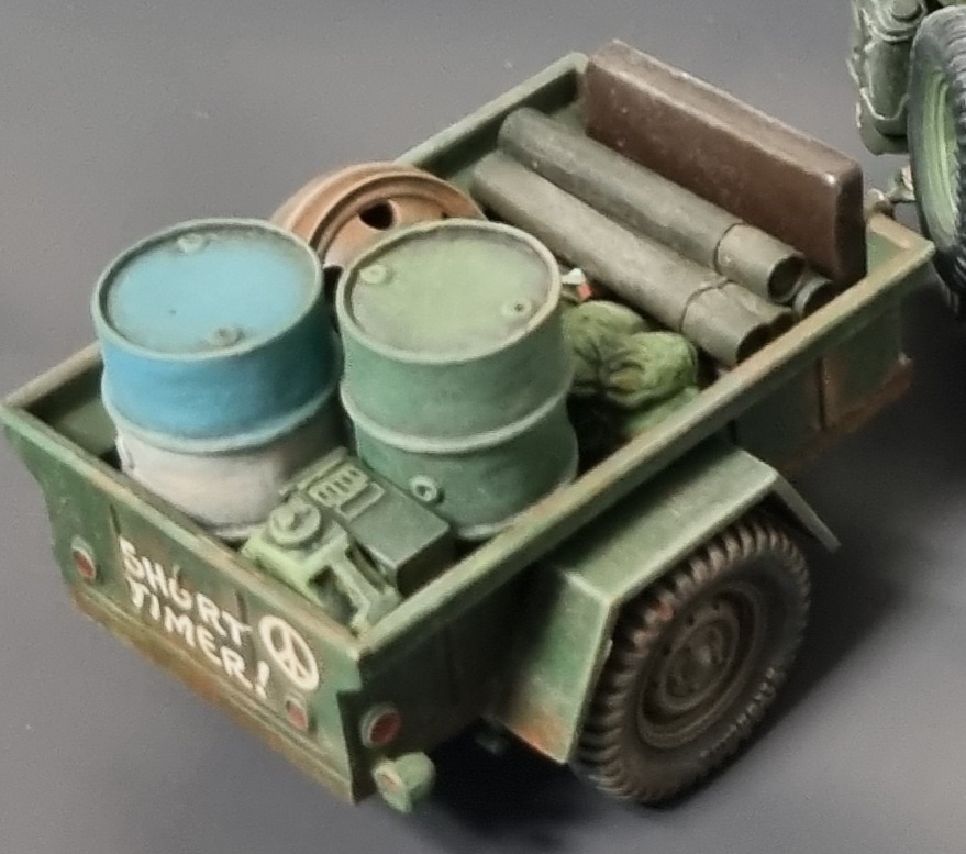트레일러 뒷면에 낙서들을 데칼로 구현해주었습니다. 드럼통 하나는 유화 흰색 하늘색으로 좀 덜 지루하게 칠해주었습니다.