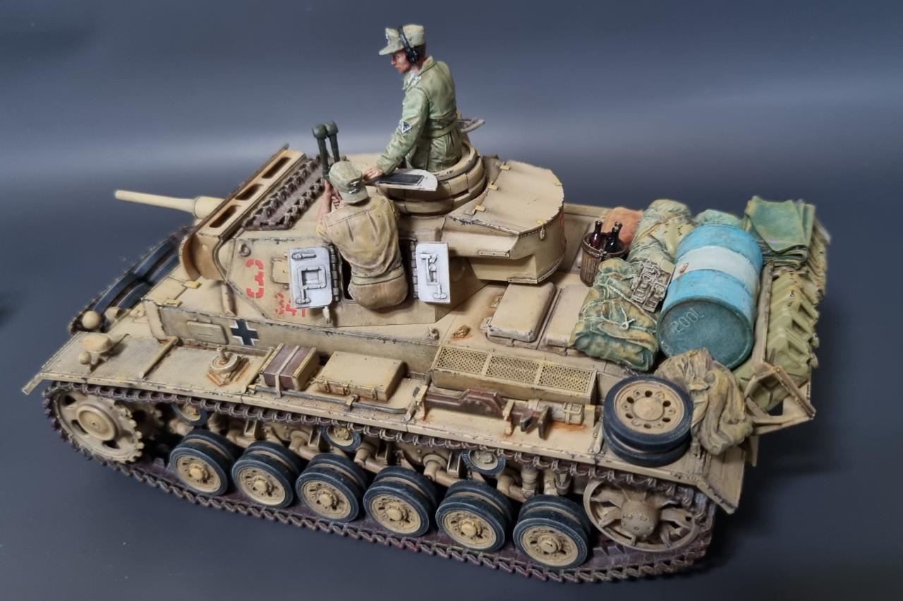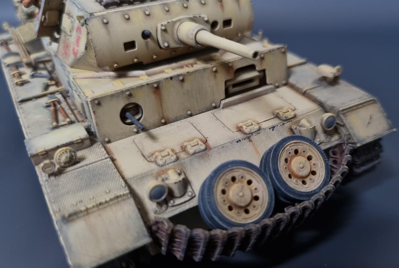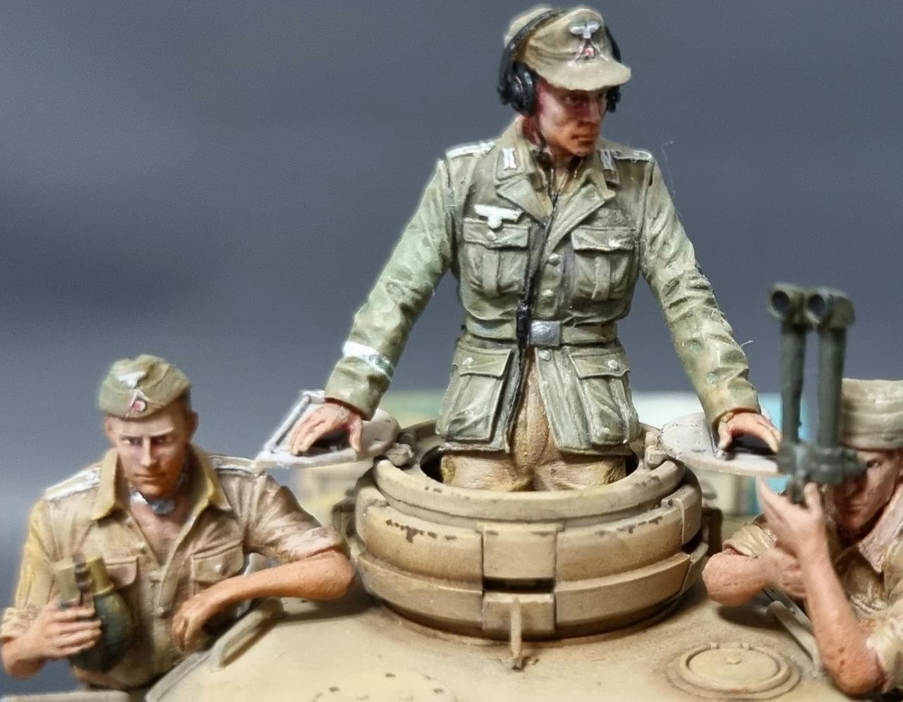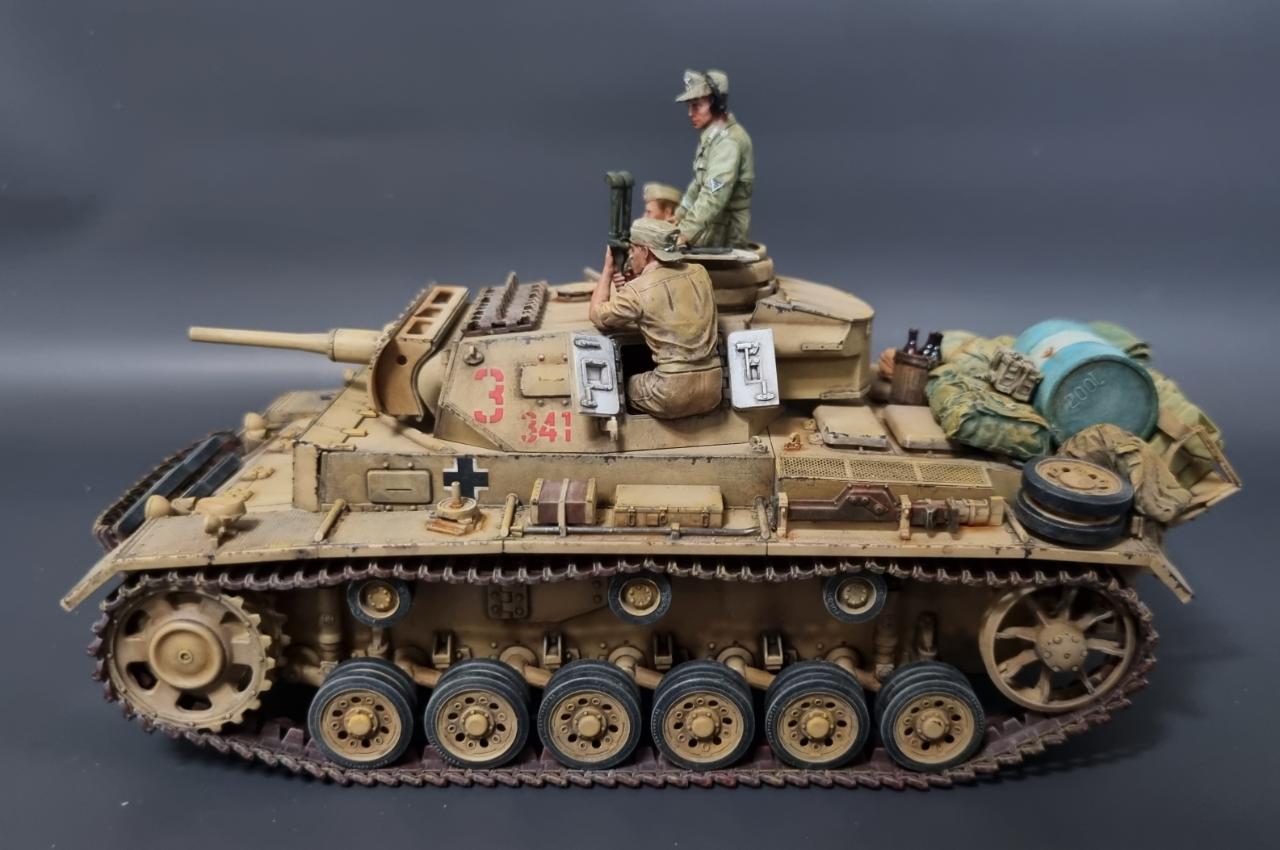 전차병의 옷은 실물 아프리카군단 상의의 색을 참조해서 도색했습니다. 남는 궤도는 나름 변화를 줘본답시고 중간에 핀을 일일이 뚫어서 얹어보았습니다.