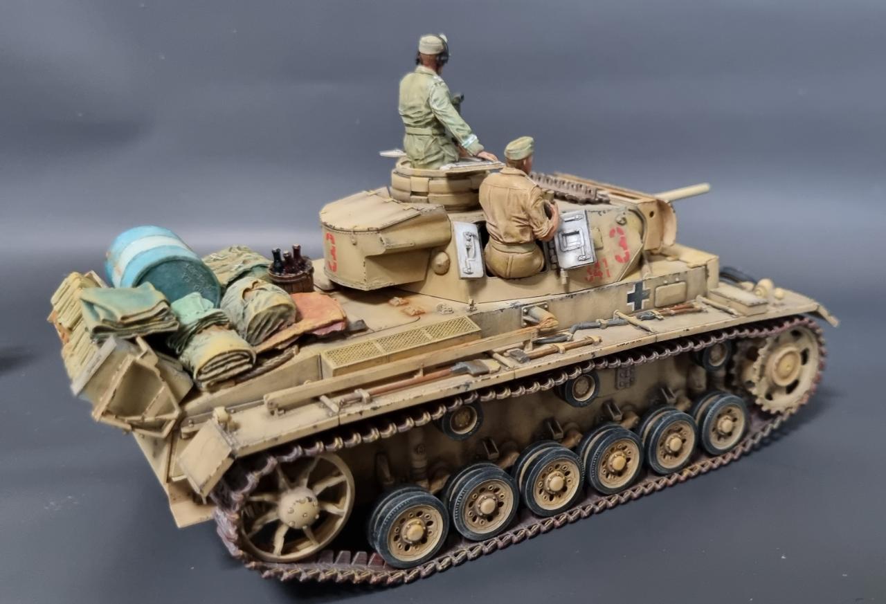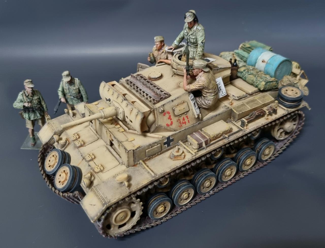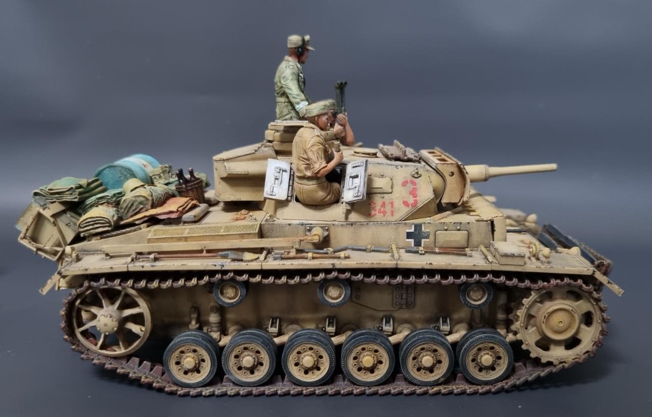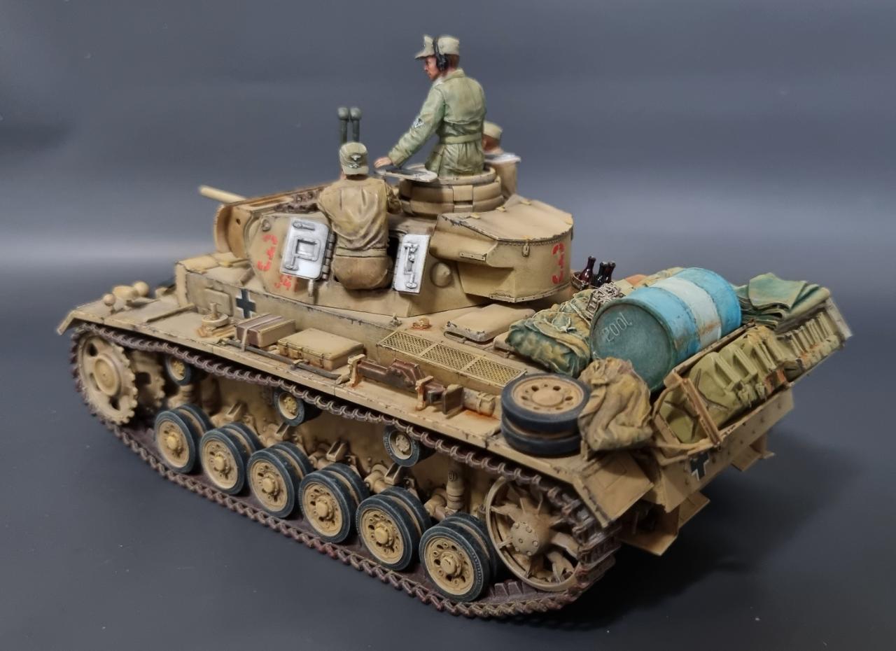 전차병의 옷은 실물 아프리카군단 상의의 색을 참조해서 도색했습니다. 남는 궤도는 나름 변화를 줘본답시고 중간에 핀을 일일이 뚫어서 얹어보았습니다.