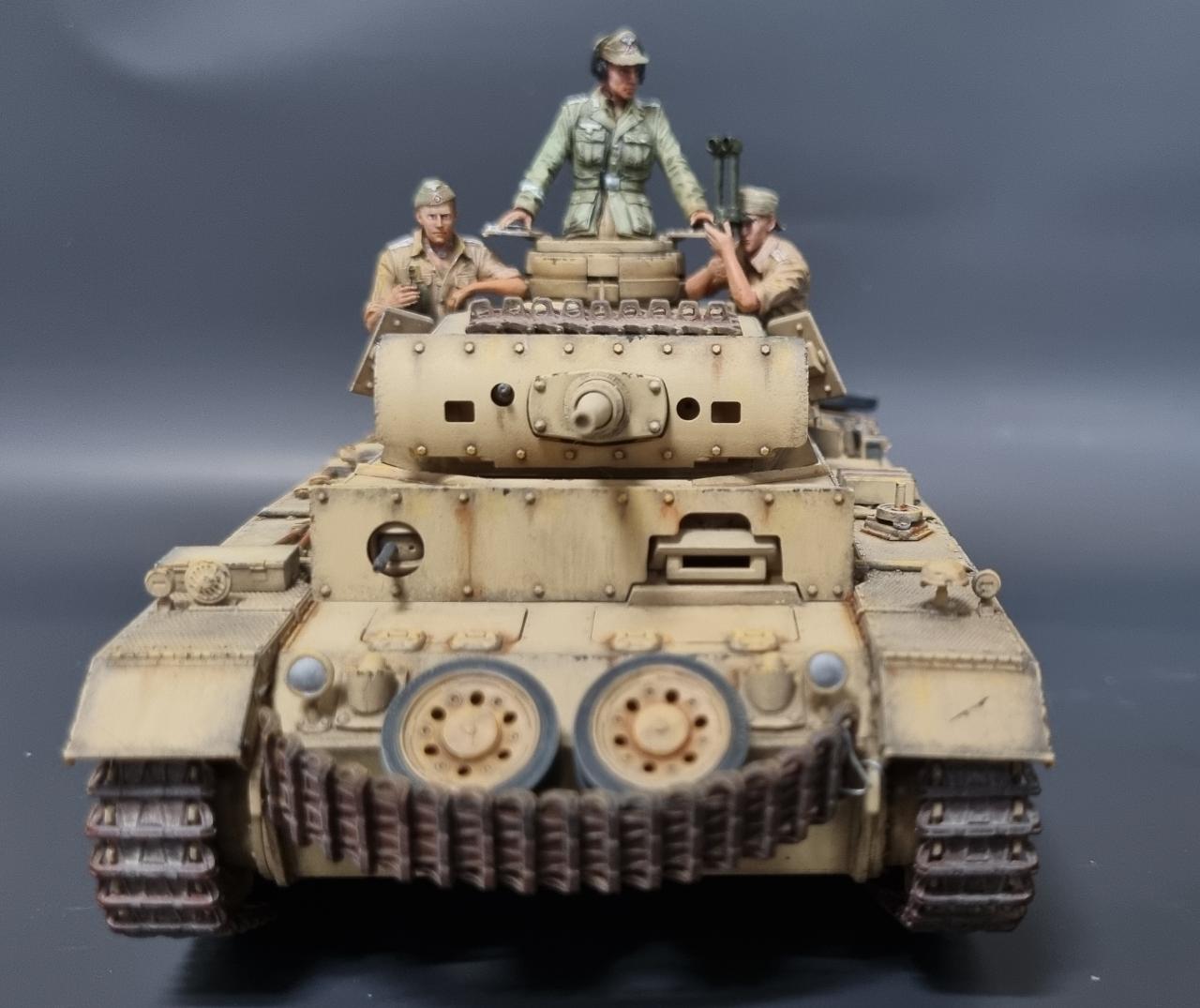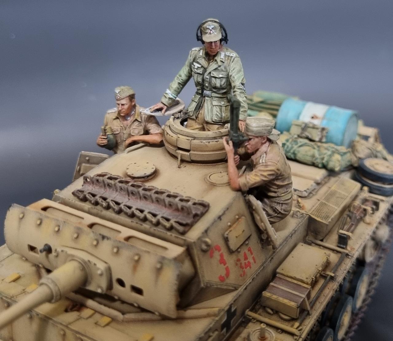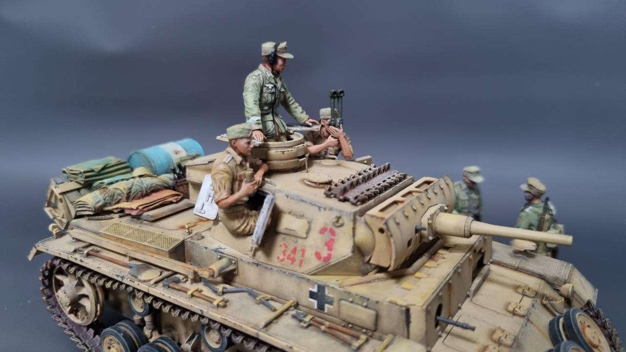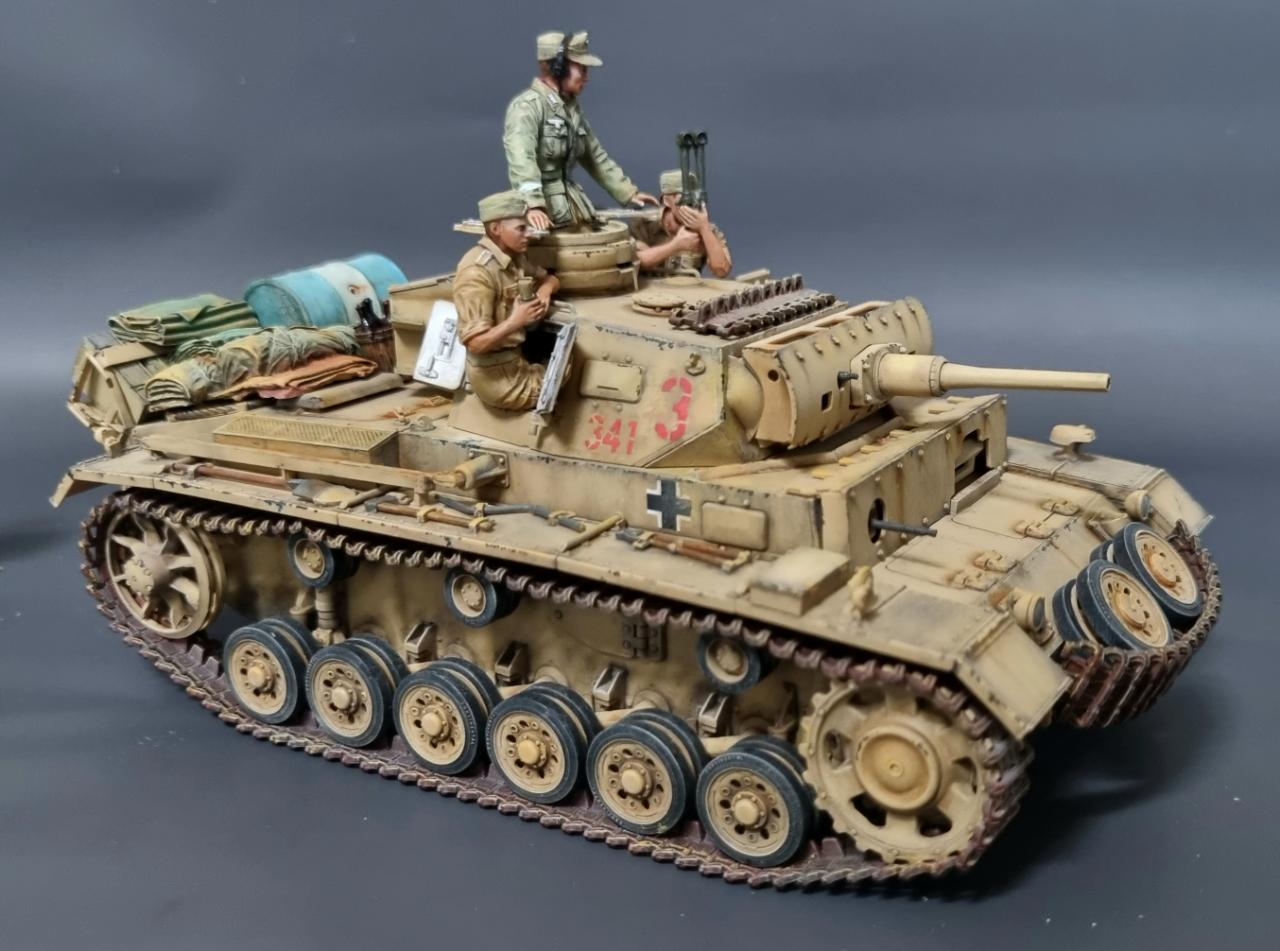 전차병의 옷은 실물 아프리카군단 상의의 색을 참조해서 도색했습니다. 남는 궤도는 나름 변화를 줘본답시고 중간에 핀을 일일이 뚫어서 얹어보았습니다.