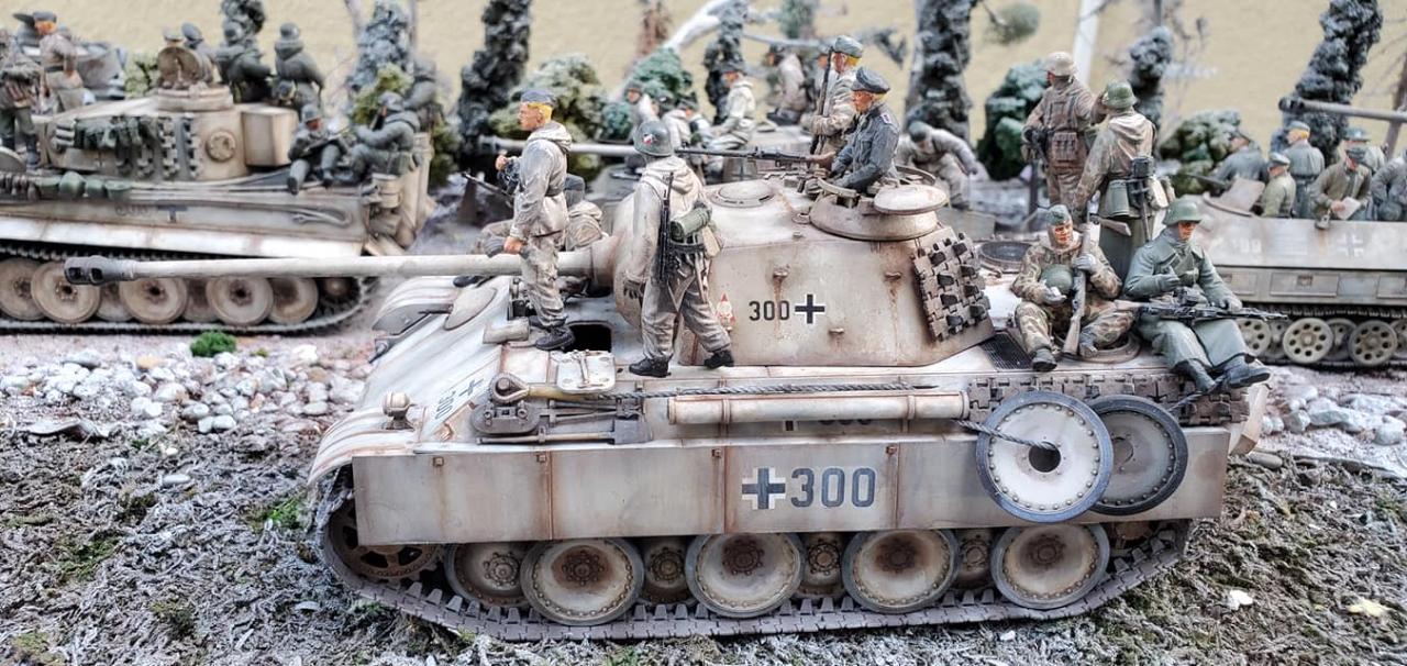 판터 A 형 입니다... 이것은 타미야 구형 판터네요.. 4년전에 만든 것을 동계 위장을 추가하고 피규어를 탑승 시켰습니다.. 참고로 데칼이 특이한데.. 예전에 단품으로 만들적에.. 에어로 스타일의 로비치 도장을 해 보겠다고. 그레이색을 밑색으로 삼고, 건담 데칼과 자작 스네이크 데칼을 추가 했습니다
