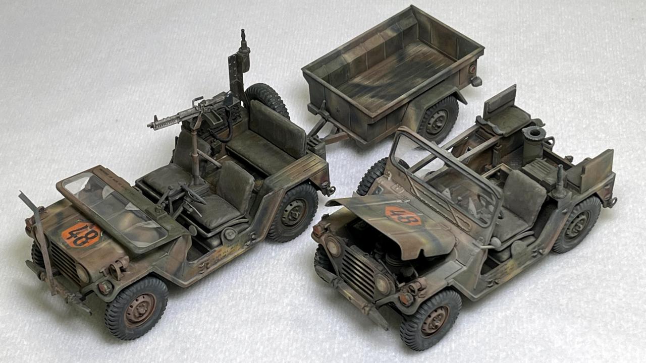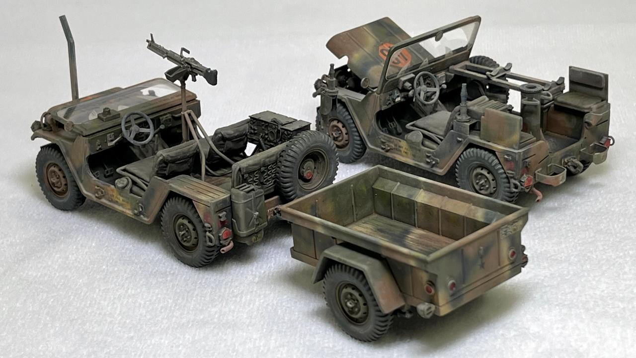 미군의 차량들은 위장패턴이 정해져있기 때문에, Vietnam Green을 칠해준 후 연필로 나머지 색이 들어갈 패턴들을 살살 잘 그려준 후 그 위에 아주 가늘게 라인을 뿌리고 면을 채워주는 방식으로 칠했습니다. 그래서 두대의 차량이 동일한 위장무늬로 맞춰져 있습니다. 요런게 패턴을 맞춰서 칠한 차량의 큰 보람이지요 ^^