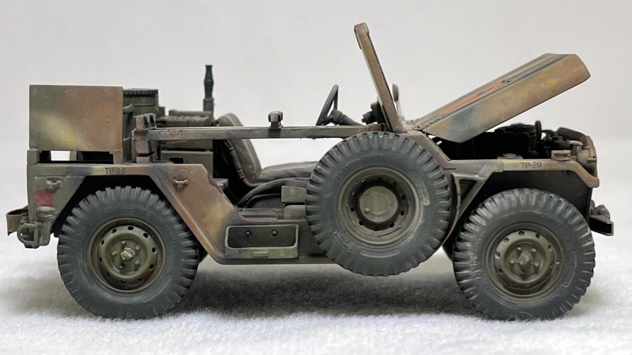 이 차량은 엔진후드가 살짝 들어올려진 형태로 만들어져있는데, 실물은 군용이어서 그런지 앞유리까지 확 제끼지 않으면 이렇게 중간만큼 올라가있는 고정은 없습니다. 디오라마에서는 한 병사가 엔진후드를 들고 내부를 들여다보는 장면을 연출하기 위해서 요 각도로 만들어주었습니다. 엔진후드 및 엔진부품들은 모두 Verlinden의 부품들을 시용했는데, 이 역시 아카데미과학의 신금형키트를 사용하면 거의 동일하게 재현하실 수 있습니다.