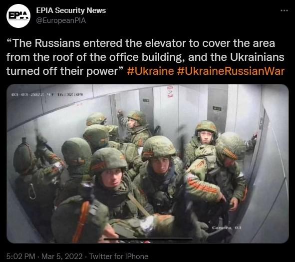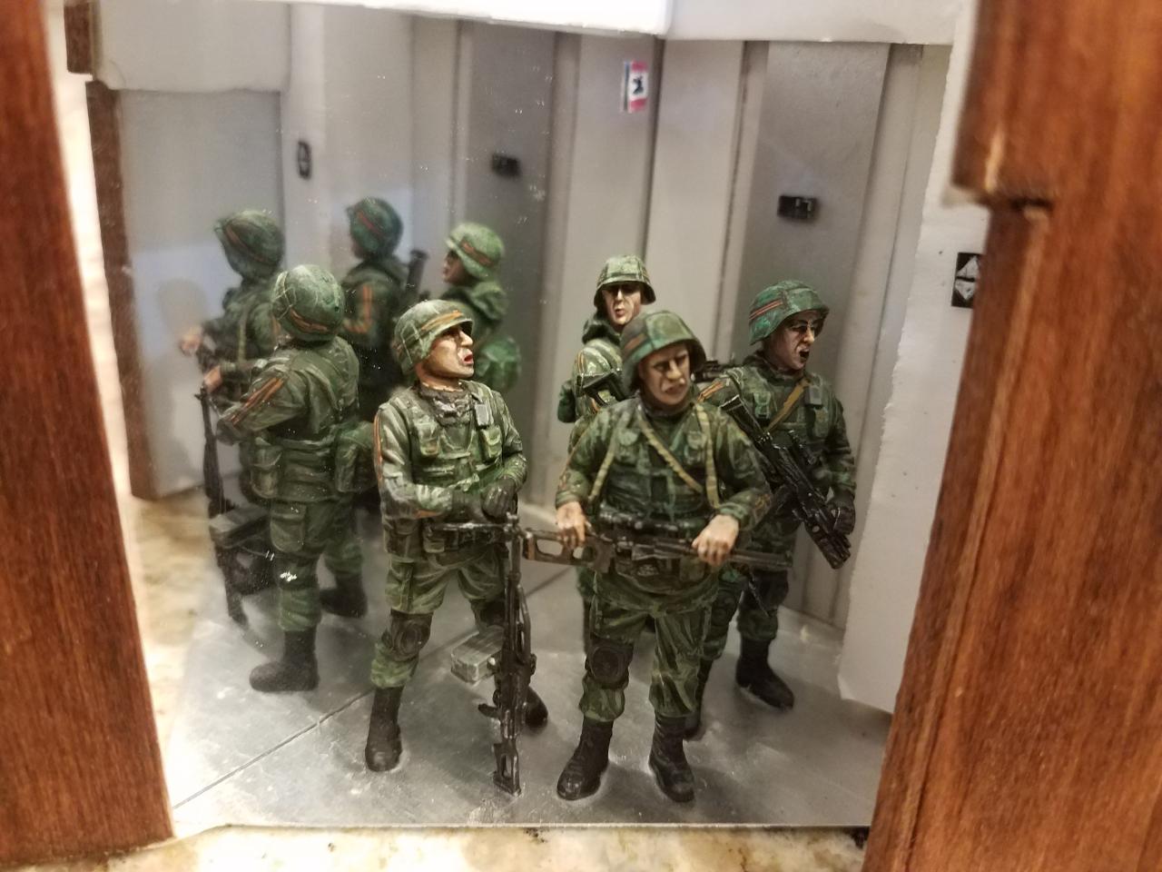 몇몇 해외 언론에는 '엘레베이터 안에 러시아 공수부대원 10명이 갇혔다' 라고 종종 보도되었는데 사실 다섯명이지요. 거울에 비친 뒷모습때문에 10명으로 보인다는 사실.