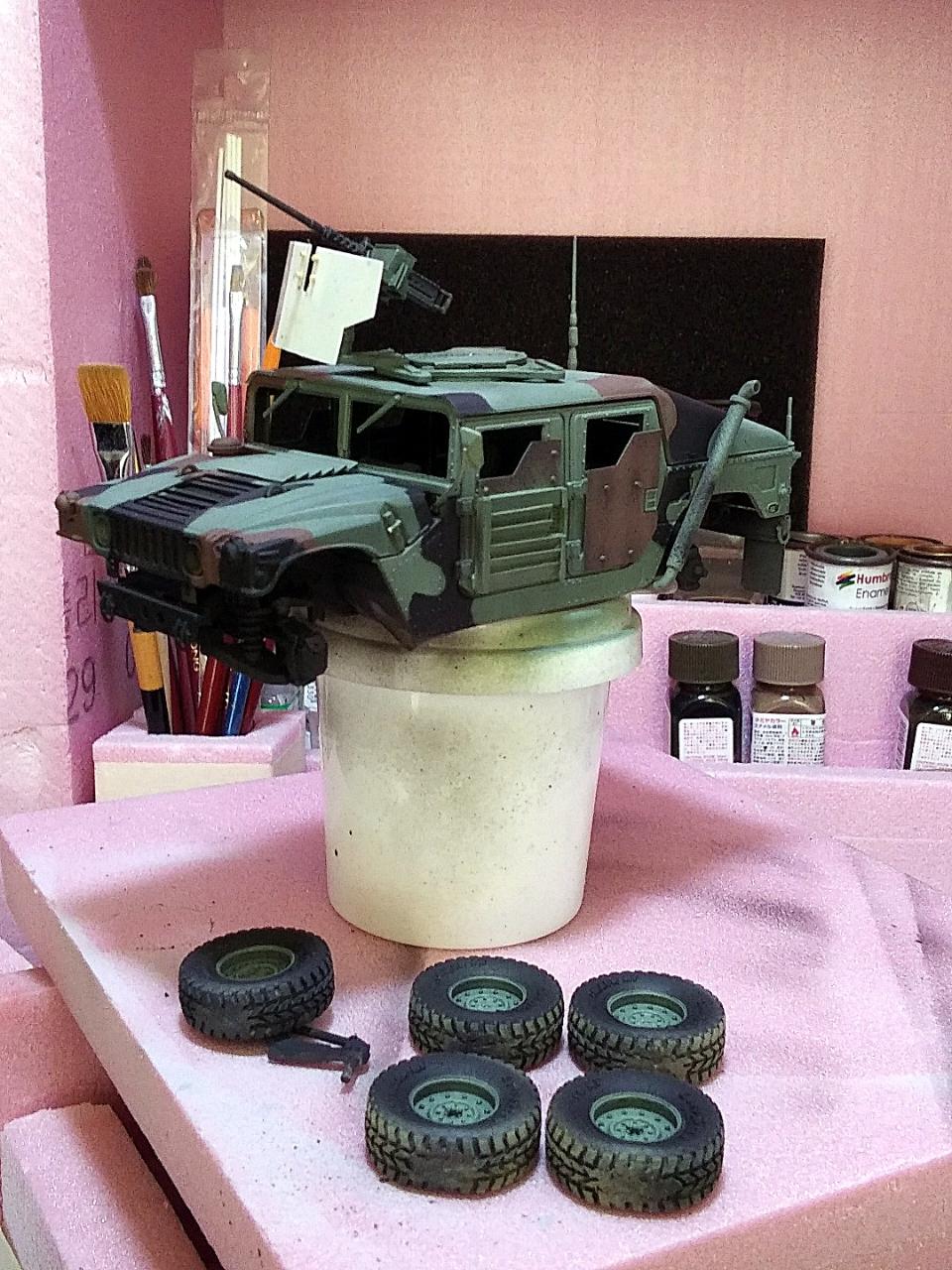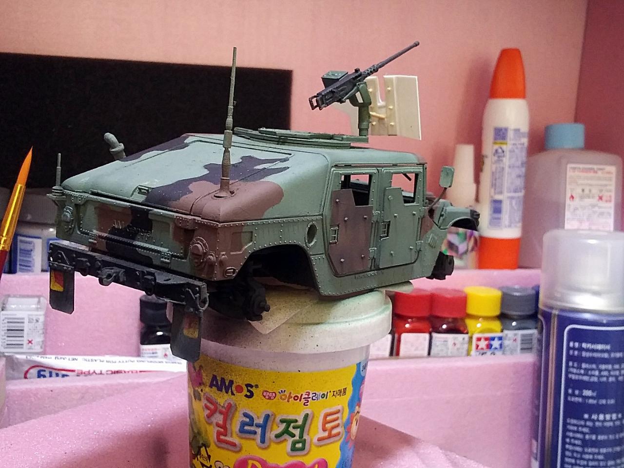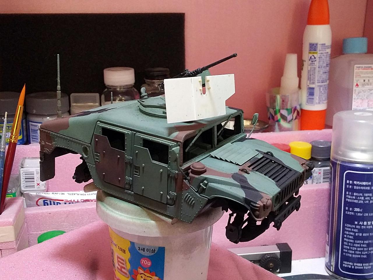 도색 작업중 사진을 보니 뒷 범퍼 수정한 것을 깜빡했네요. 아카데이 신판 장갑형 HUMVEE 범퍼를 참조해 비스무리하게 만들어 스페어 타이어를 끼웠습니다.