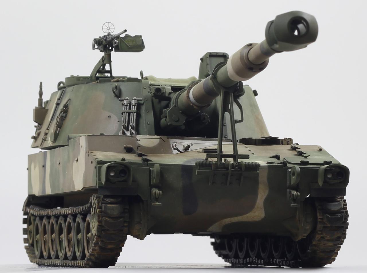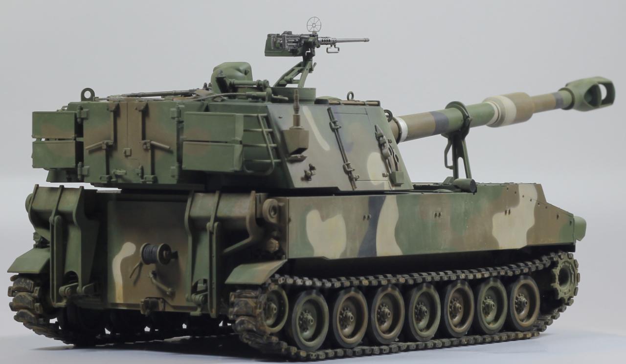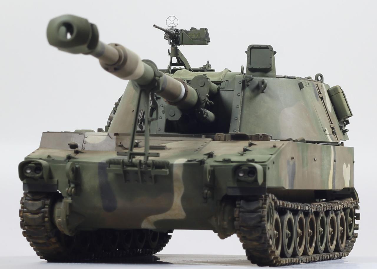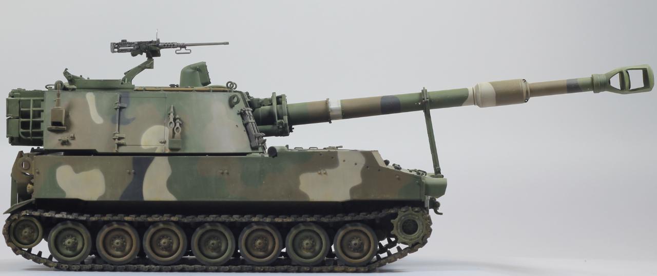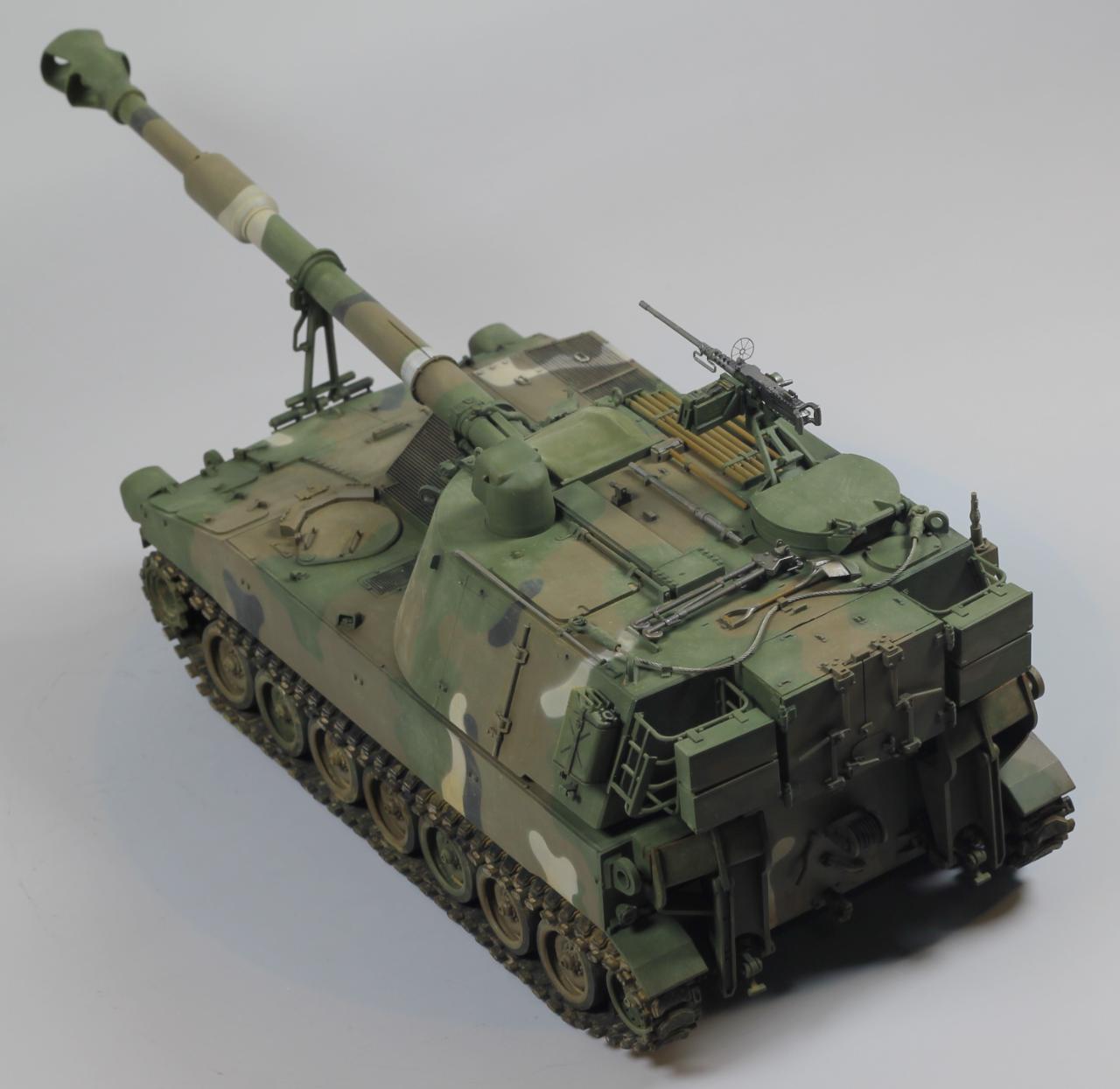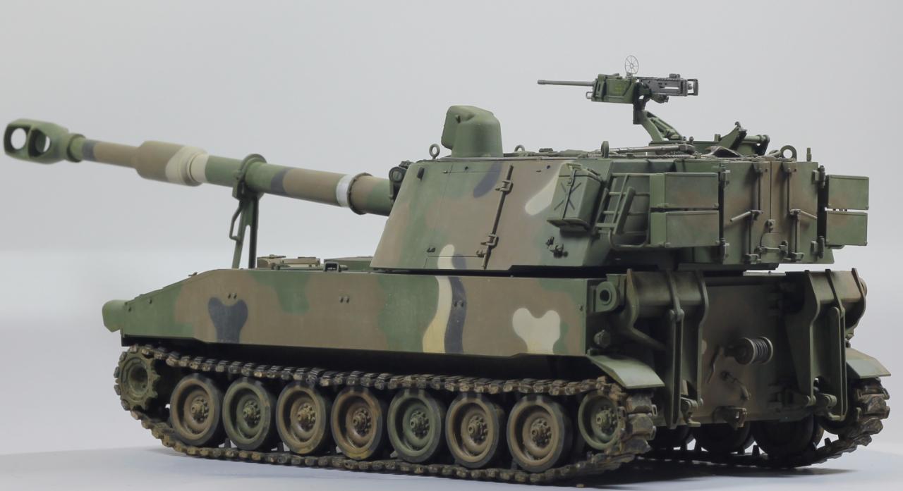 AFV사의 M109A2 킷으로 한국 육군 K55 버전으로 만들었습니다. 두 차량의 차이는 여러 점이 있겠으나, 안테나 마운트를 포탑 우측 후부로 이동시키는 정도만 하였고, 도색은 한국군 특유의 4색 위장무늬를 적용 했습니다.