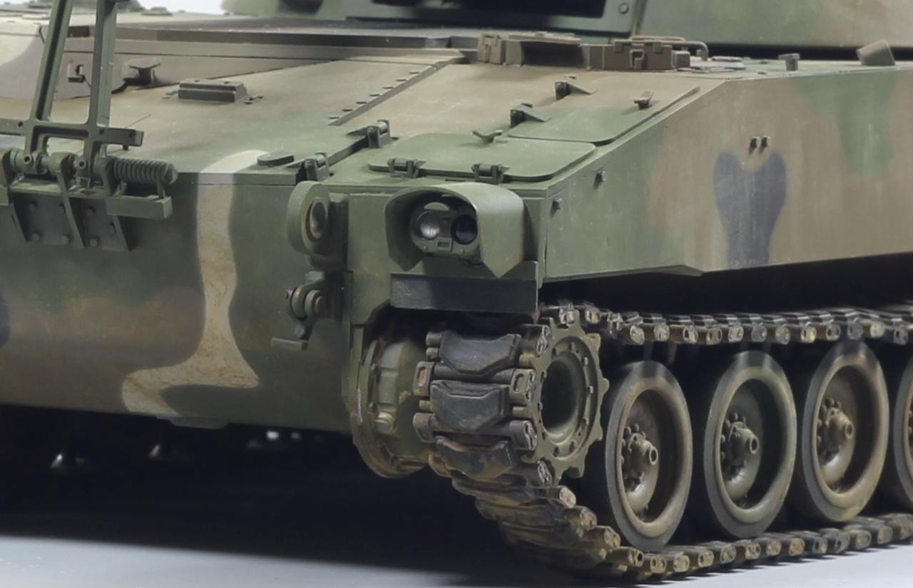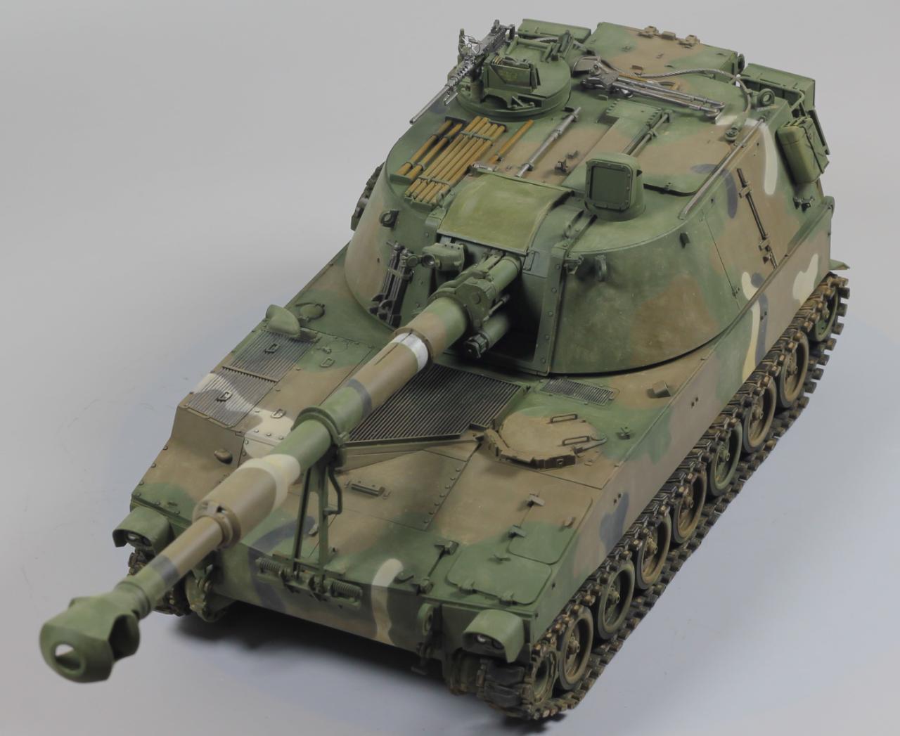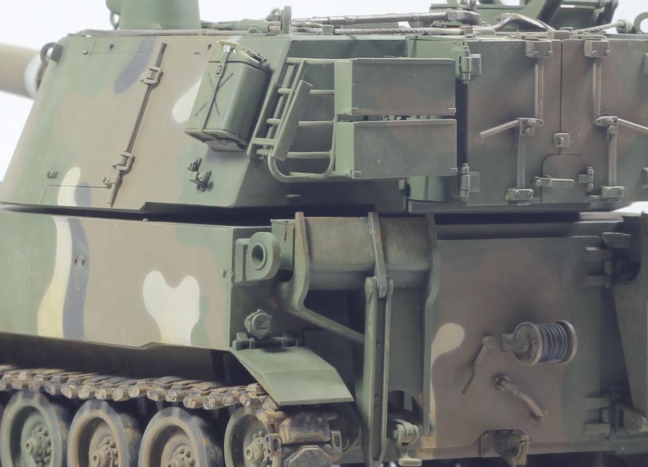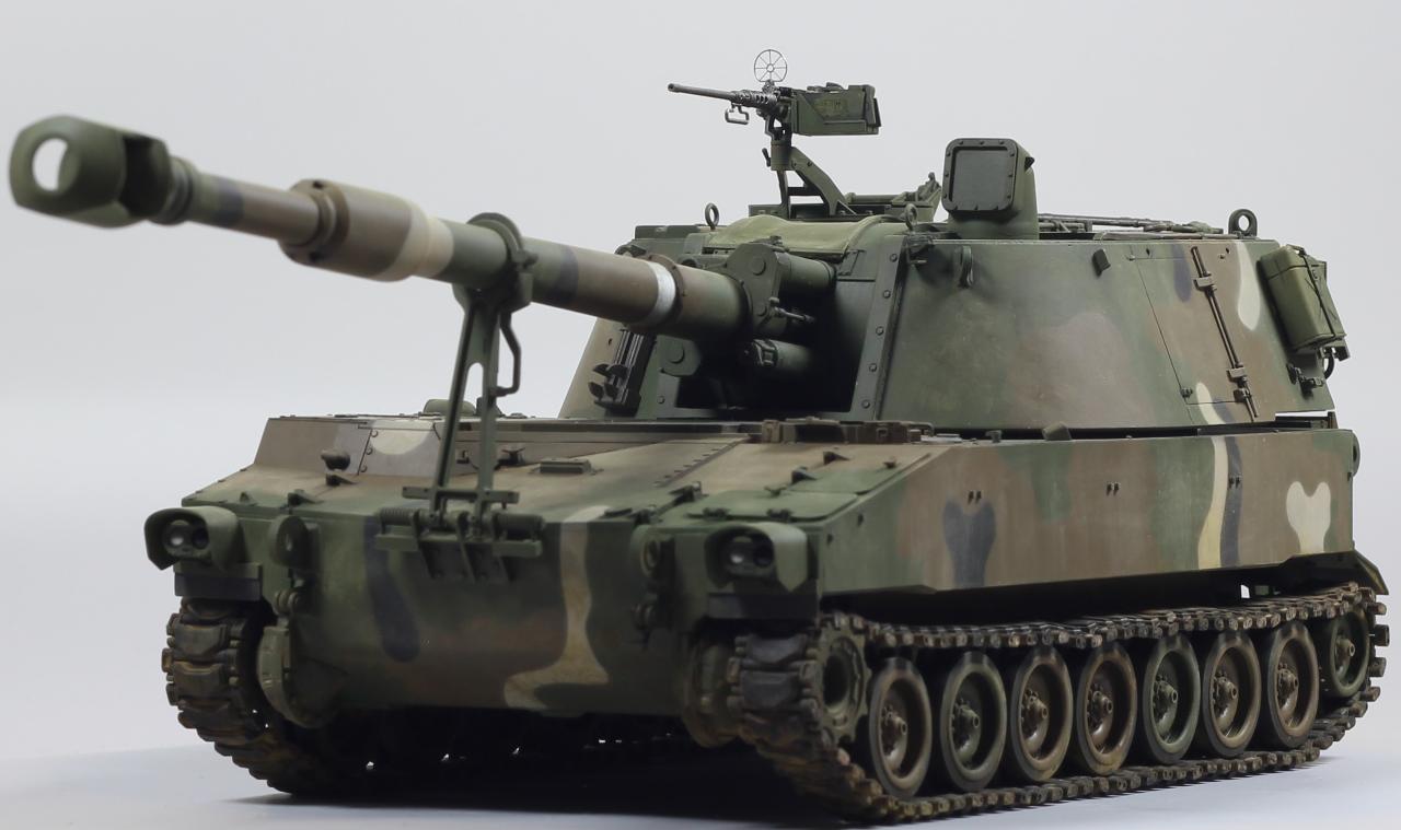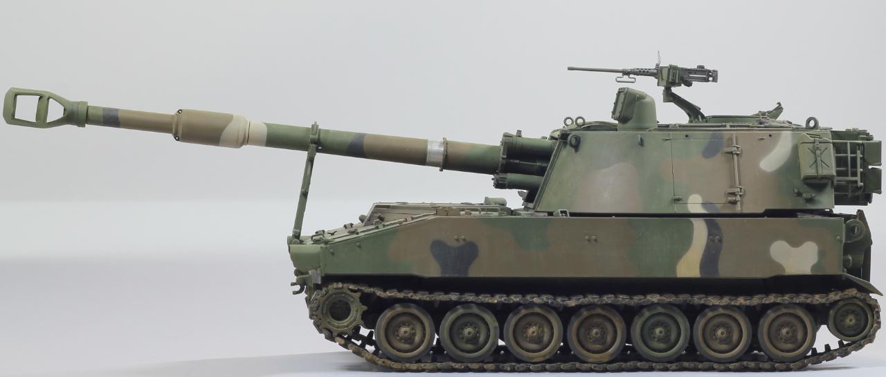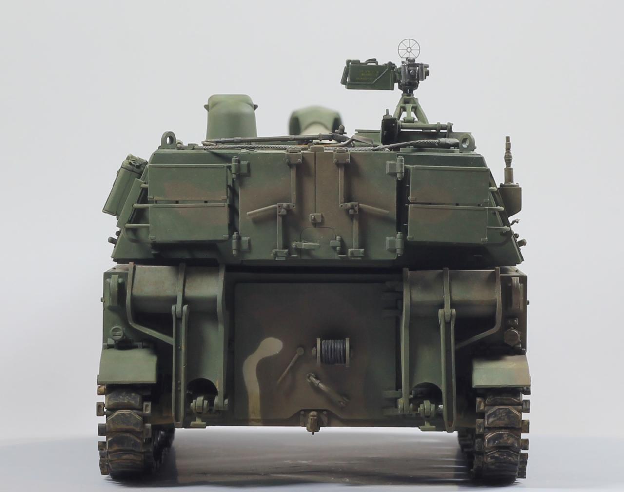 AFV사의 M109A2 킷으로 한국 육군 K55 버전으로 만들었습니다. 두 차량의 차이는 여러 점이 있겠으나, 안테나 마운트를 포탑 우측 후부로 이동시키는 정도만 하였고, 도색은 한국군 특유의 4색 위장무늬를 적용 했습니다.