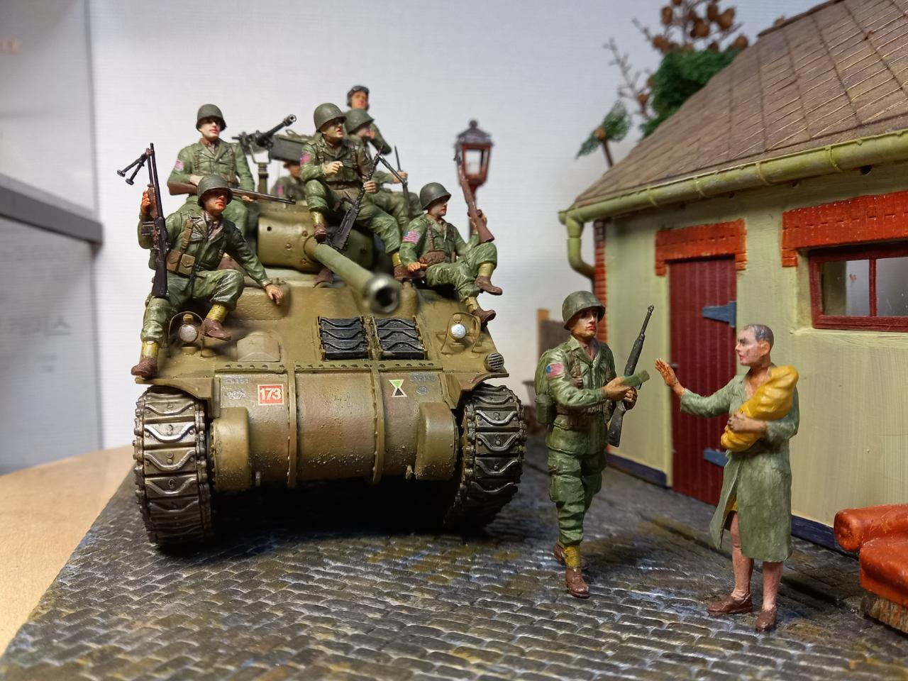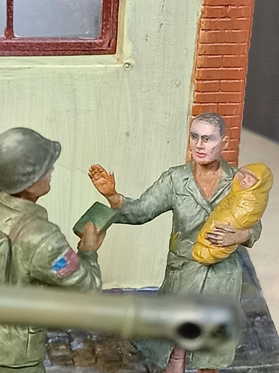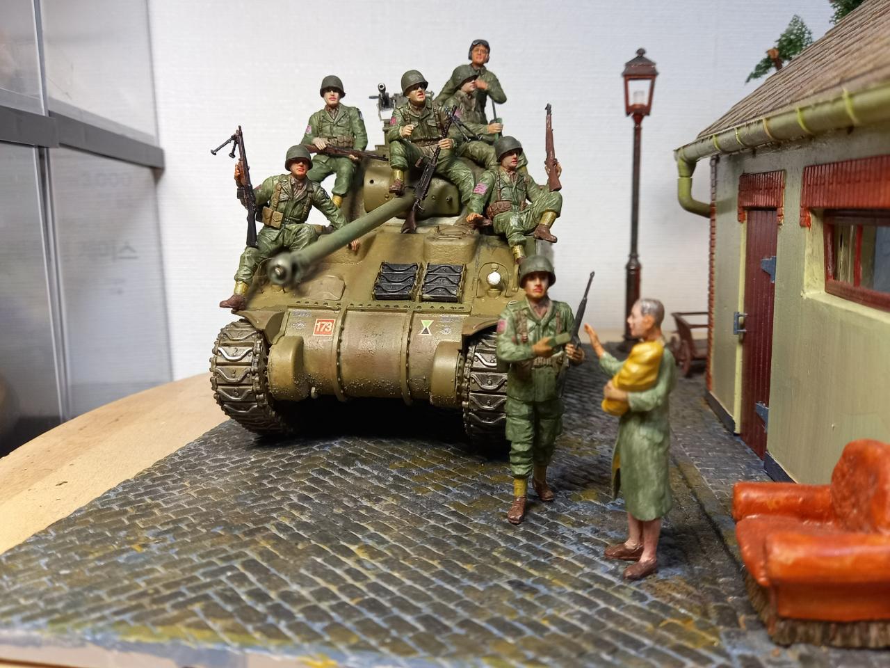 1944년 미국 101 공수부대가 영국탱크를 얻어타고 프랑스로 깊숙히 진격하는 장면입니다. 독일군의 현지 처 역할을 하다 수복 후 주민들에게 머리를 깎이는 린치를 당한 여인에게 먹을 것을 전달하는 씬을 연출하게 만들었습니다. 제품은 마스터 박스 인형 셋트입니다.