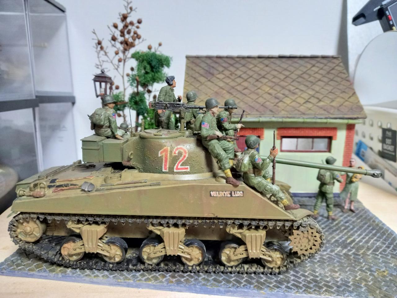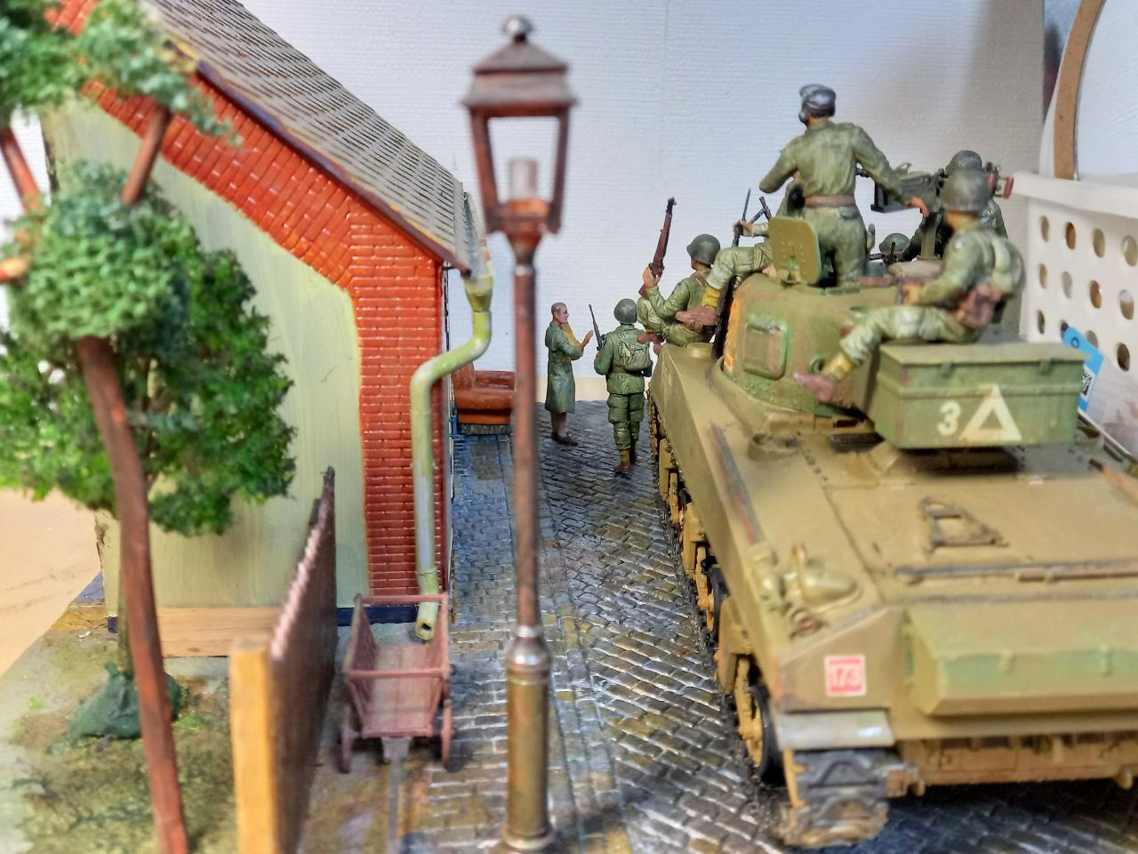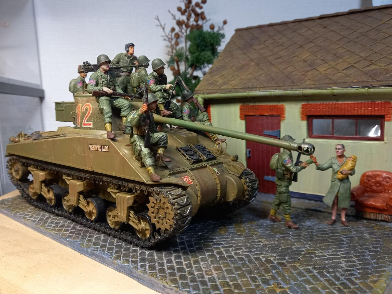 1944년 미국 101 공수부대가 영국탱크를 얻어타고 프랑스로 깊숙히 진격하는 장면입니다. 독일군의 현지 처 역할을 하다 수복 후 주민들에게 머리를 깎이는 린치를 당한 여인에게 먹을 것을 전달하는 씬을 연출하게 만들었습니다. 제품은 마스터 박스 인형 셋트입니다.