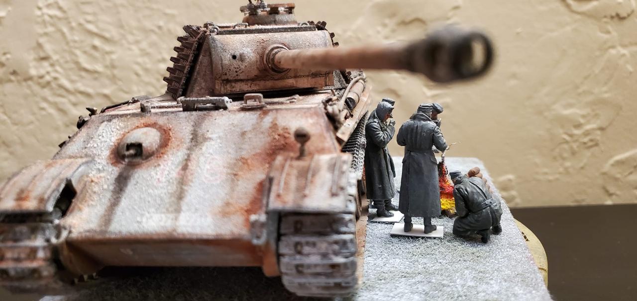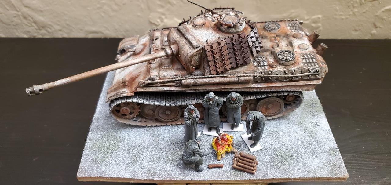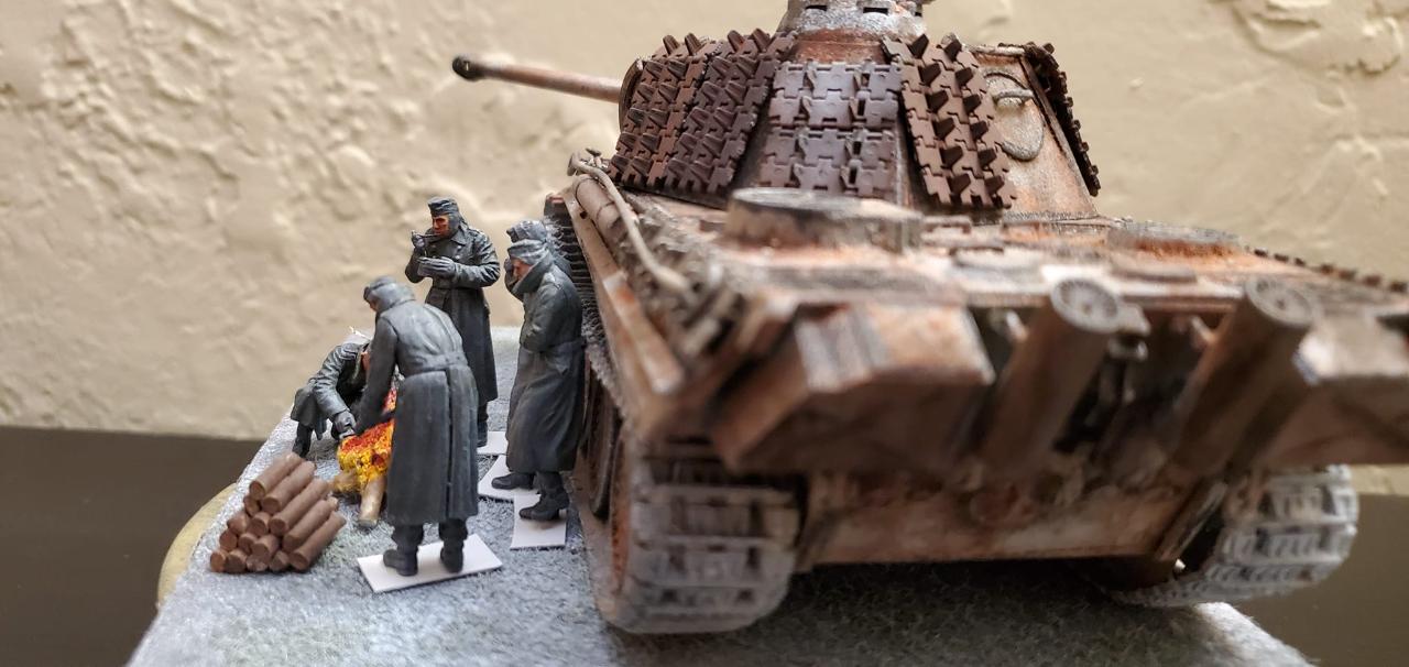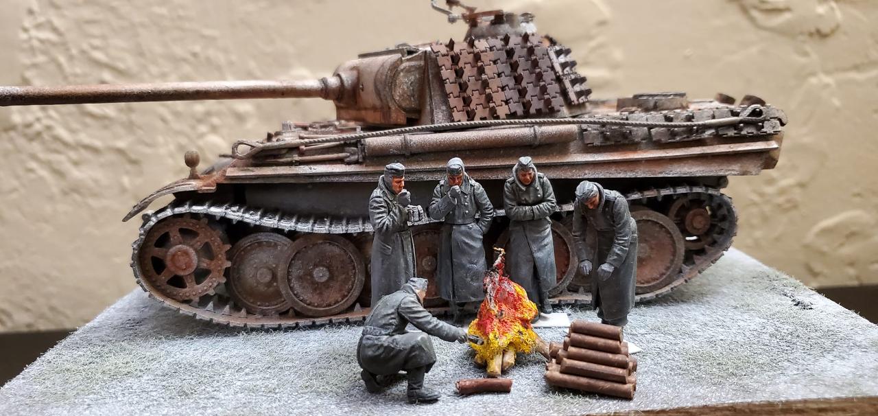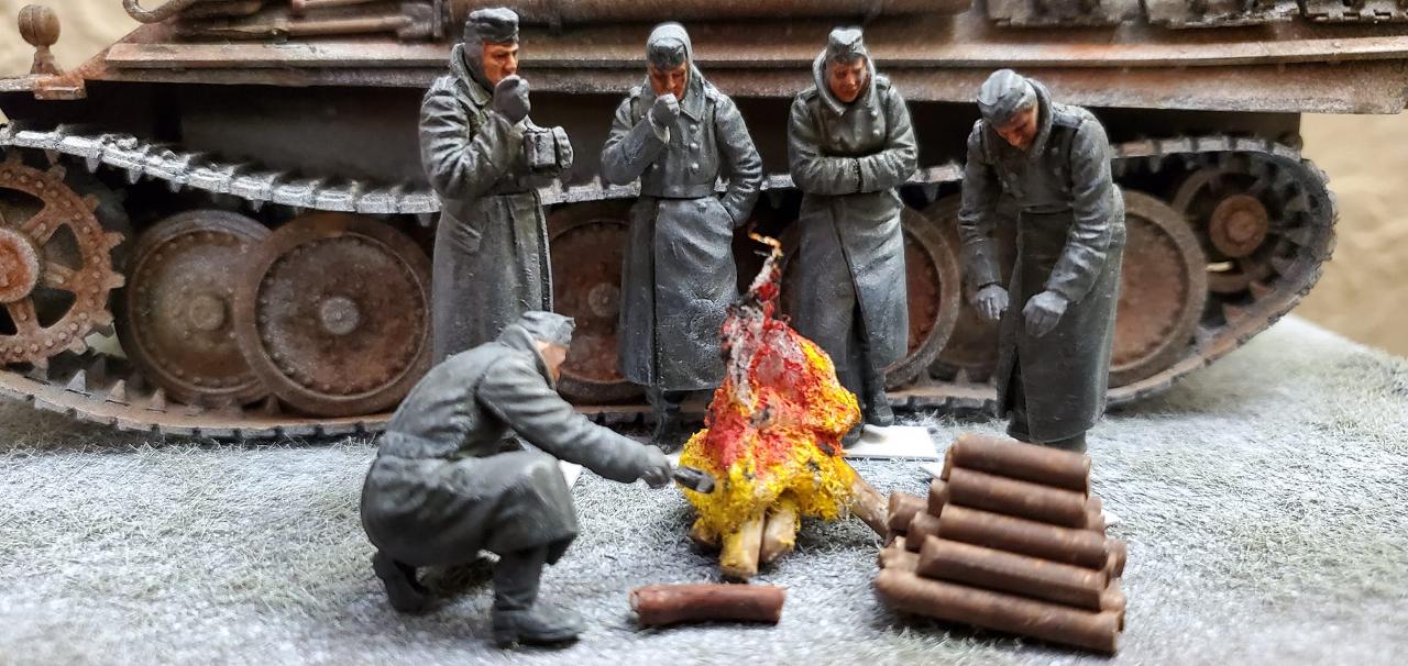 오늘 하루를 생존하고 나서 판터 전차 앞에서 불을 쬐고 있는 전차병들 입니다.. 모닥불은 자작이고 옆의 장작은 런너를 사용해서 만들었습니다