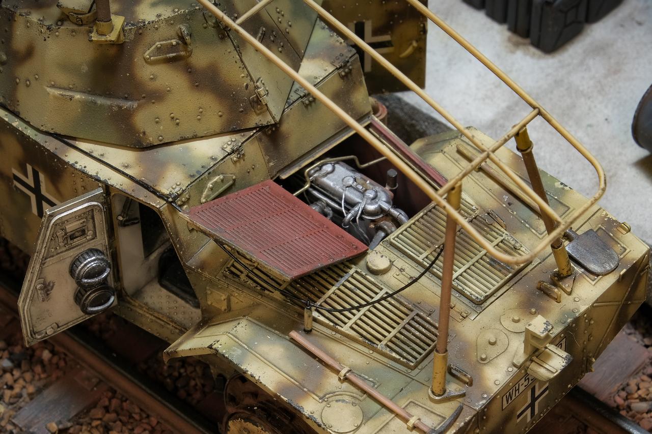 엔진실 내부에 플러그선, 연료파이프 라인을 추가 해주었고 특징적인 프레임 안테나와 차제를 연결해주는 통신선을 추가 해줬습니다.