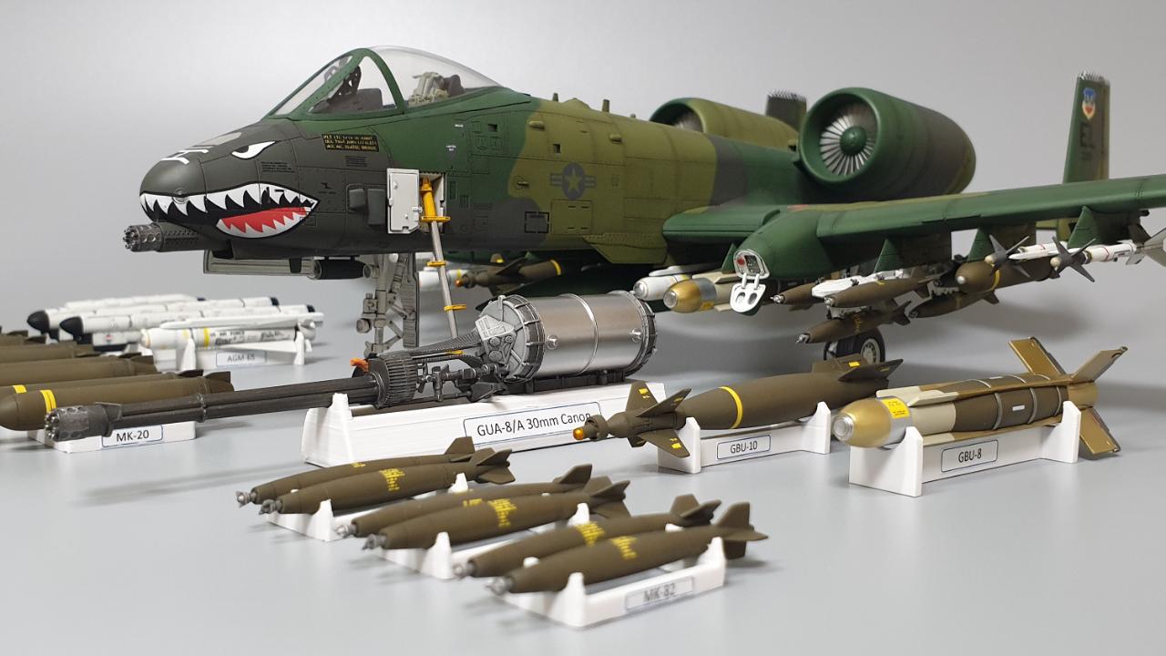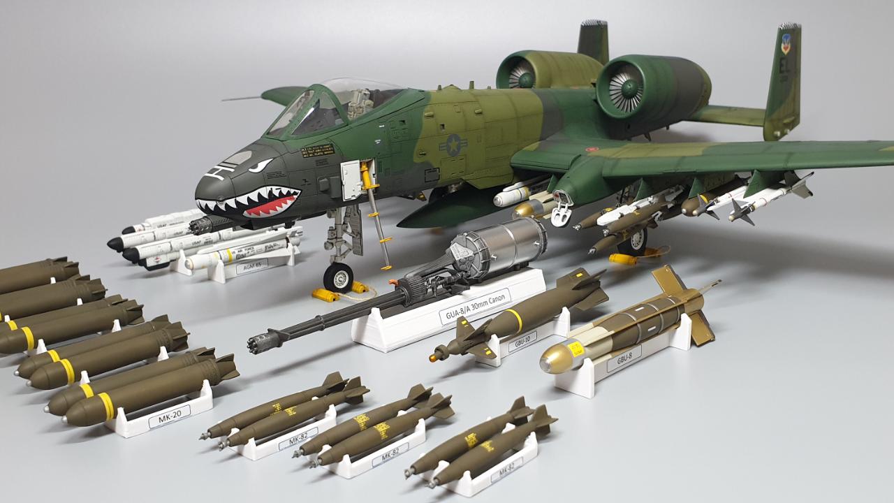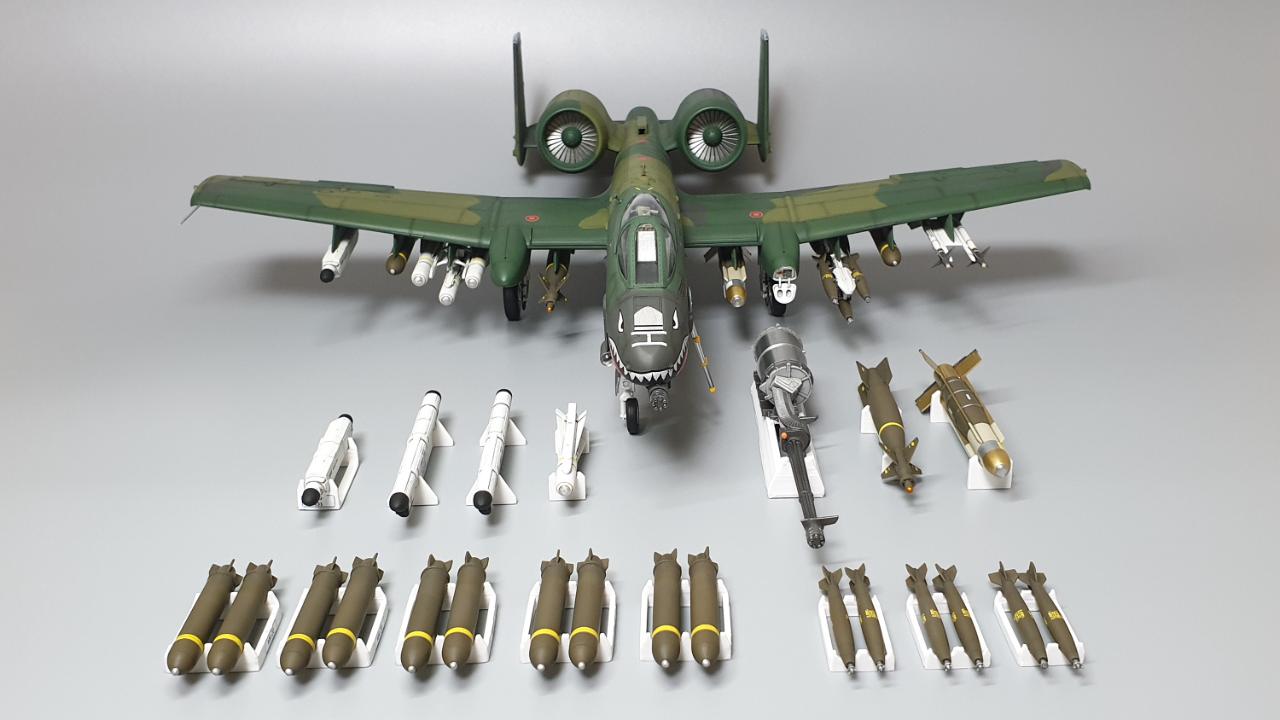 무장류 디테일은 좀 별로라서 사이드 와인더는 다른키트에서 남은걸로 대체 했구요, 기체에 탑재되지 않는 여분의 무장류도 3D 프린팅으로 거치대를 제작해서 마치 에어쇼 행사장에 야외 전시처럼 구성해 보았습니다.