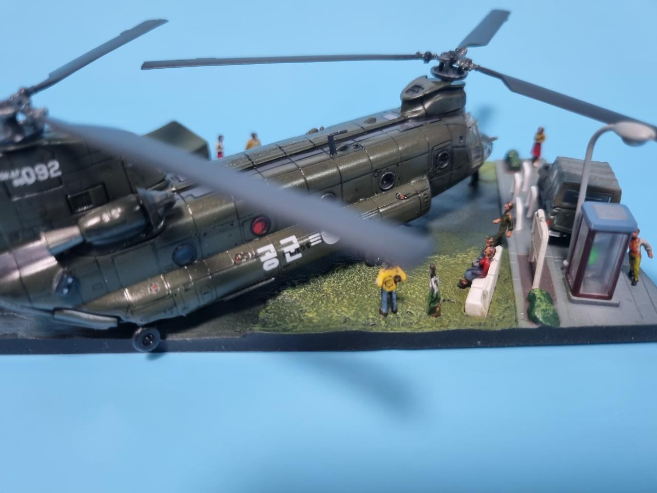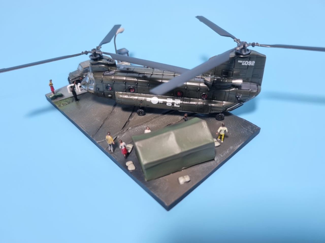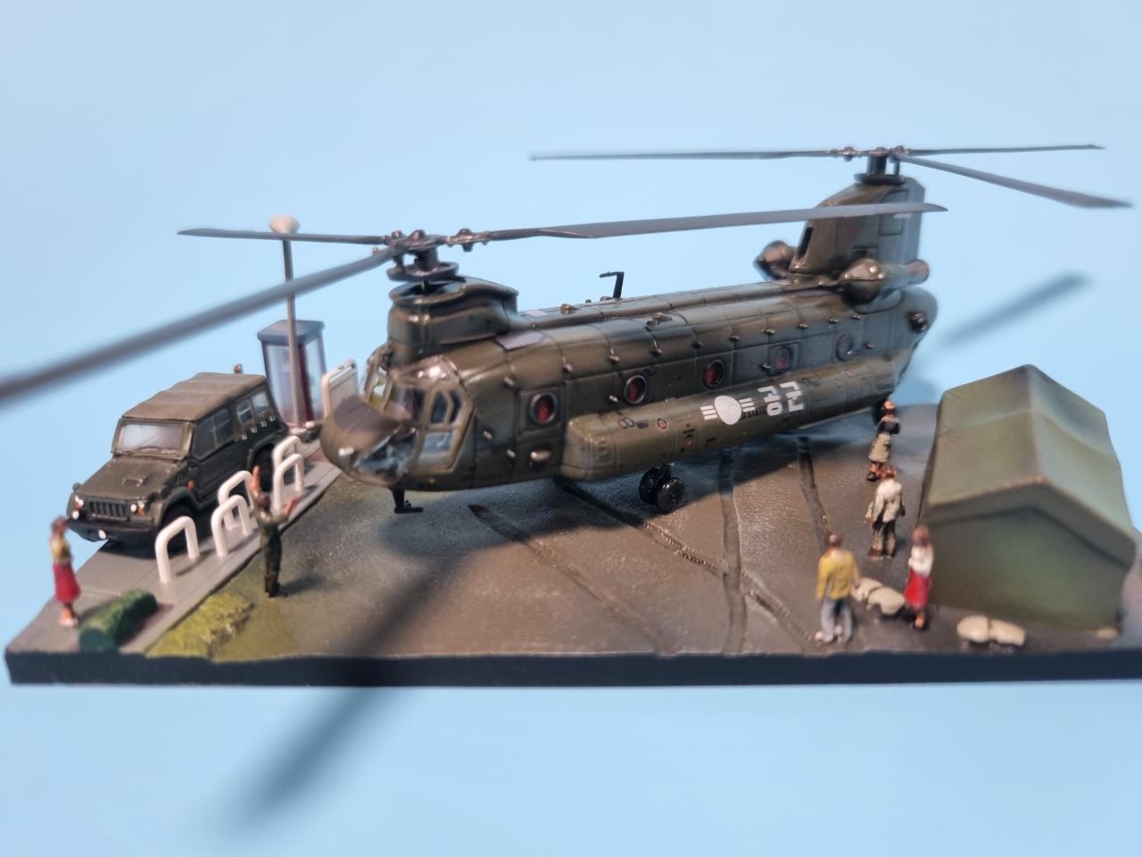 1/144 스케일로 CH-47D 치누크 한국공군형으로 작은 이재민 구호활동 디오라마를 만들어 봤습니다. 치누크는 마감제를 반광으로 하니 완성한지 얼마안되서 그런가 유광같아 보입니다. ㅠㅠ