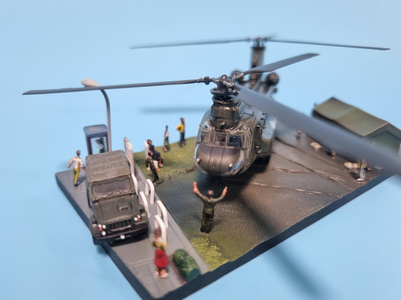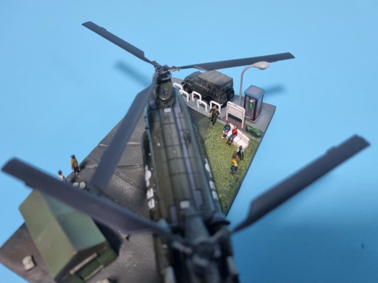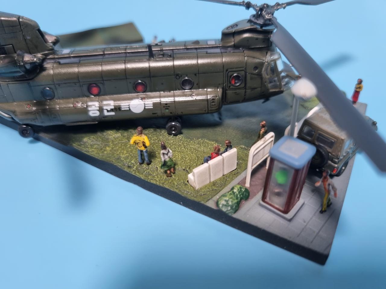 1/144 스케일로 CH-47D 치누크 한국공군형으로 작은 이재민 구호활동 디오라마를 만들어 봤습니다. 치누크는 마감제를 반광으로 하니 완성한지 얼마안되서 그런가 유광같아 보입니다. ㅠㅠ