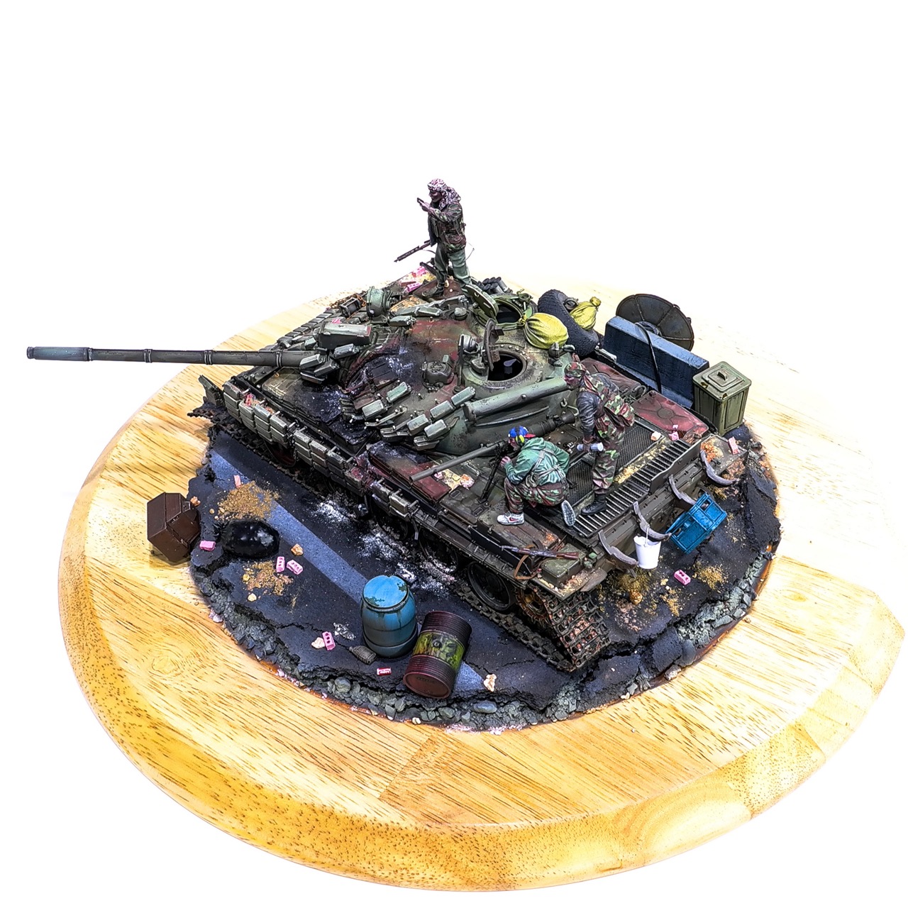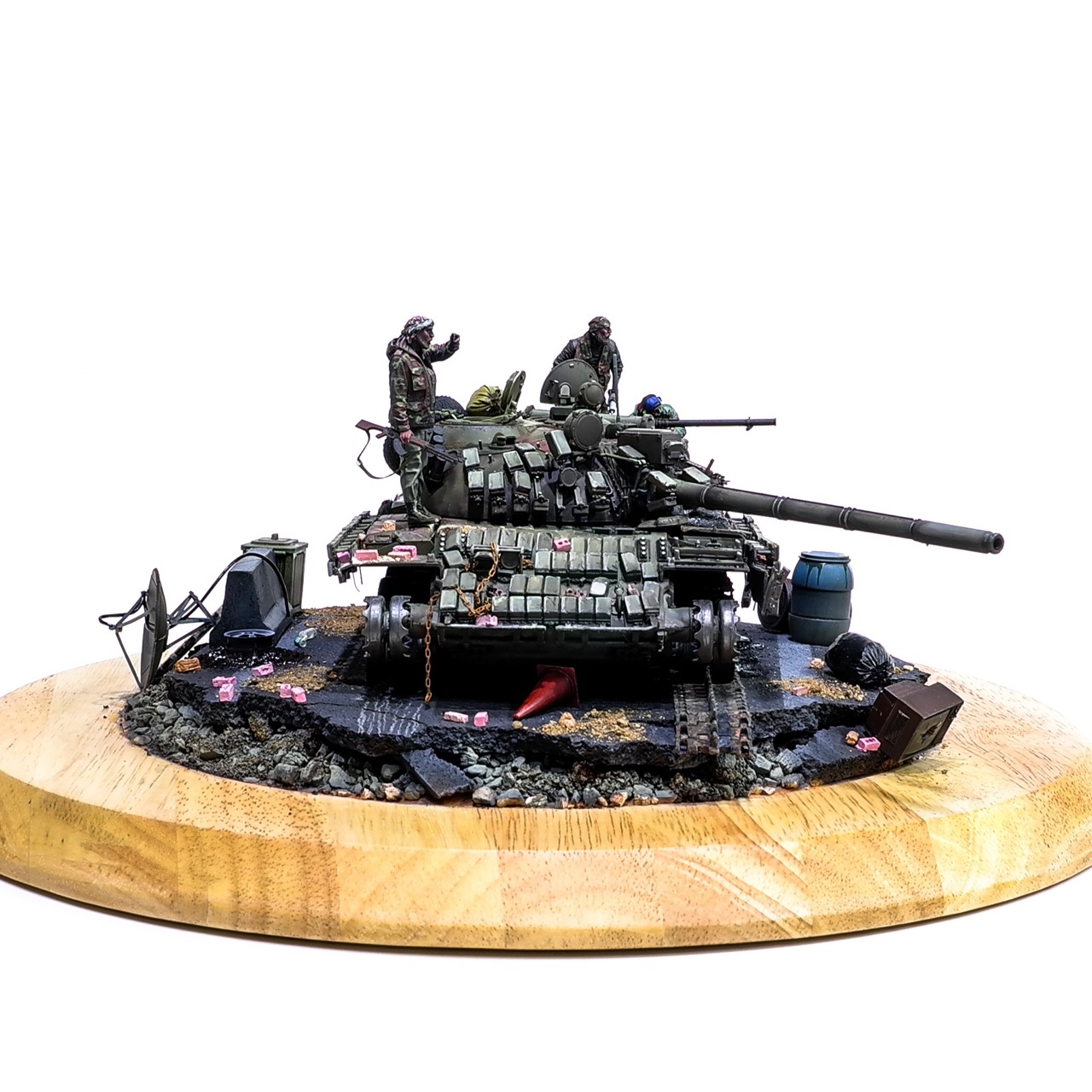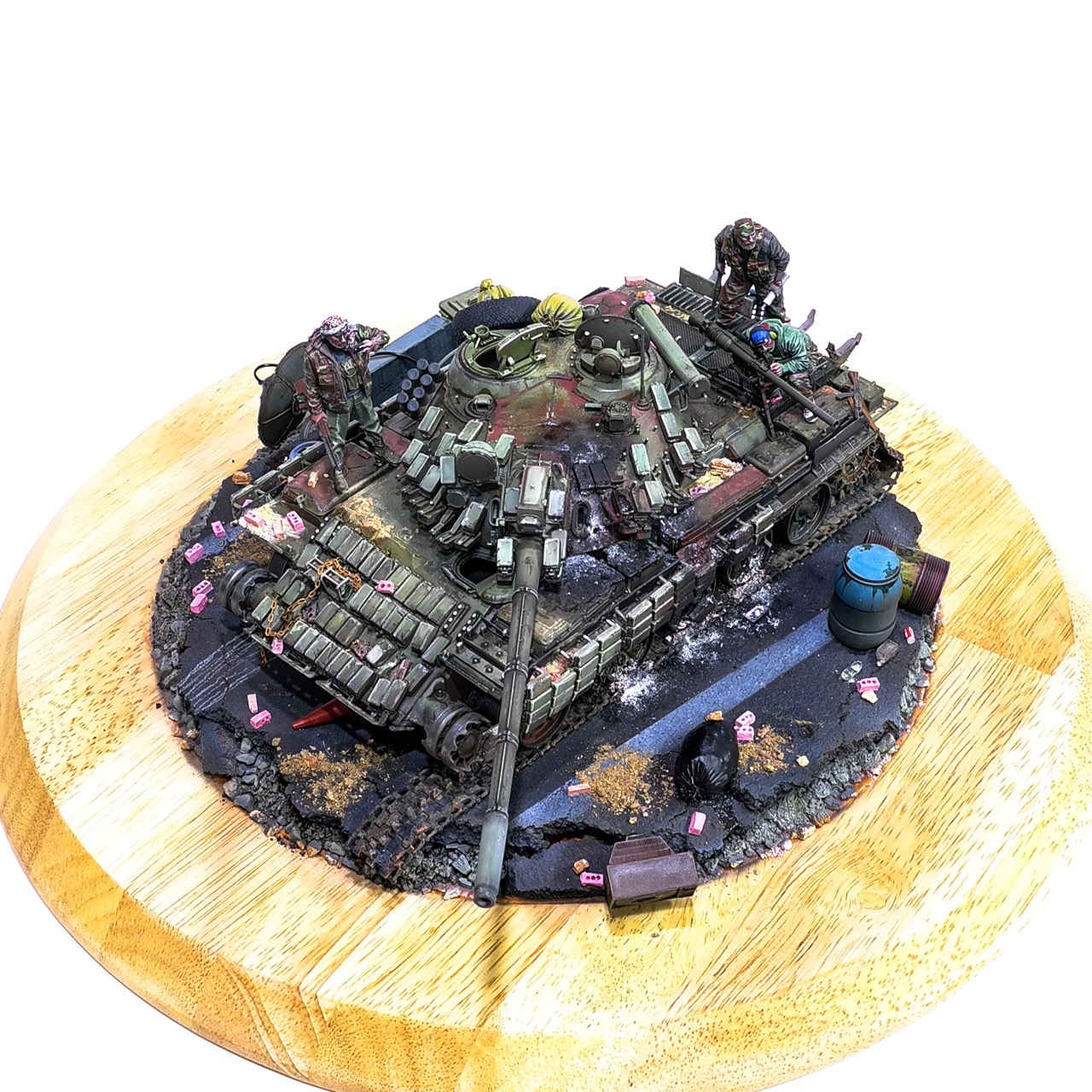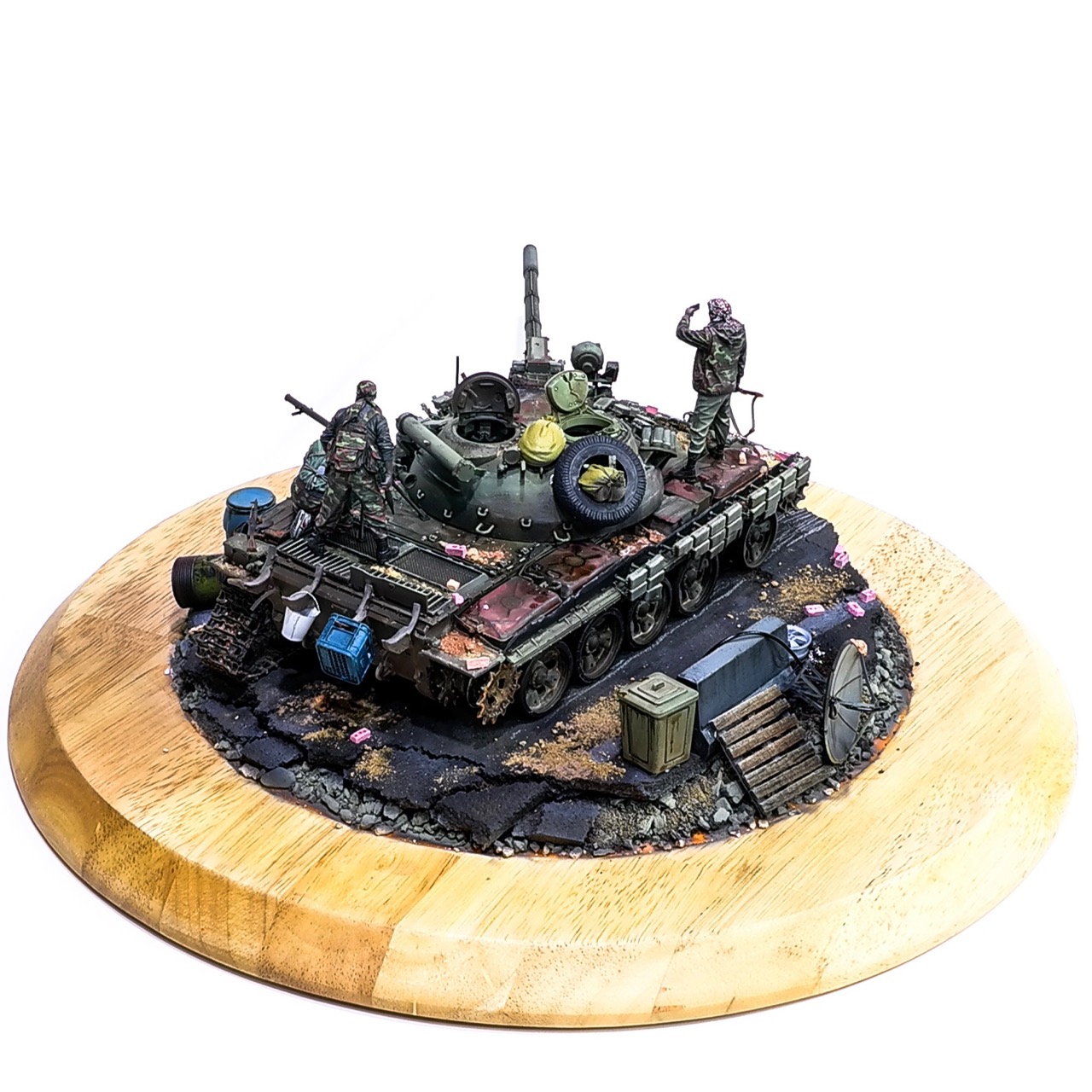 예전에 좀 썰렁하게 마무리 하기도 했고, 불에 탄 부분이 전체 색감을 잡아먹어서 마음에 들지 않던 작업이었는데 올해 다시 작업을 하였습니다. 전체 필터링, 하이라이트 작업을 다시하고 악세사리들도 추가하여 완성하였습니다..Takom사의 T-55, 인형들은 evolution사의 인형들. 시리아를 배경으로 작업하였습니다.